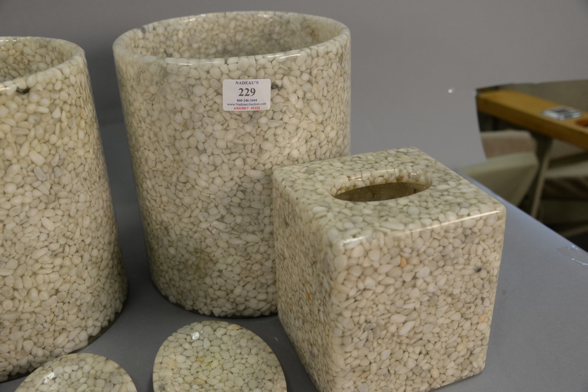 Lot 229: Two Labrazel Luxury Bath white pebble bathroom sets consisting of two waste cans ht. 11in., two tissue holders ht. 6in., and two…