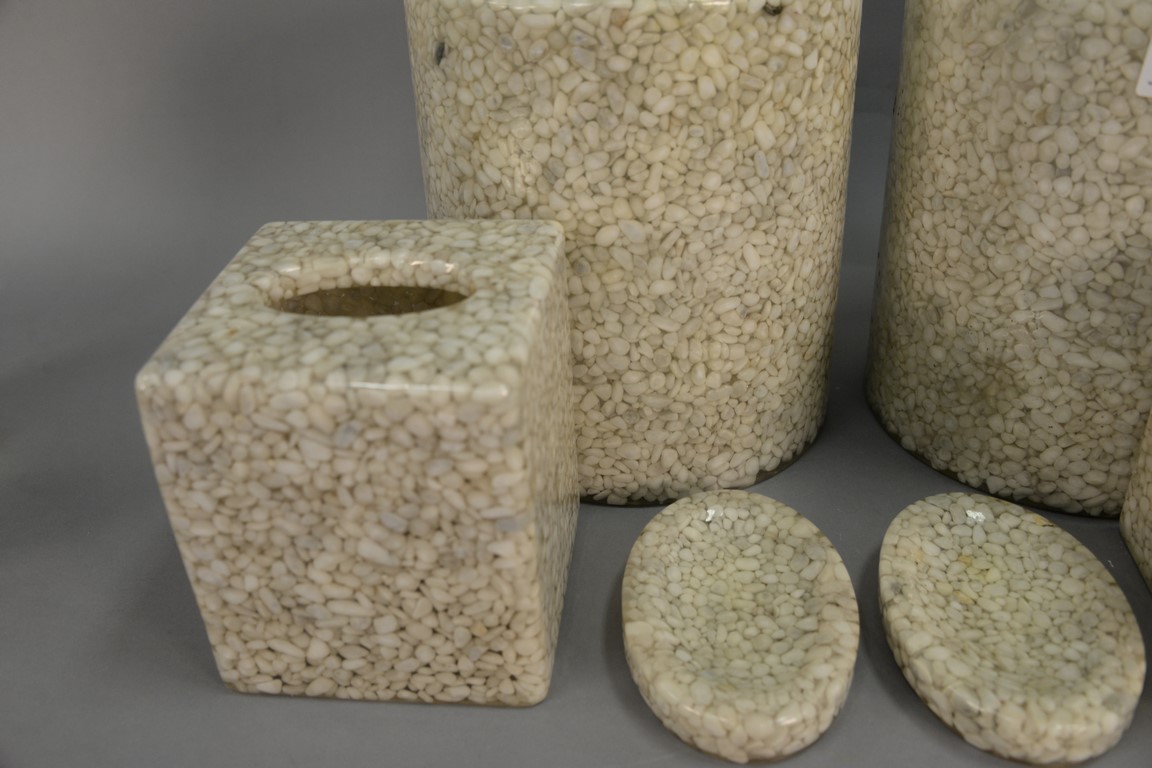 Two Labrazel Luxury Bath white pebble bathroom sets consisting of two waste cans ht. 11in., two tissue holders ht. 6in., and two soap dishes lg. 5 1/2in.