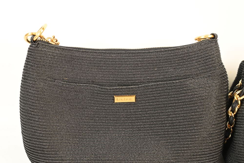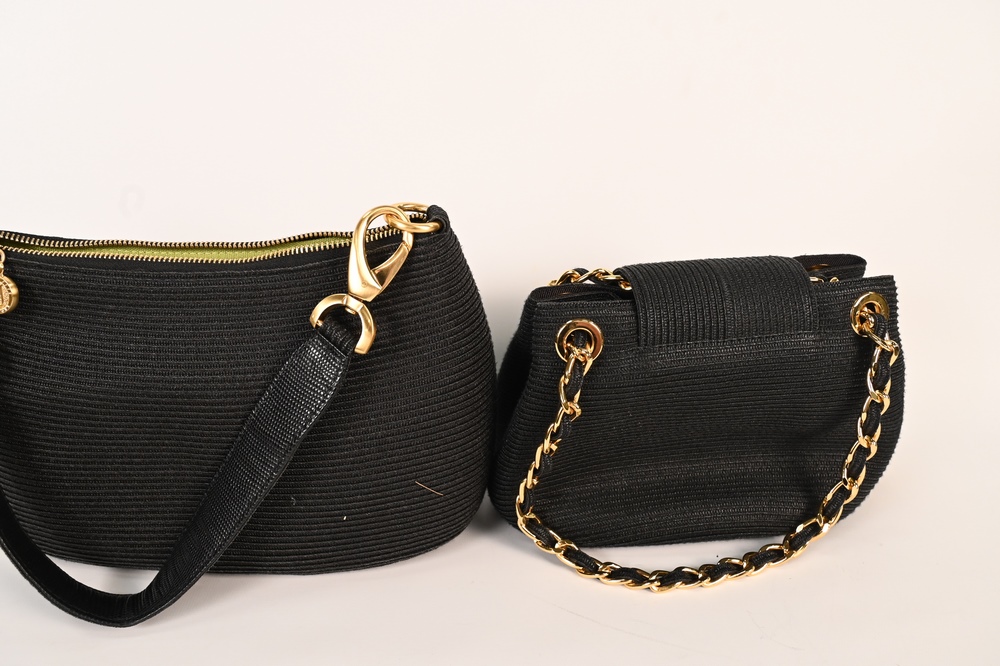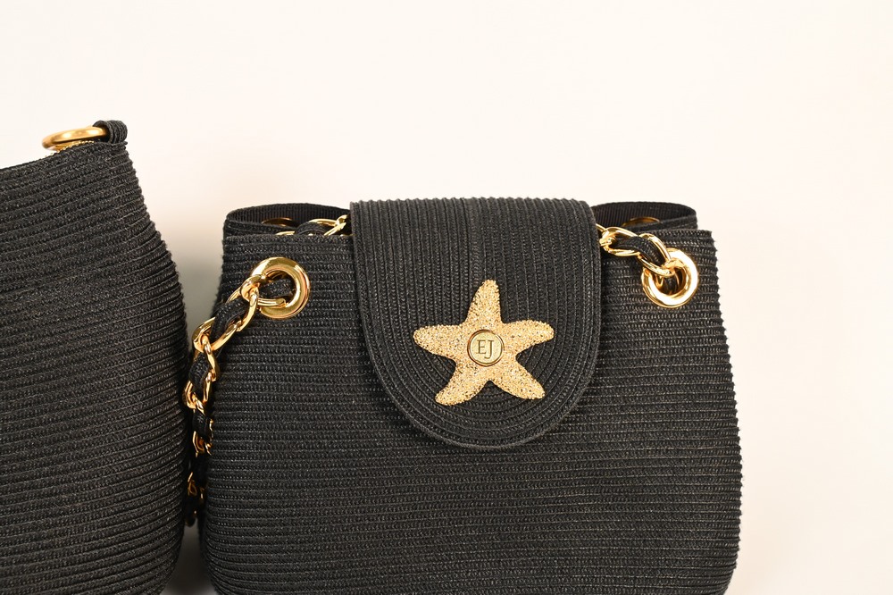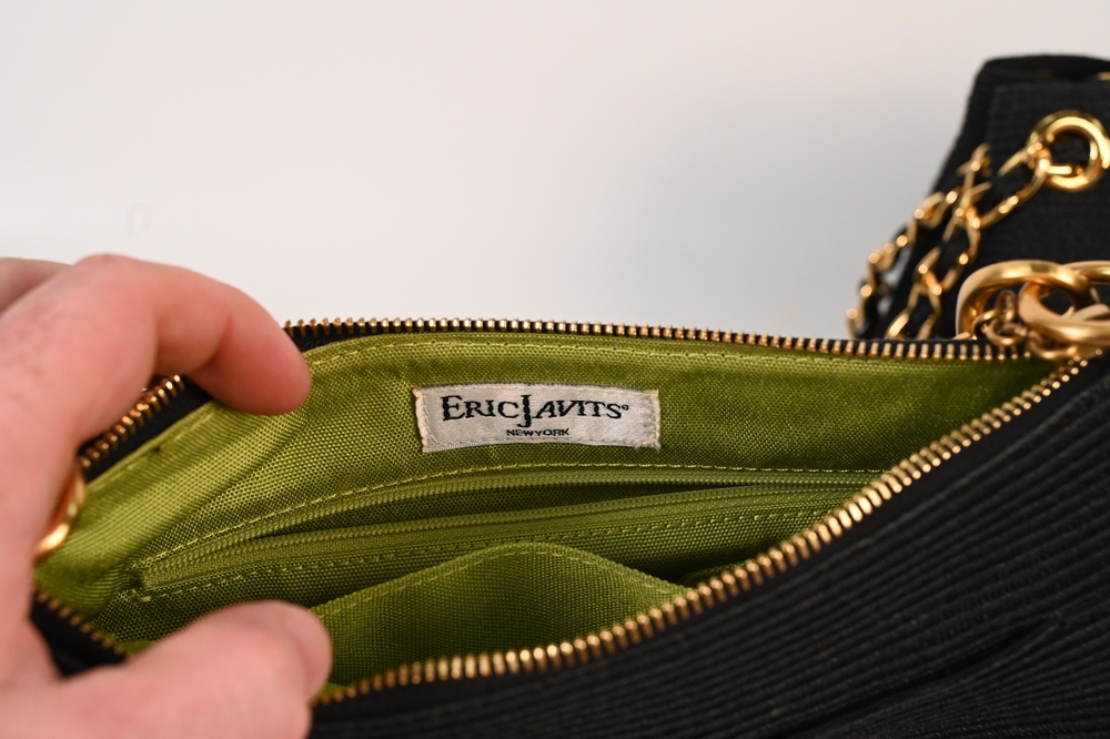 Two Piece Lot, to include a Eric Javits wicker starfish “Mini Squishee” handbag, blade man made wicker fabric starfish mini with bright yellow interior, two compartments, gold tone hardware and adjustable chain handle, along with a black wicker fabric single handle handbag with green interior, both bags like new, starfish height 6 1/2 inches, width 8 inches, depth 2 1/2 inches.