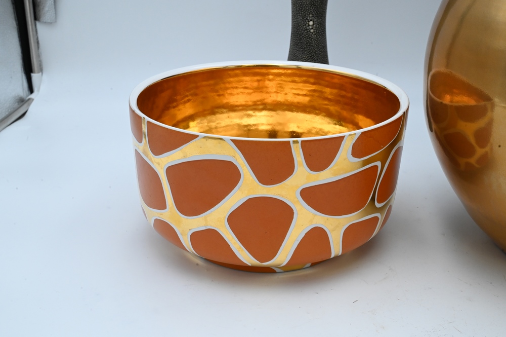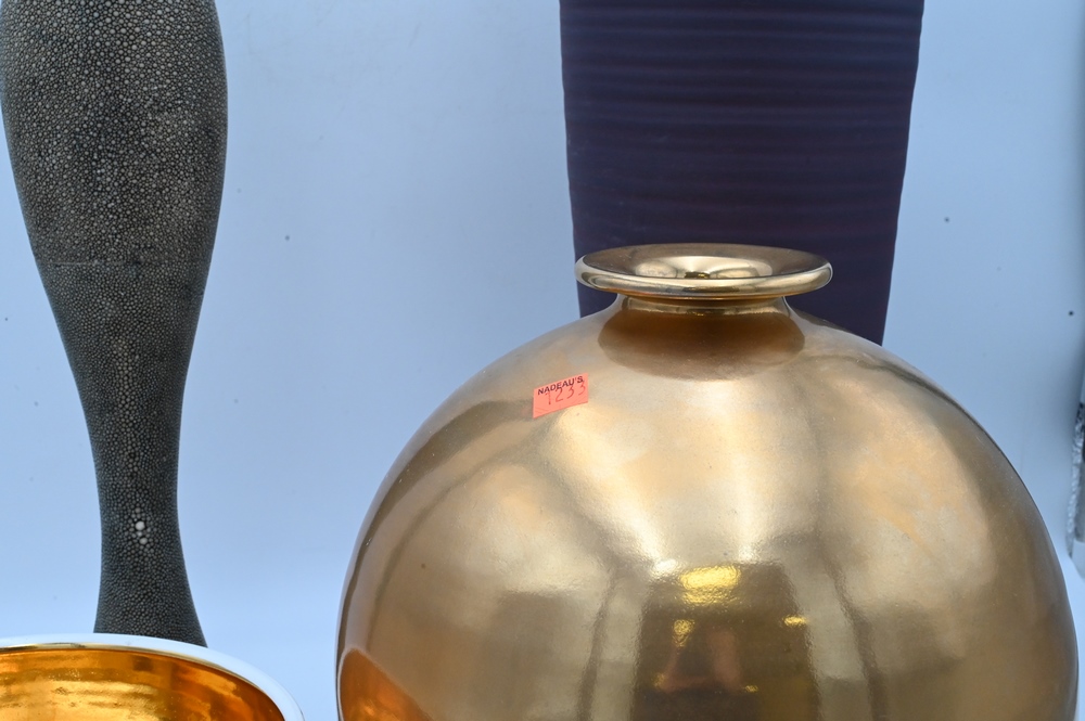 Lot 23: Four Piece Group of Vases, to include a Waylande Gregory bowl with gilt; large Rina Menardi pottery vase; gilt bulbous vase initialed on bottom; along with a Shagreen vase by Ray Augousti, Paris; tallest piece 24 inches.