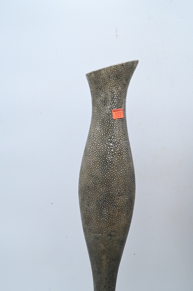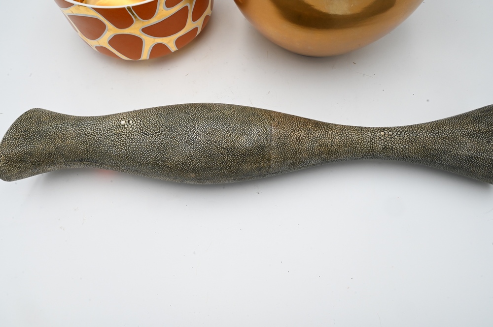 Four Piece Group of Vases, to include a Waylande Gregory bowl with gilt; large Rina Menardi pottery vase; gilt bulbous vase initialed on bottom; along with a Shagreen vase by Ray Augousti, Paris; tallest piece 24 inches.