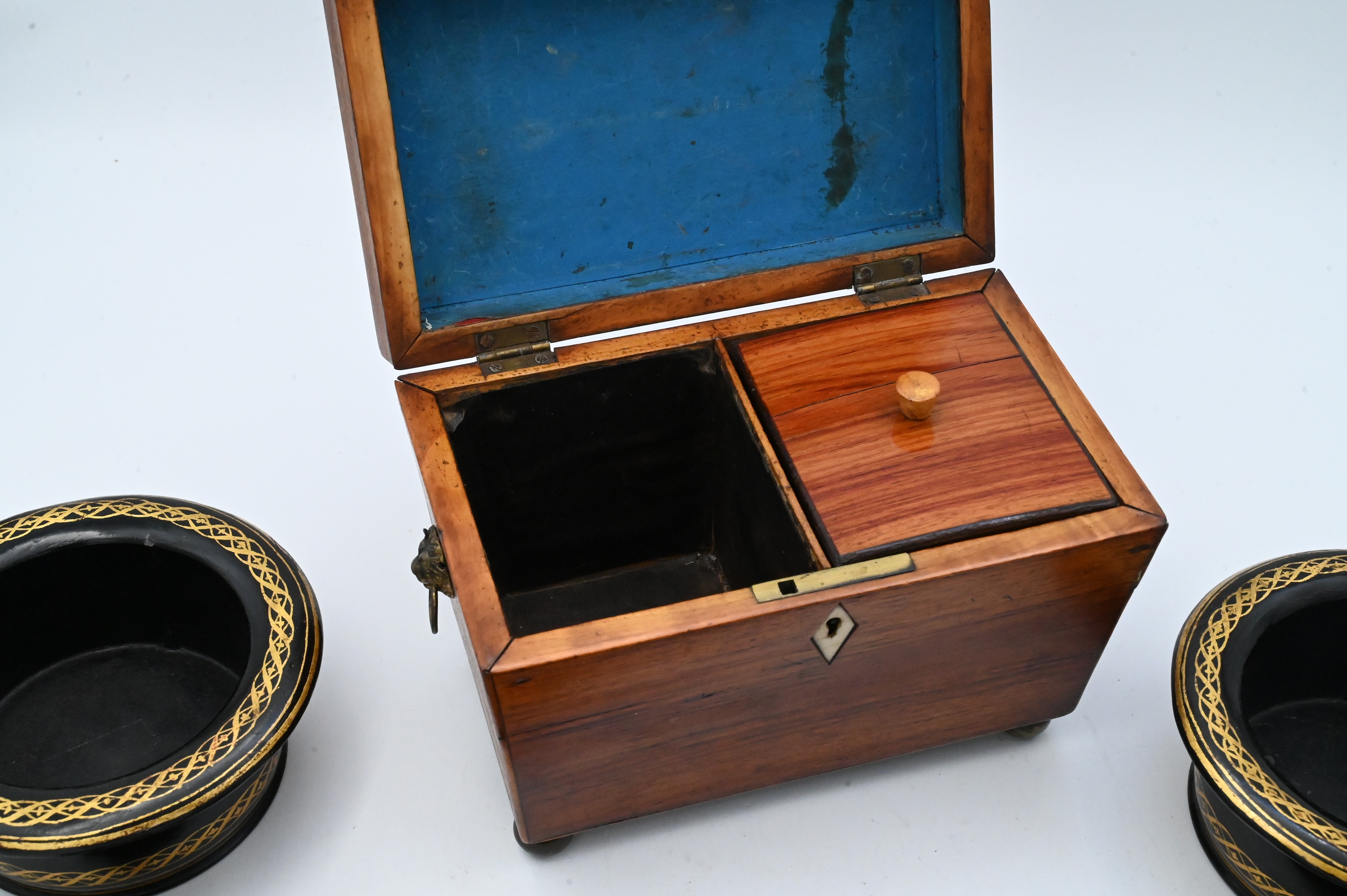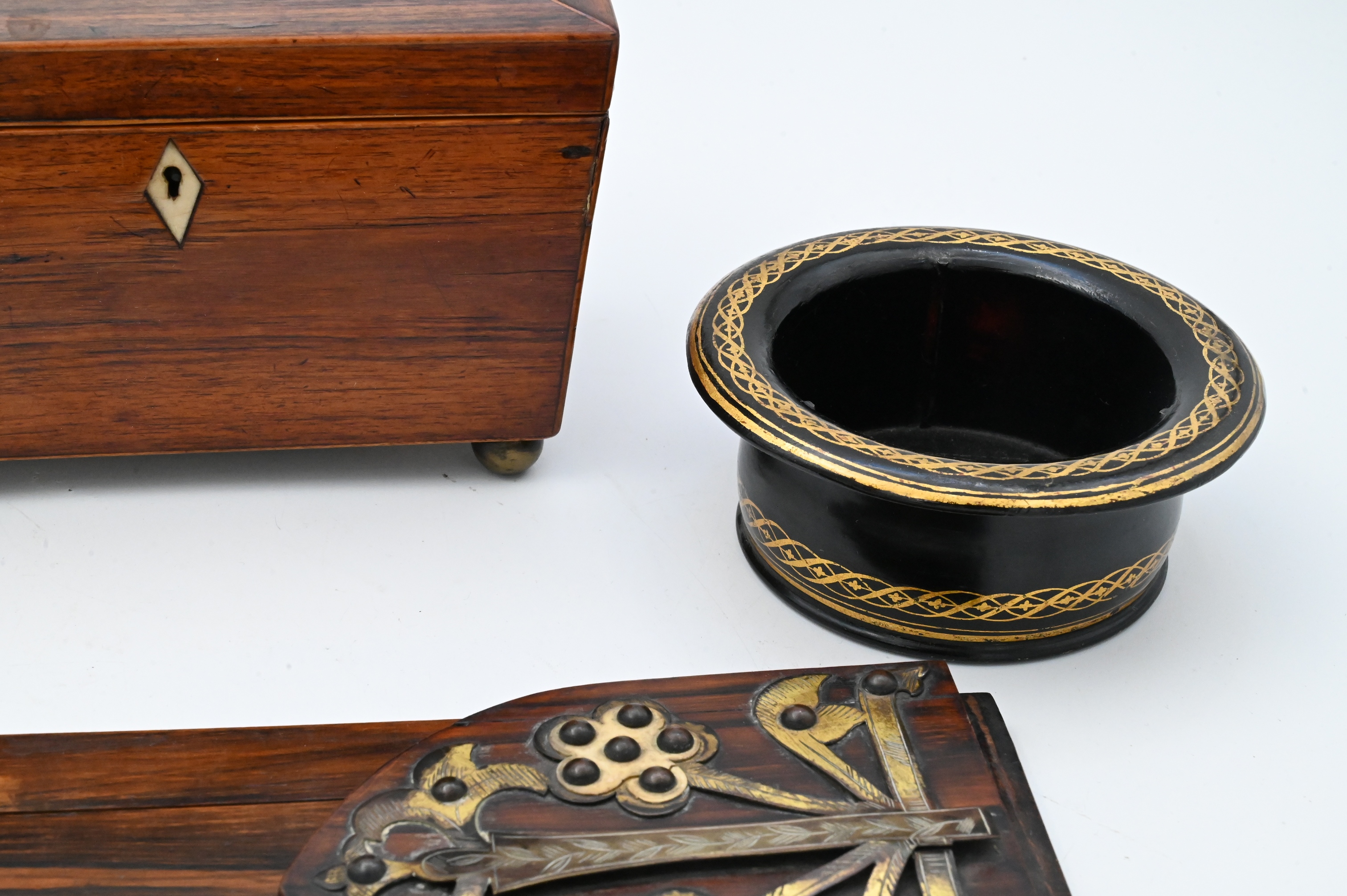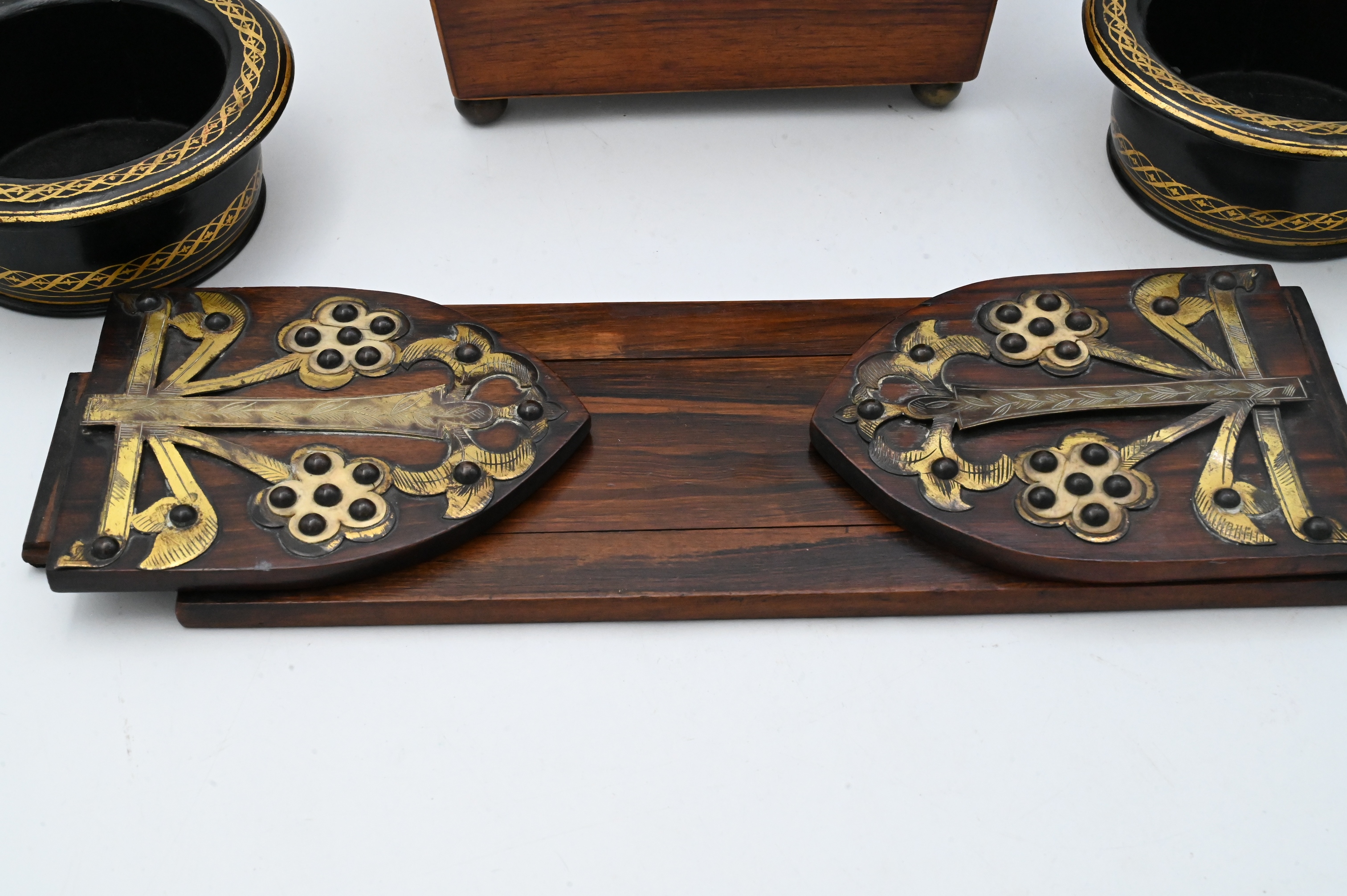 English satin wood coffin form inlaid tea caddy having lion mask handles over ball feel, opening to two compartments, a pair of Regency lacquered papier mache and gilt wine coasters along with Gothic revival extending bookend with metal mounts
