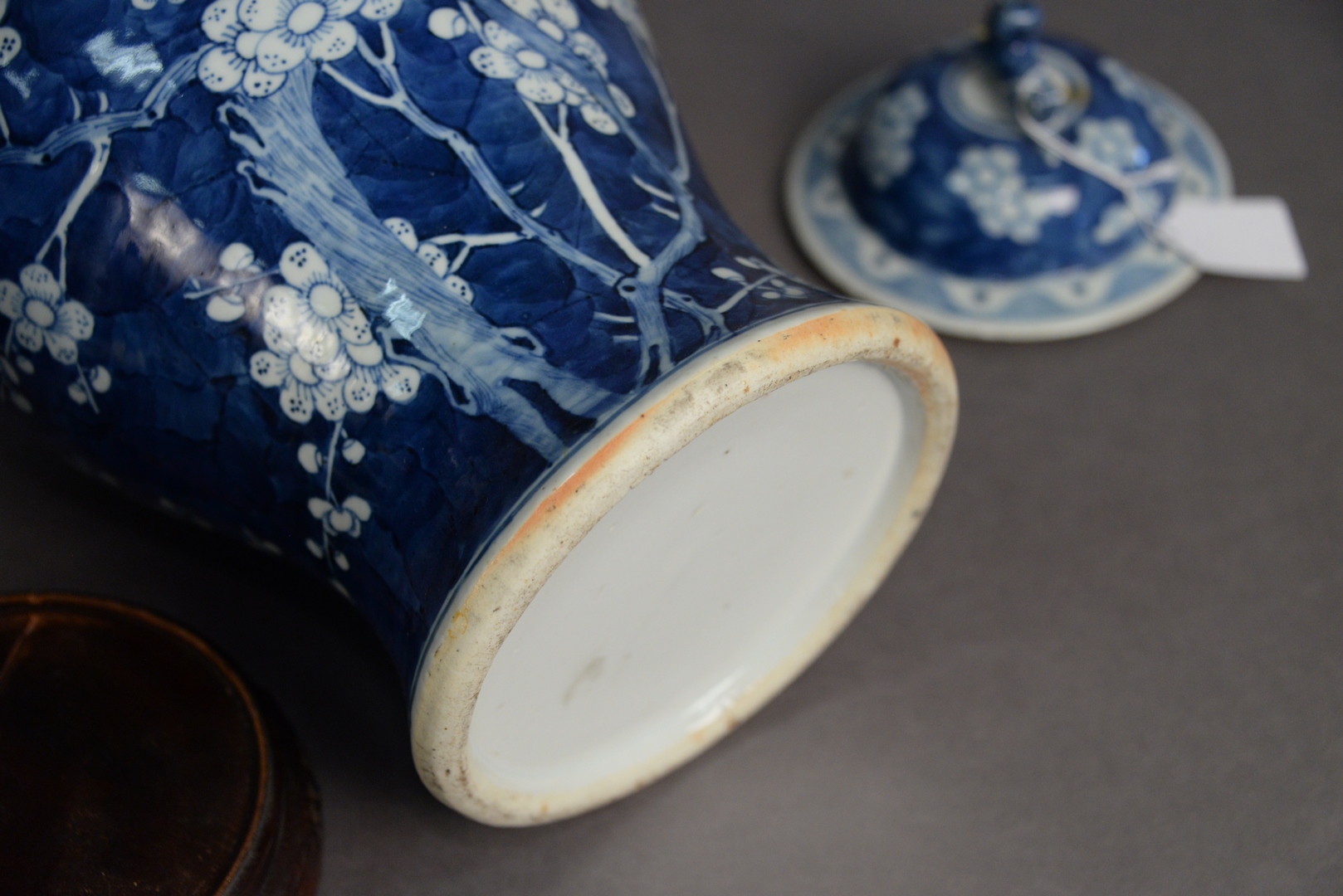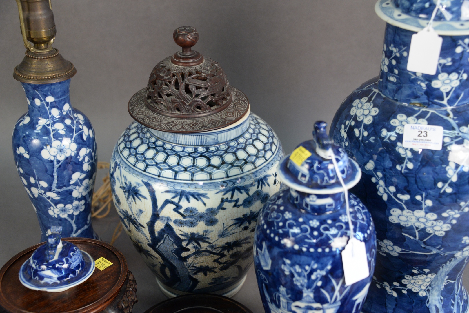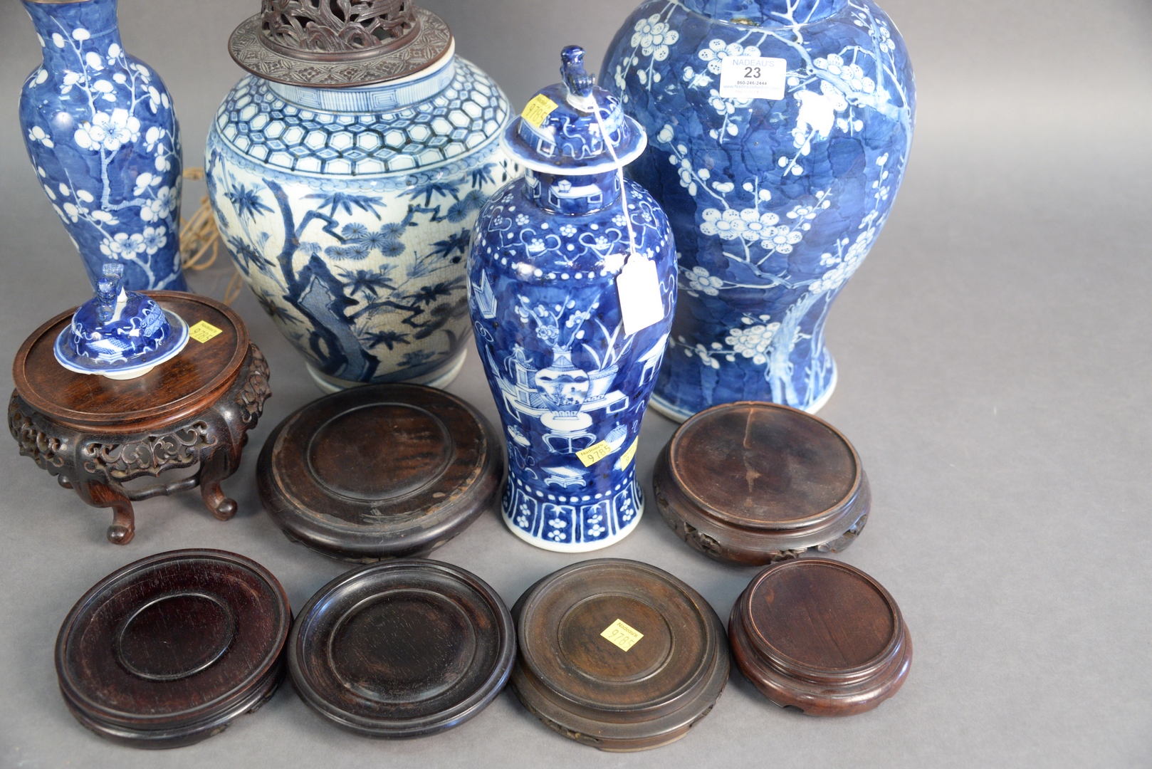 Lot 23: Four Pieces of Chinese Blue and White Porcelain to include two covered vases, a blue and white vase made into table lamp, one vase with wooden cover, along with seven wood bases, tallest height 18 1/2 inches.