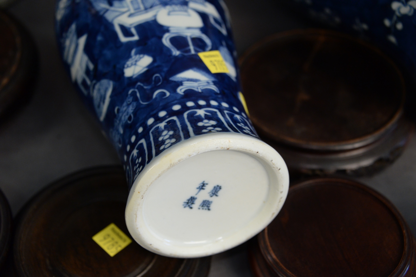 Four Pieces of Chinese Blue and White Porcelain to include two covered vases, a blue and white vase made into table lamp, one vase with wooden cover, along with seven wood bases, tallest height 18 1/2 inches.