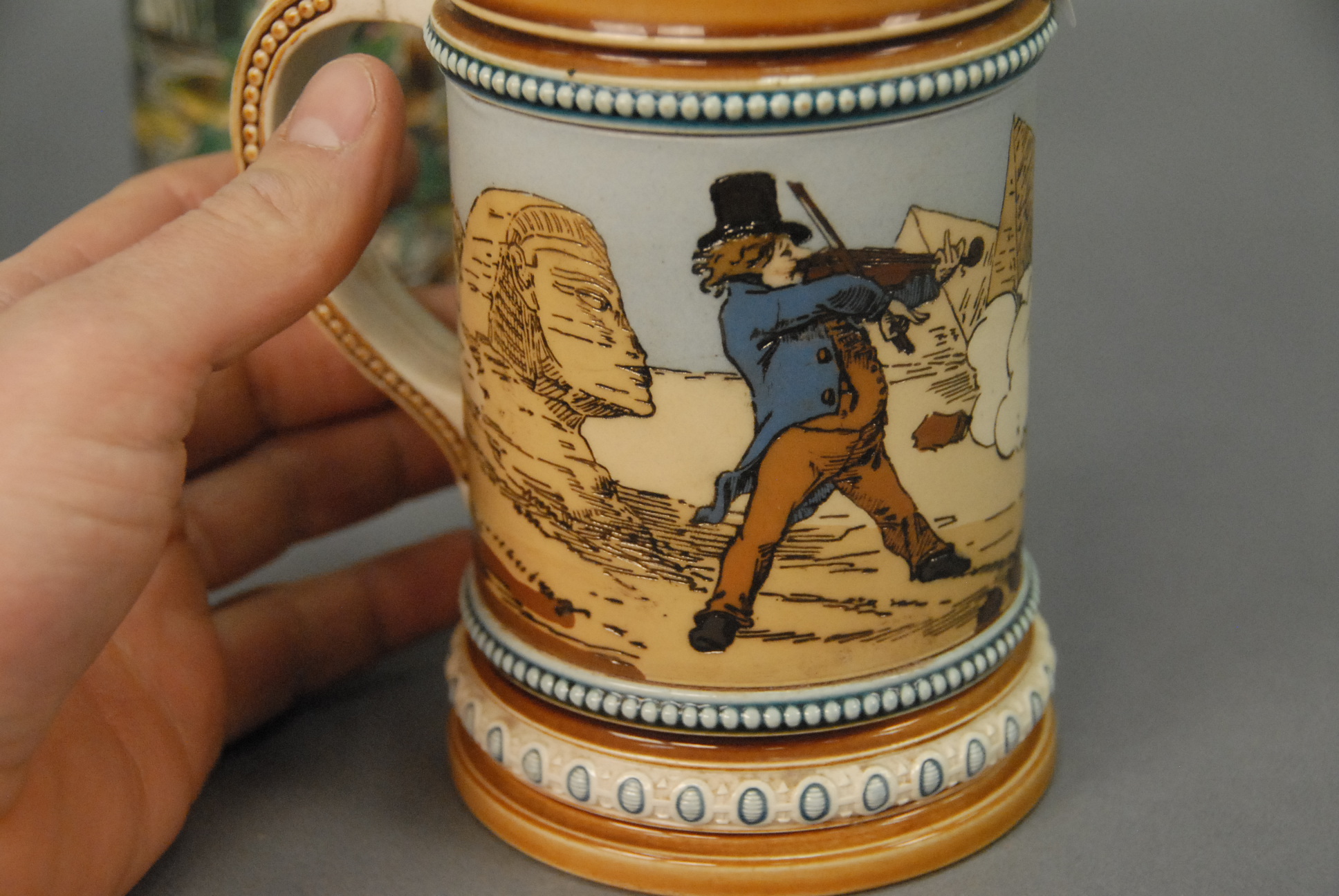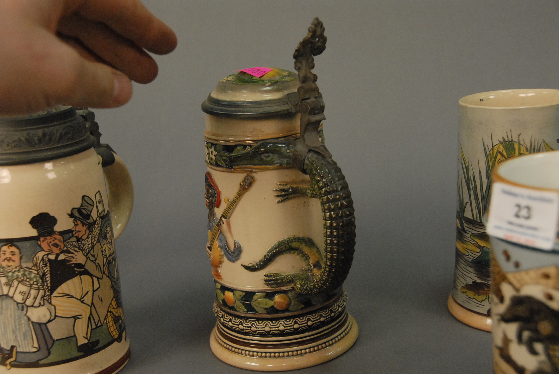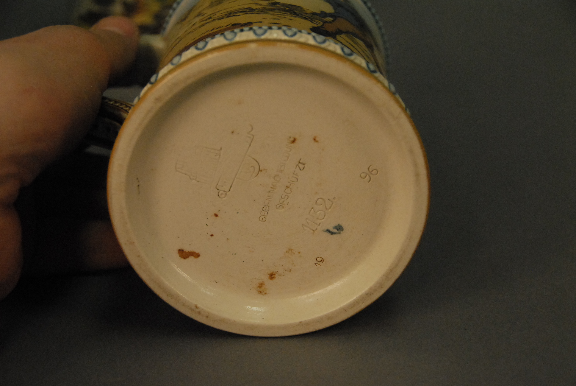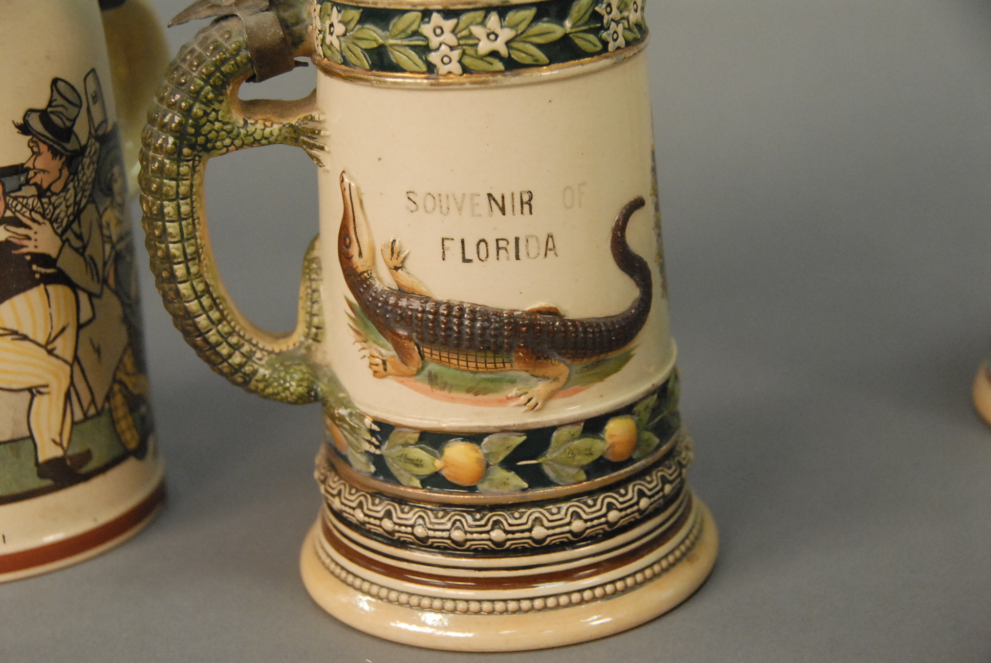 Four steins including one Mettlach, one FLA souvenir, and one with crack.
