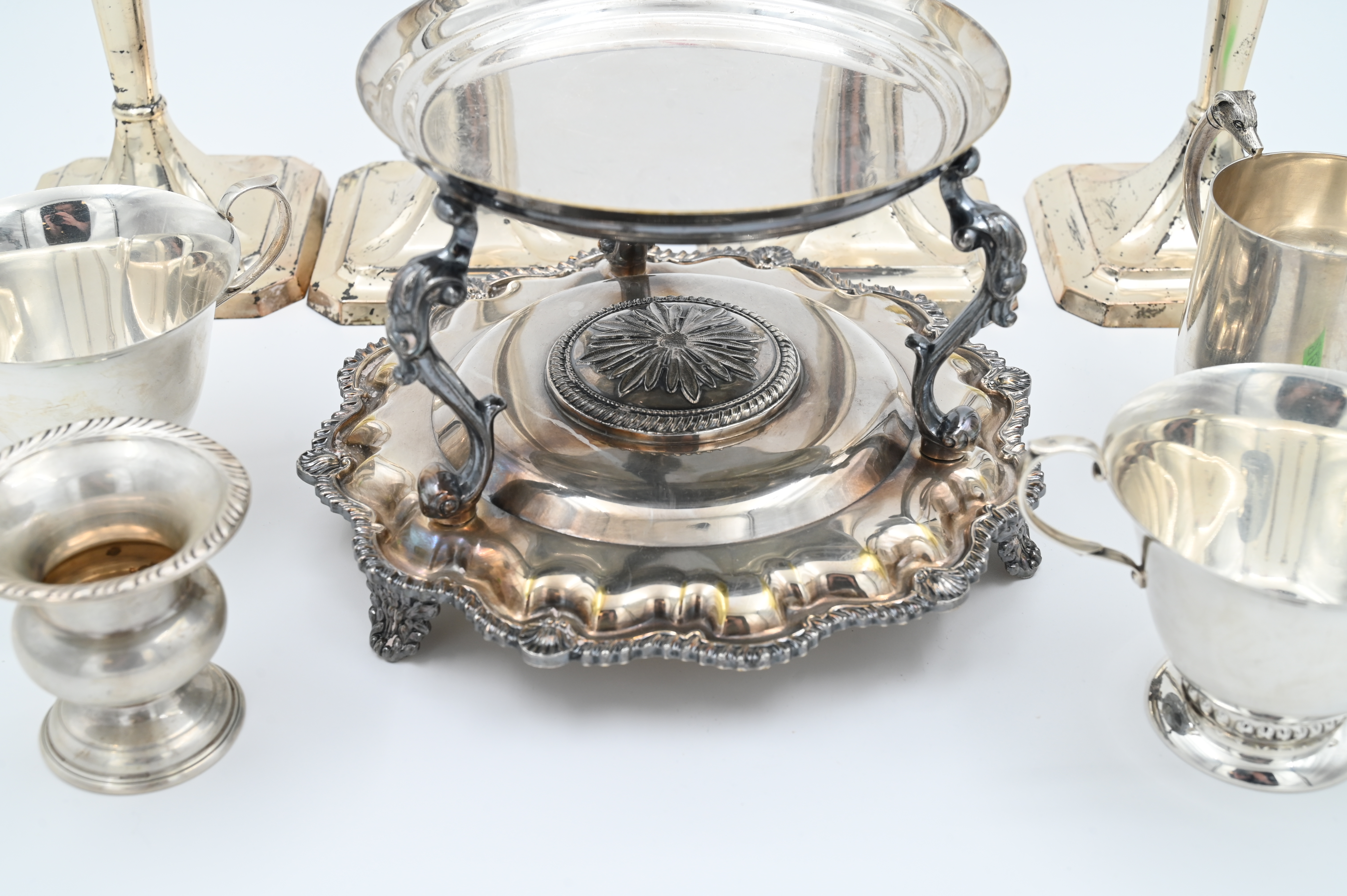 Four Sterling Silver Weighted Candlesticks with Four Small Pieces and a Silver Plated Two Tier Dish