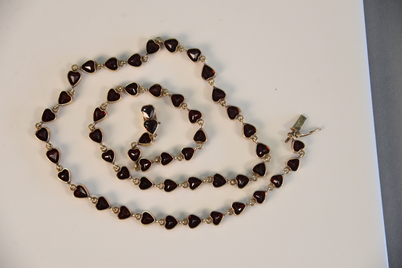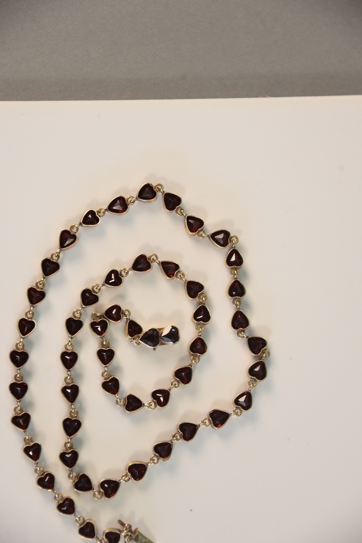 Lot 23: Gold Necklace set with heart shaped garnets length 18 1/2 inches, total weight 18.5 grams Provenance: From the Lance & Irma Keller …