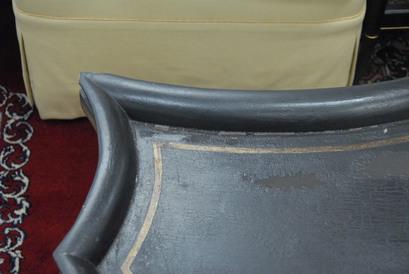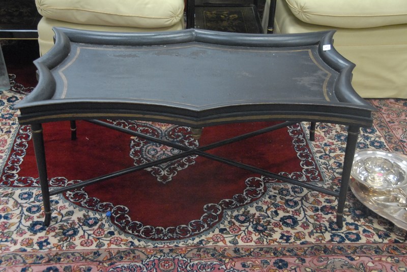 Maison Jansen style coffee table, tray form with shaped black with gold decoration, ht. 20in. lg. 43in.