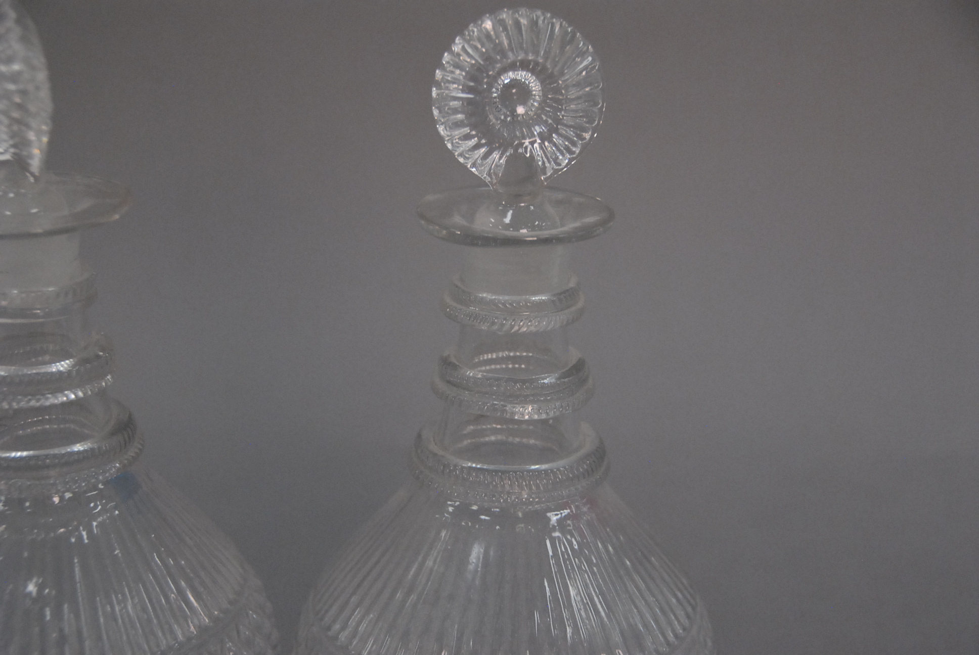 Pair of early blown glass decanters and stoppers.