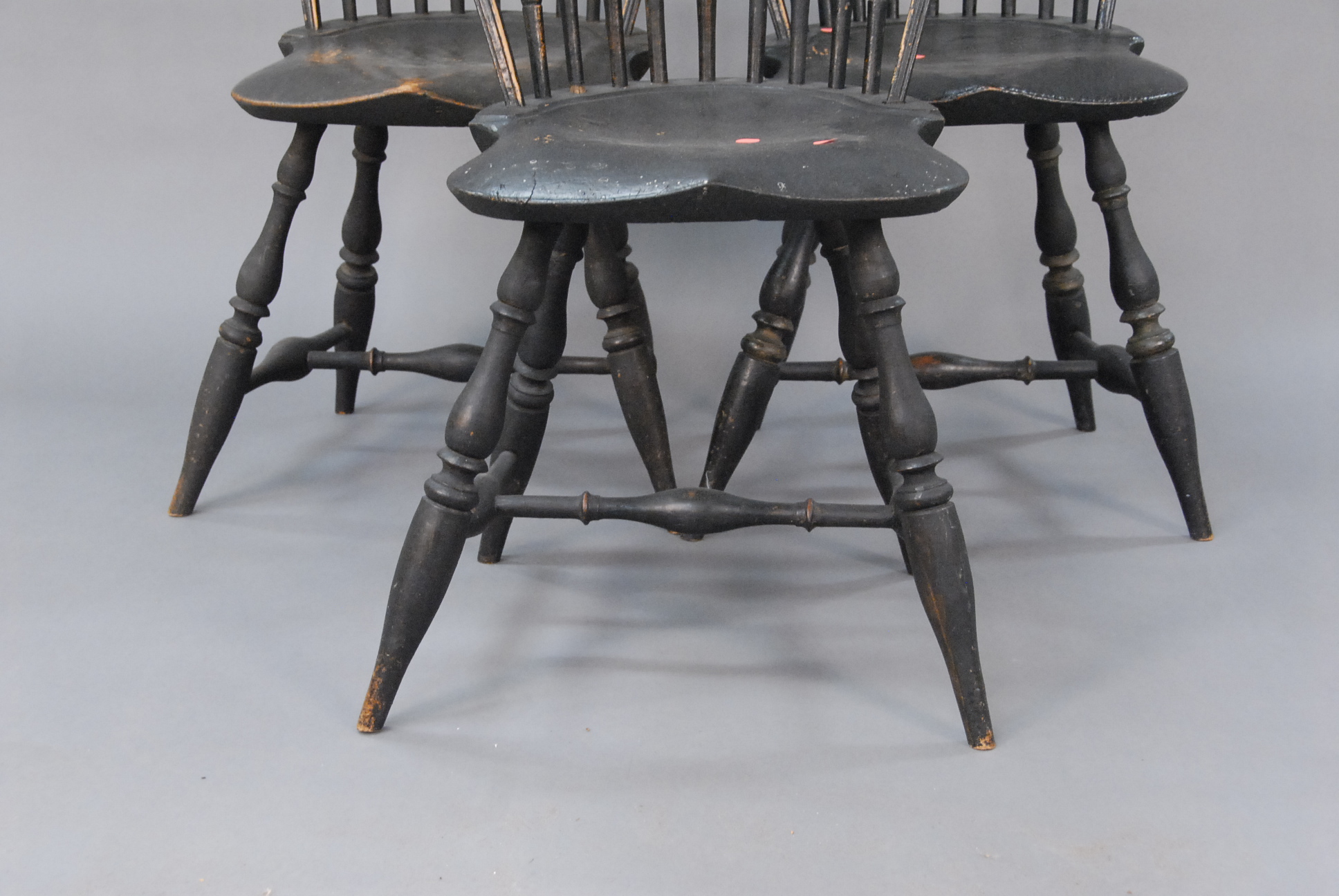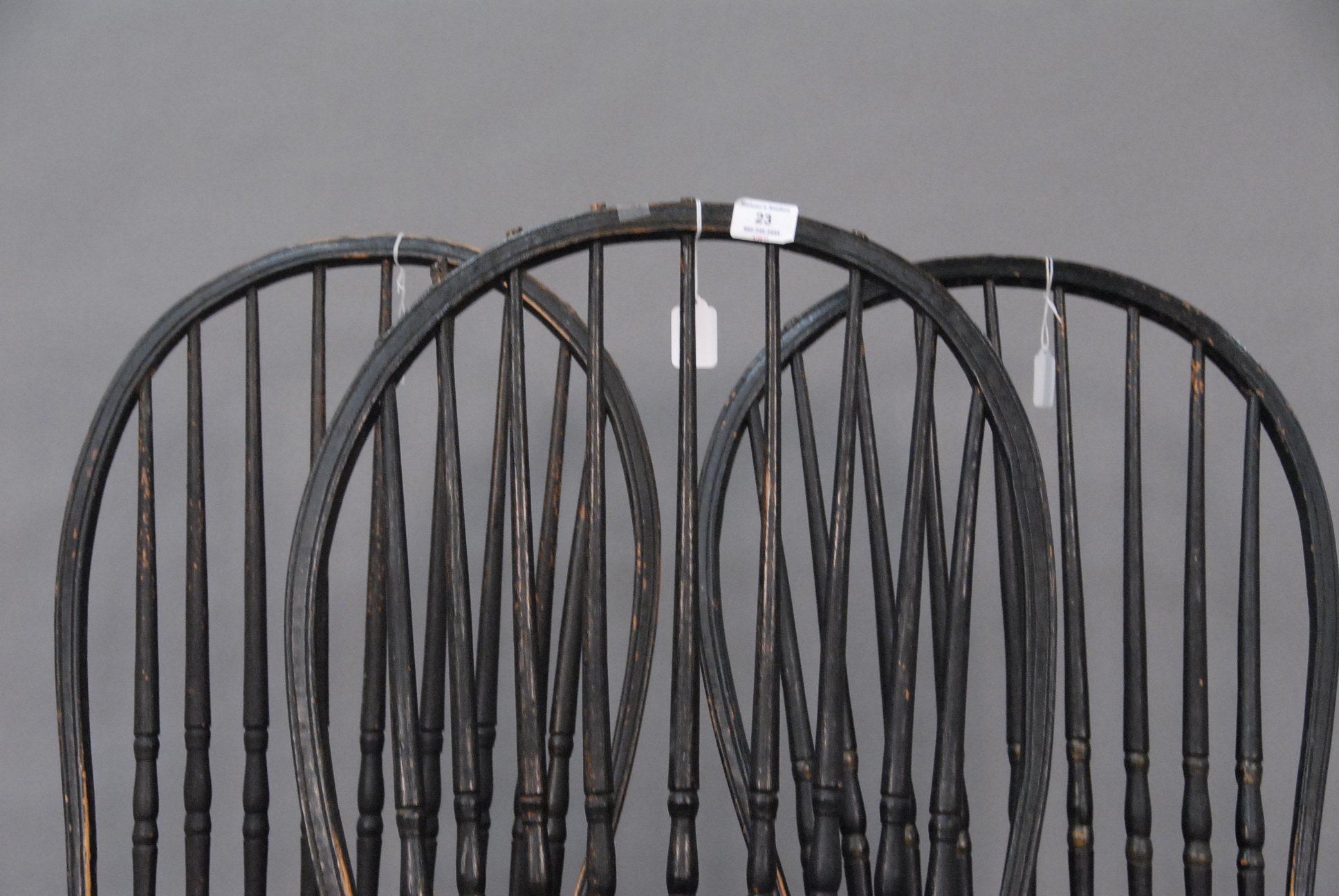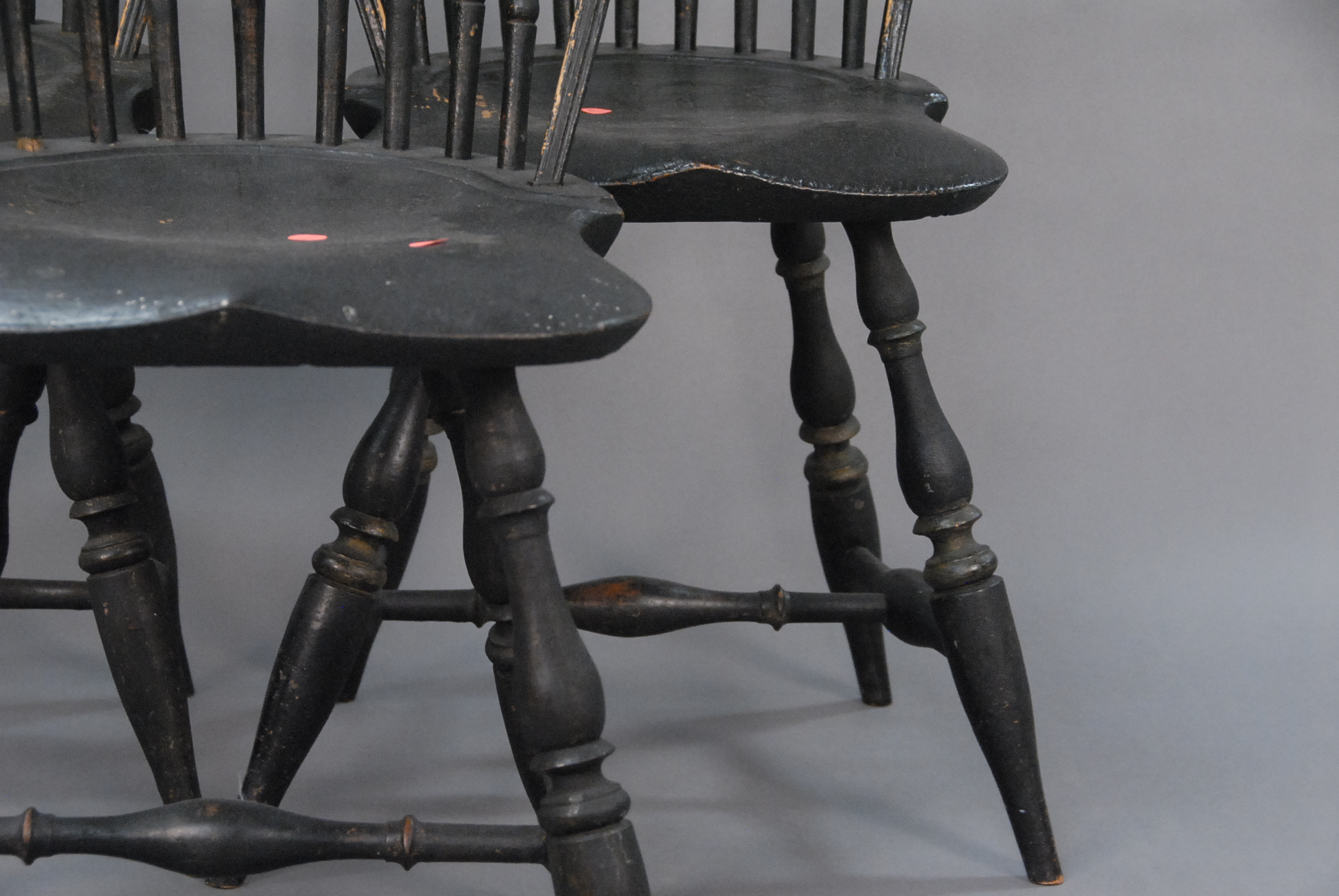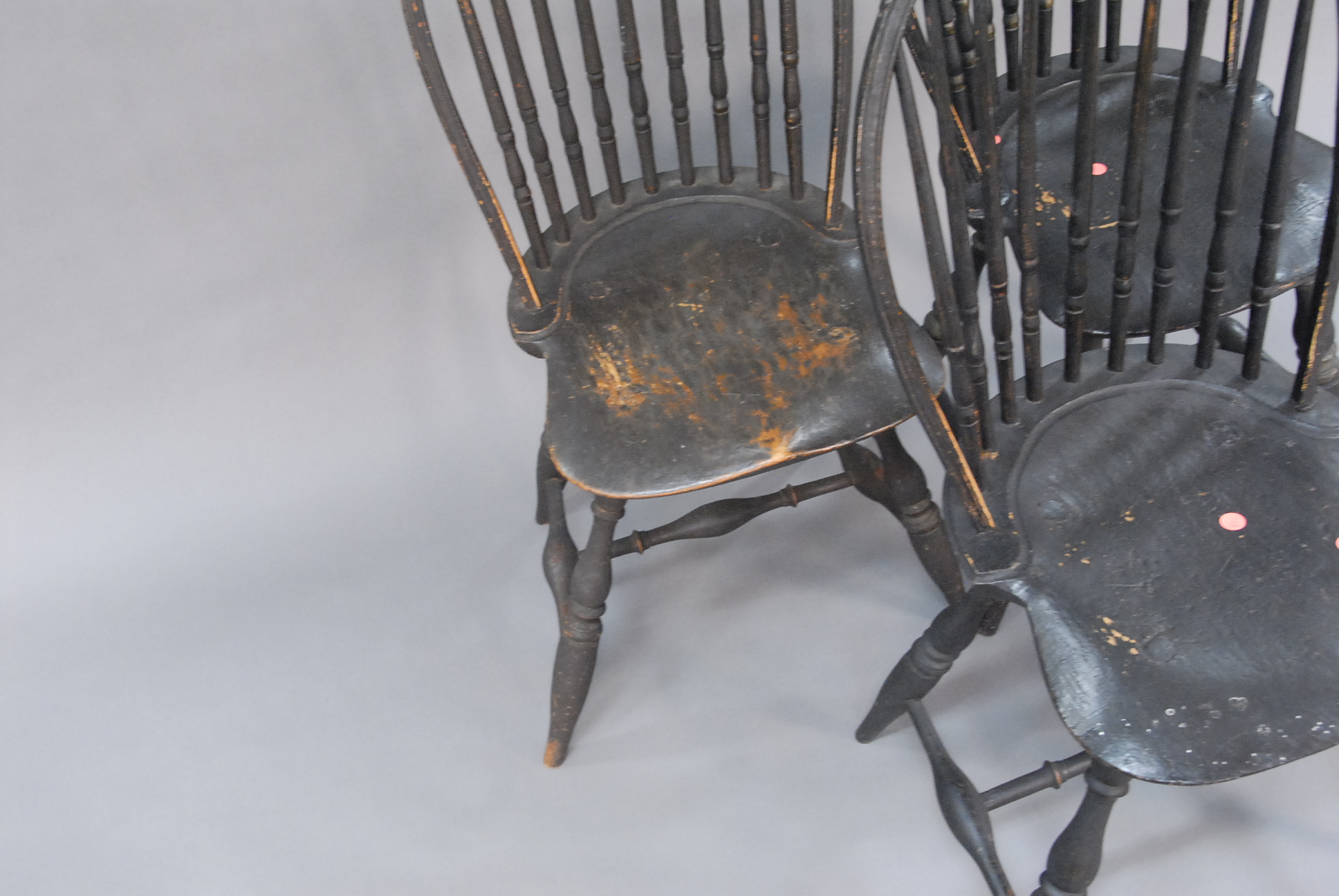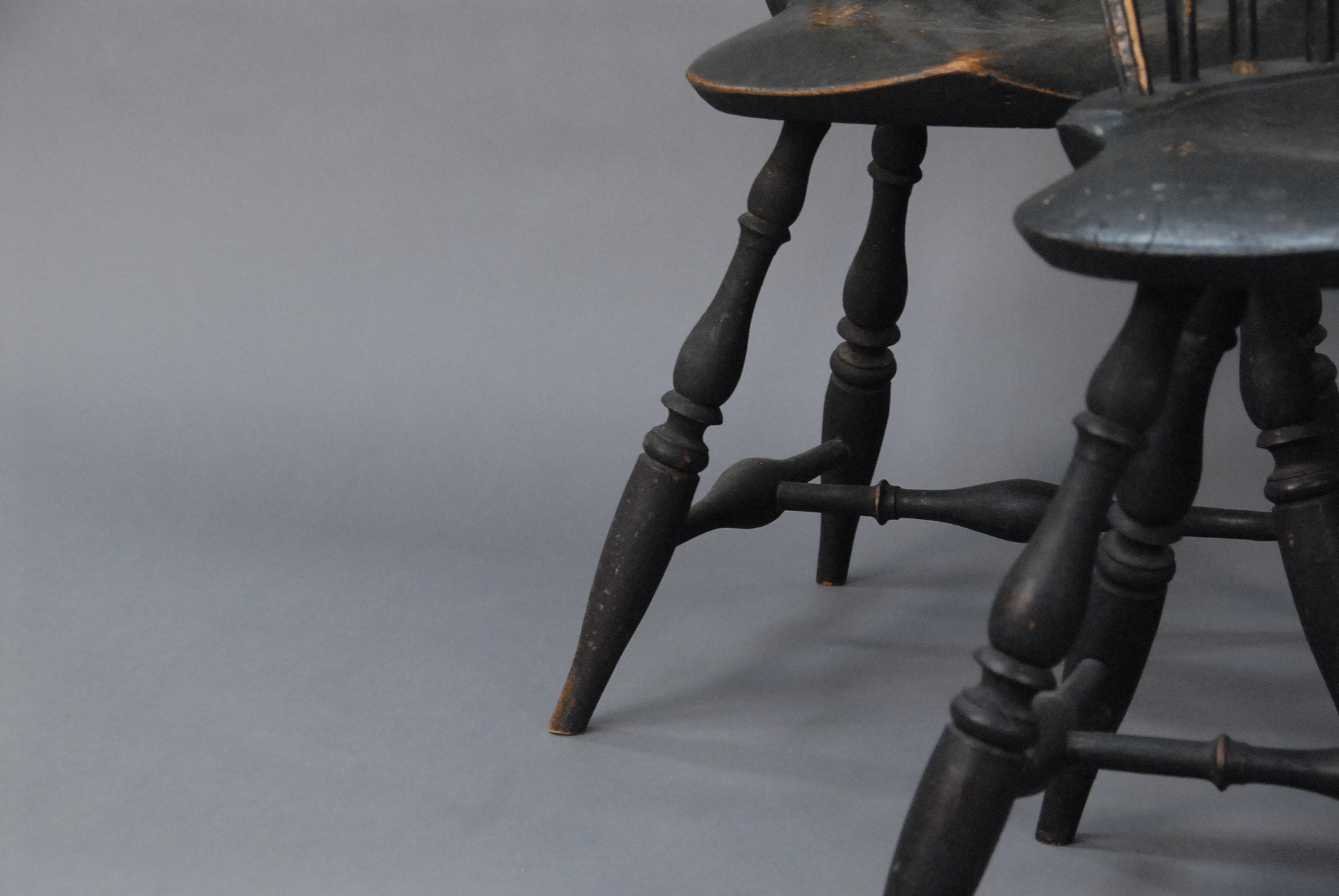 Set of three primitive Windsor bow back side chairs with bold turned legs, probably Rhode Island.