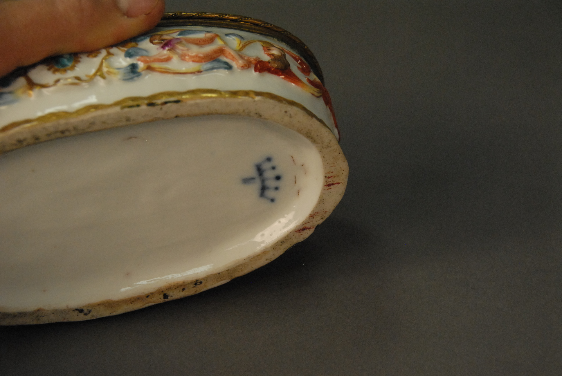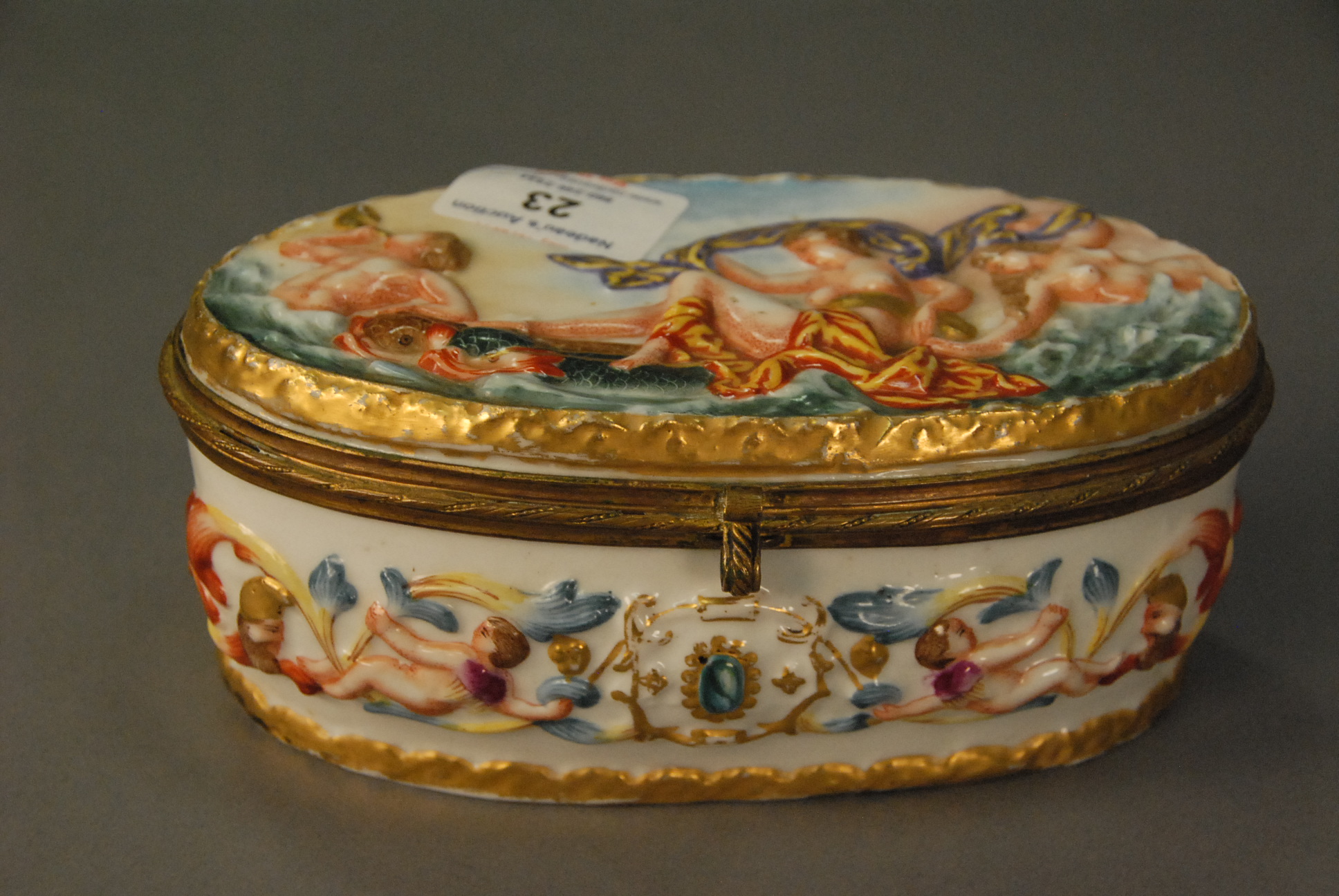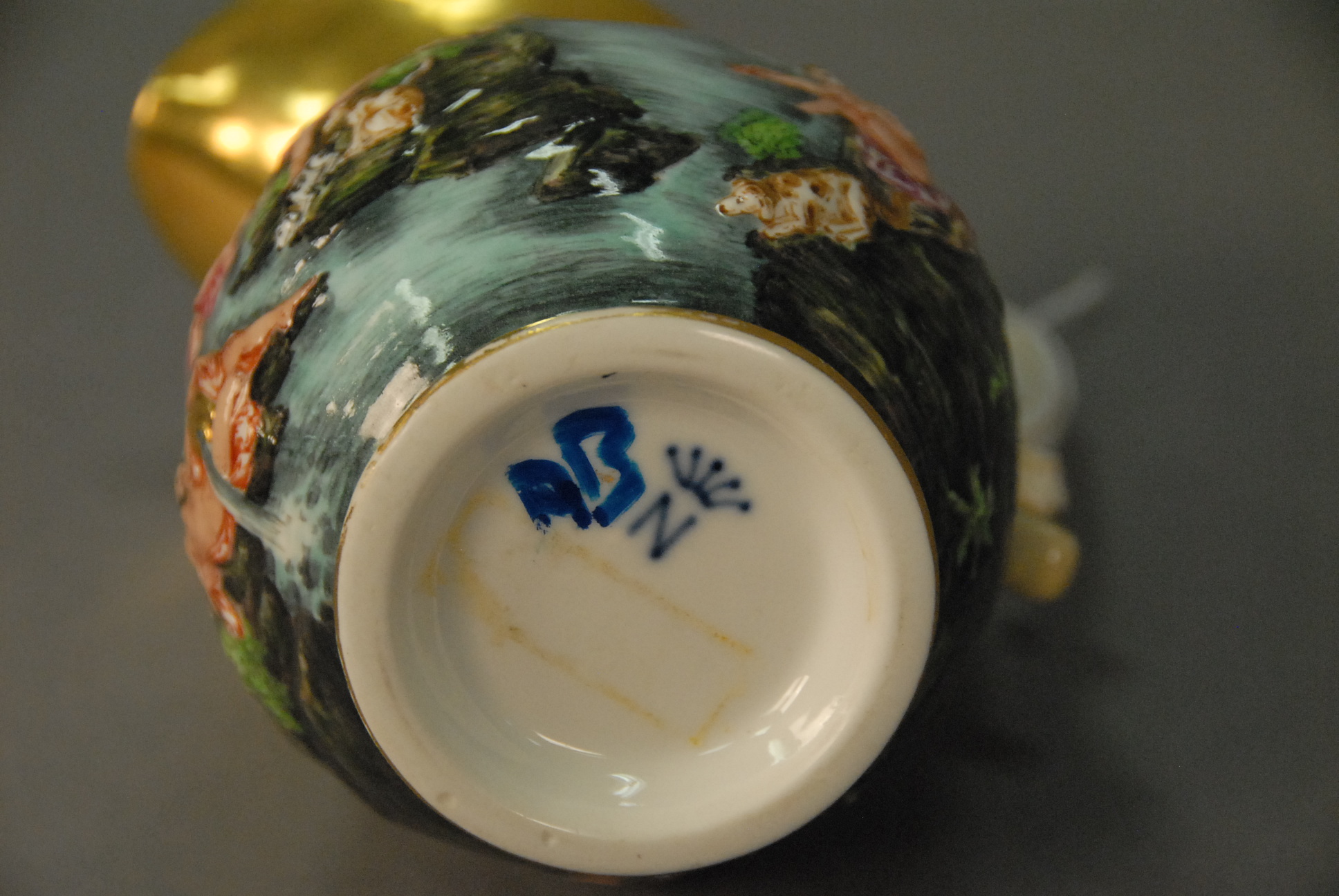Lot 23: Seven piece Capo-di-monte lot with tray, oval box, pitcher repaired handle, vases, and cups, tray: lg. 15in. wd. 12in.