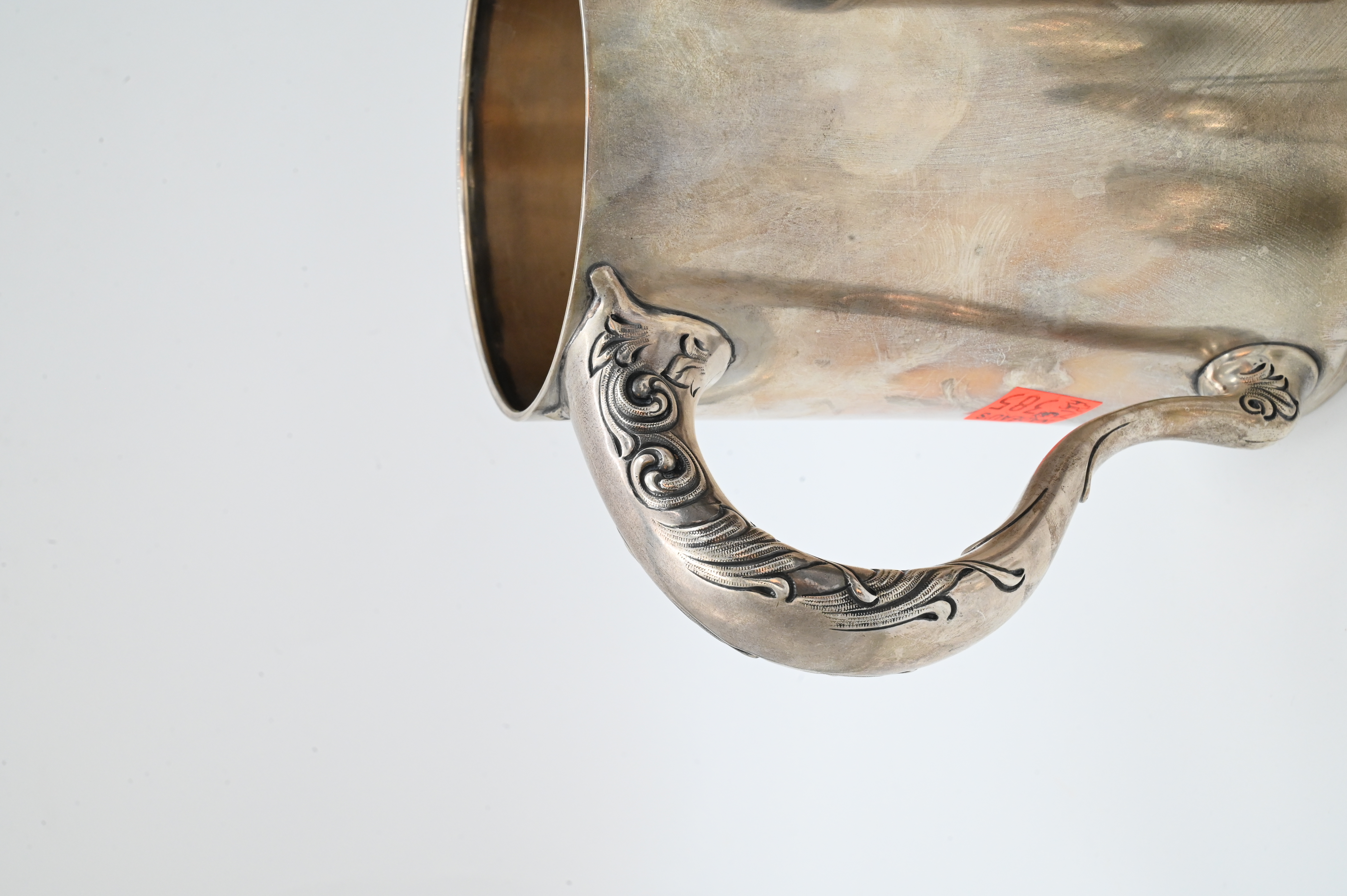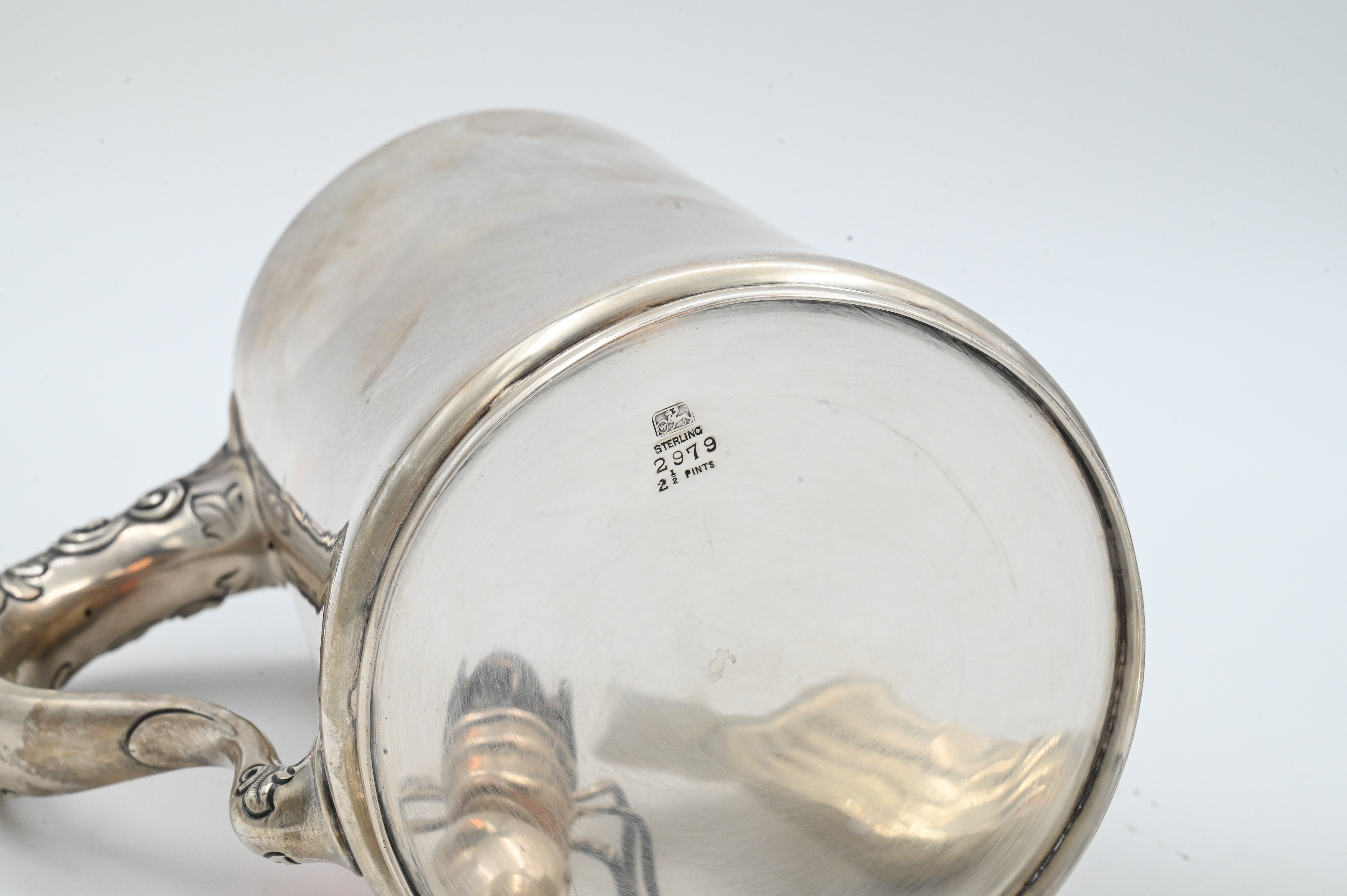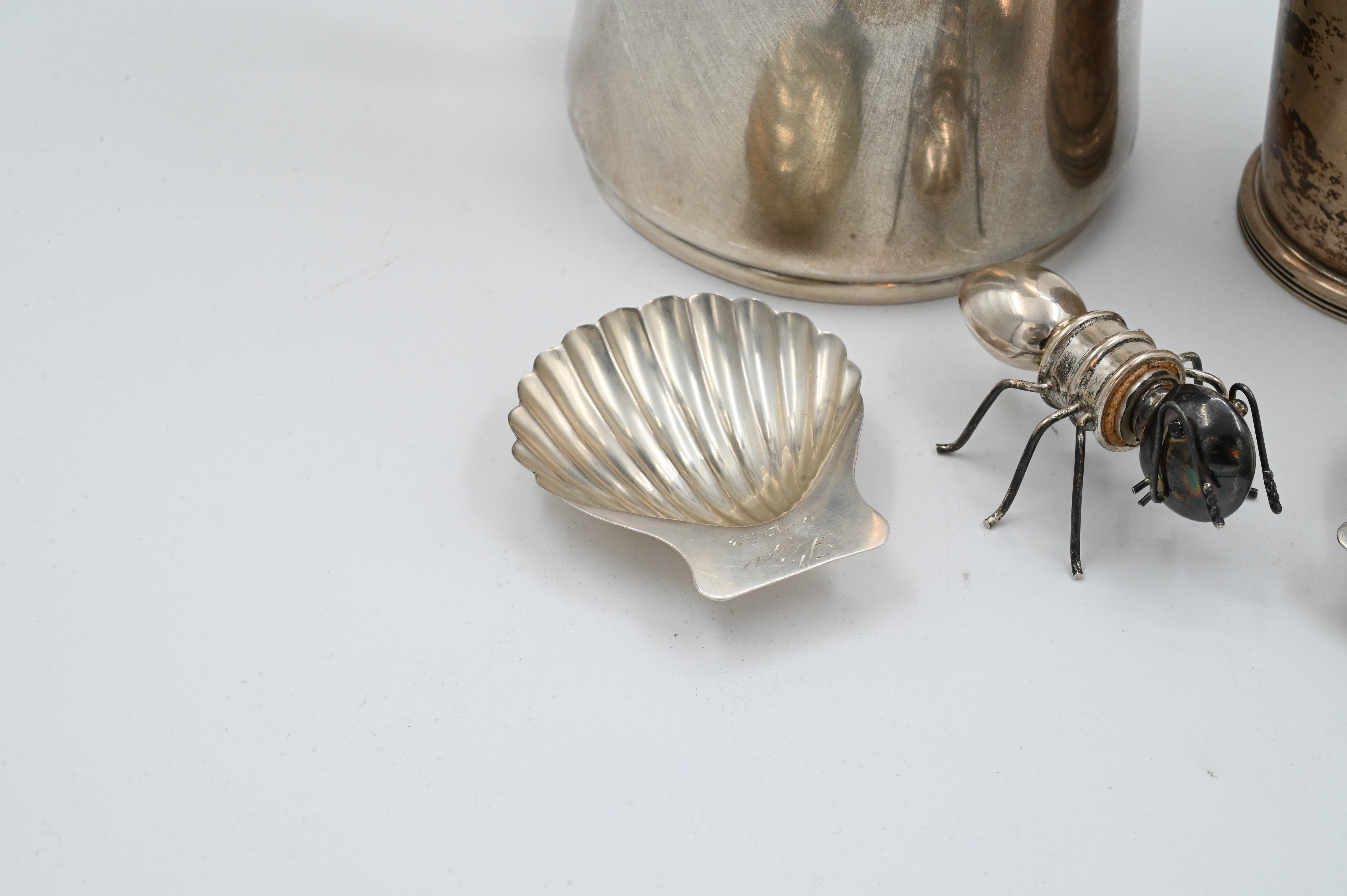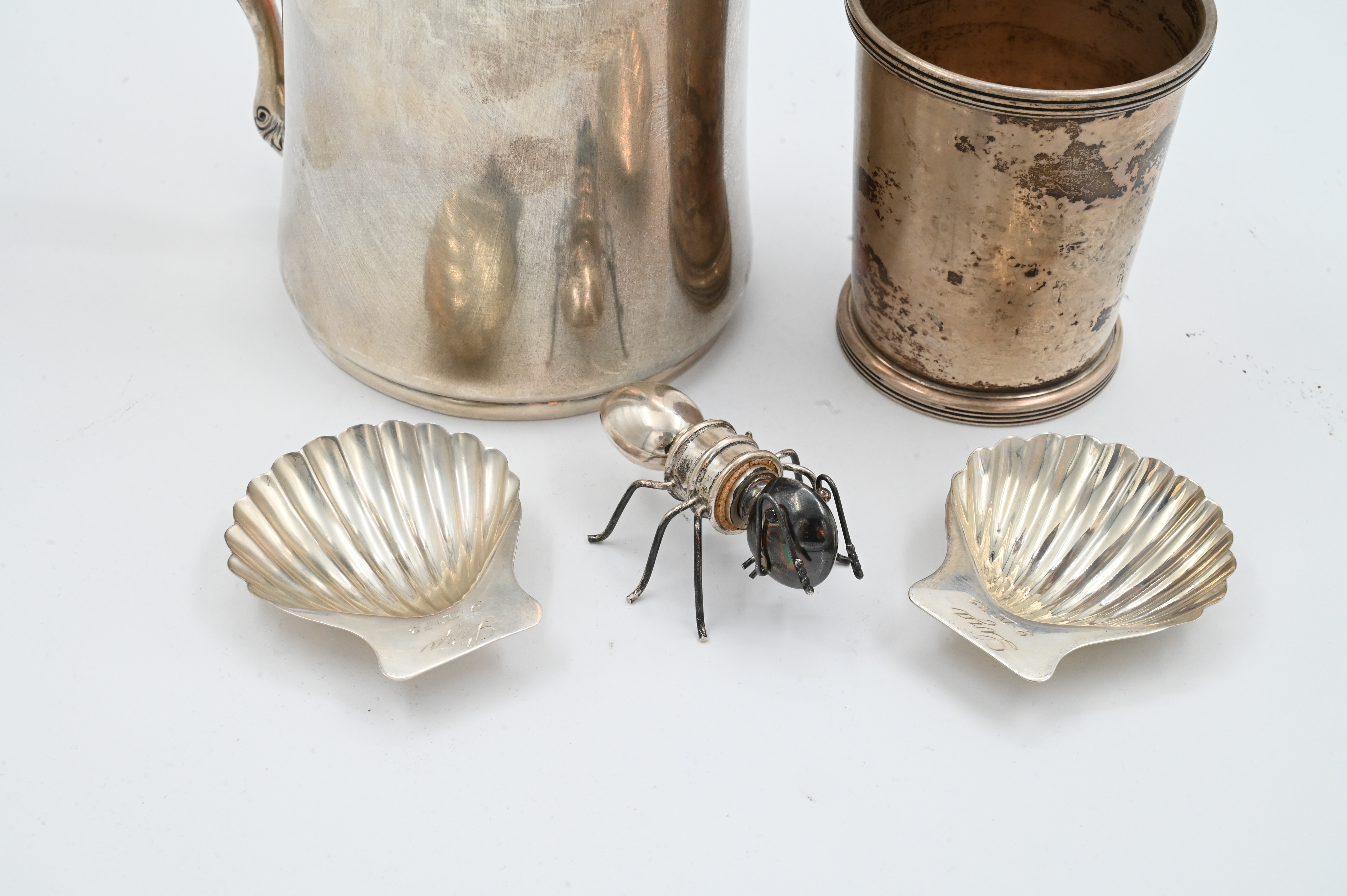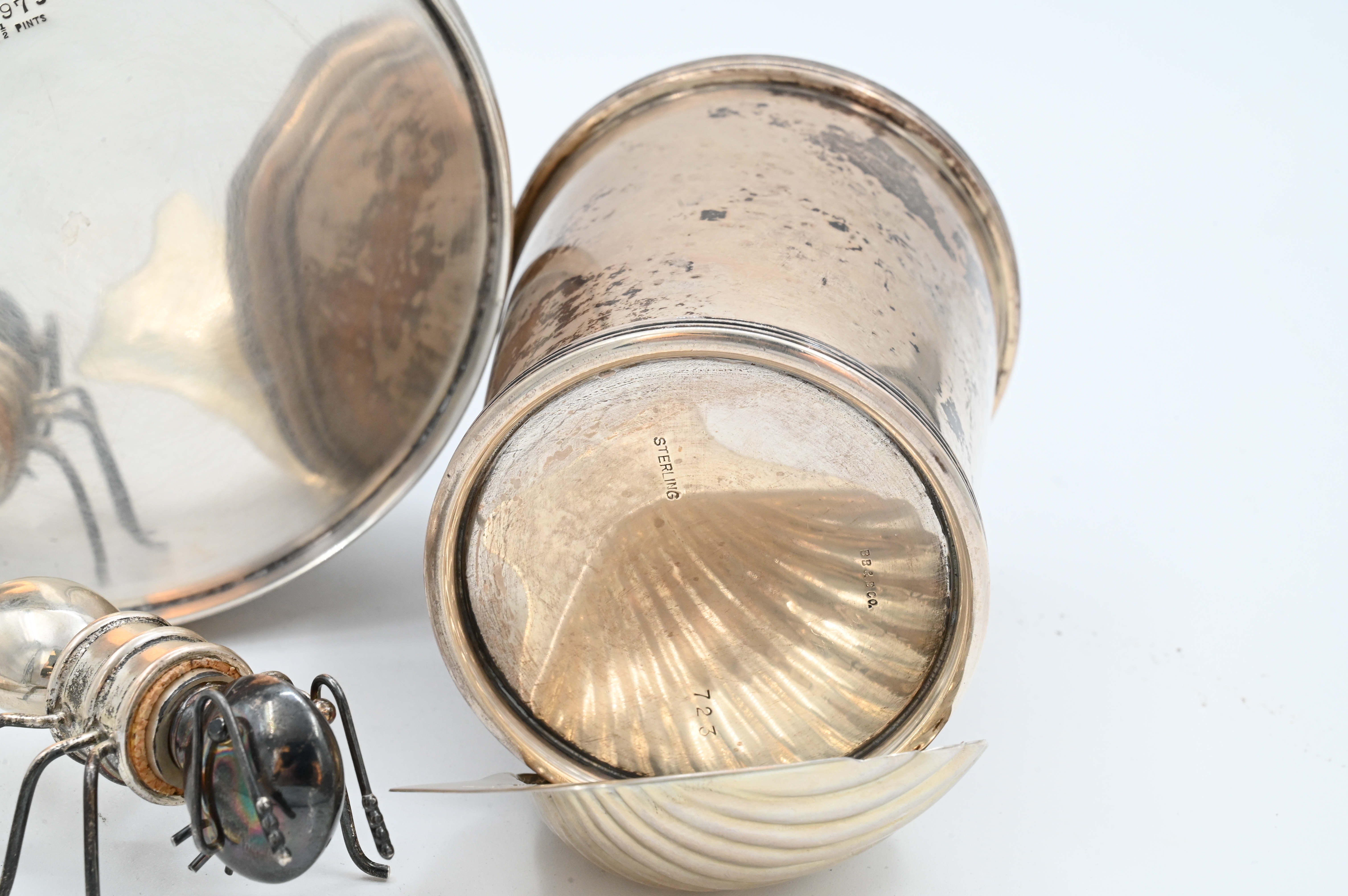 to include large sterling tankard with scroll handle, sterling ant form salt and pepper, two sterling shell form trays, one sterling small cup together with silver plate cup
