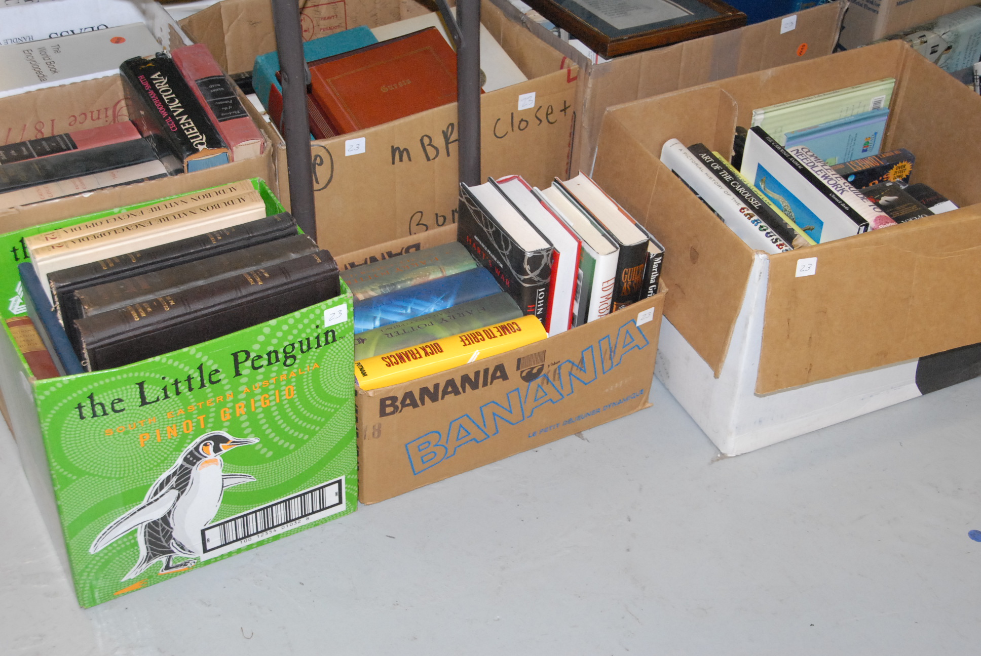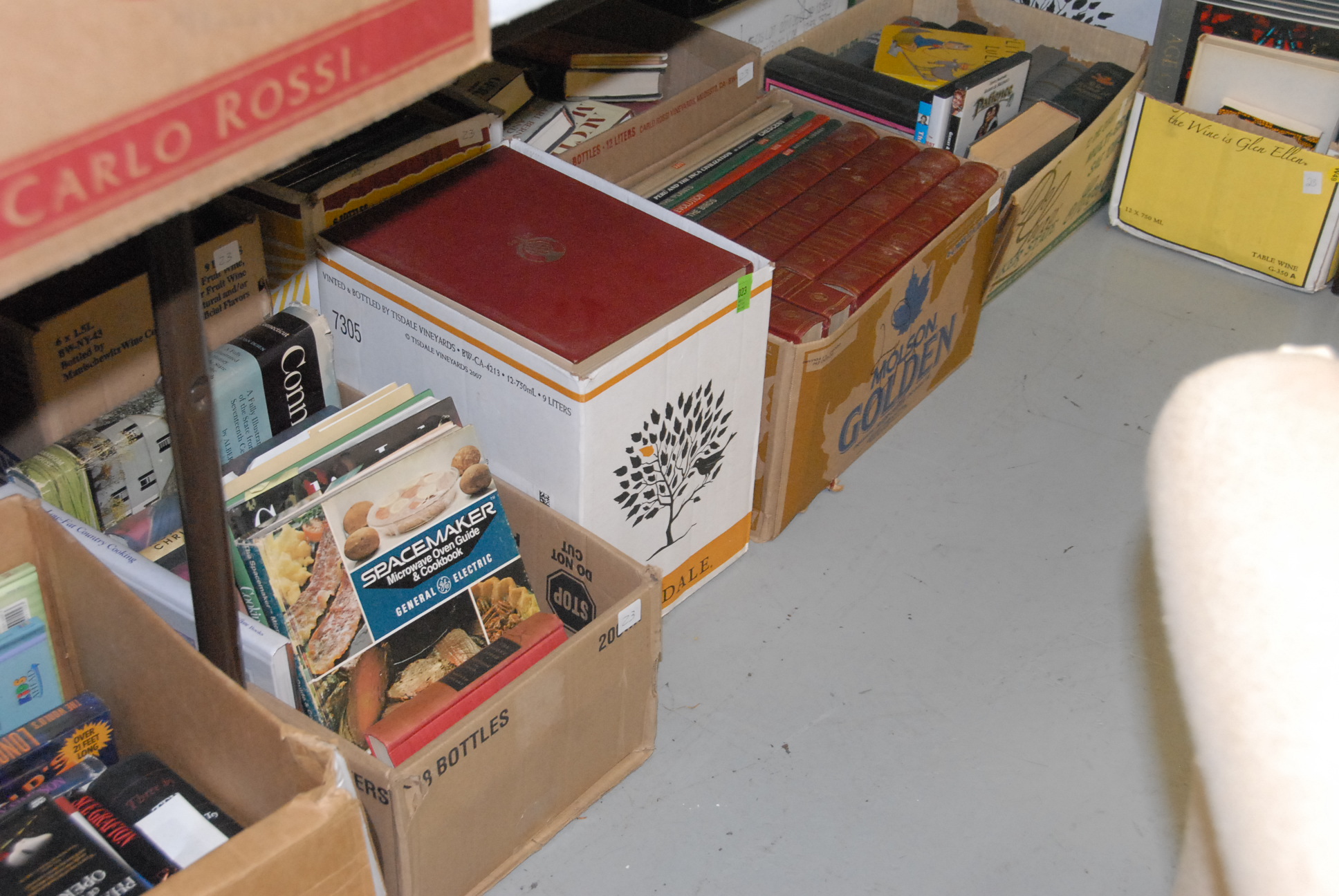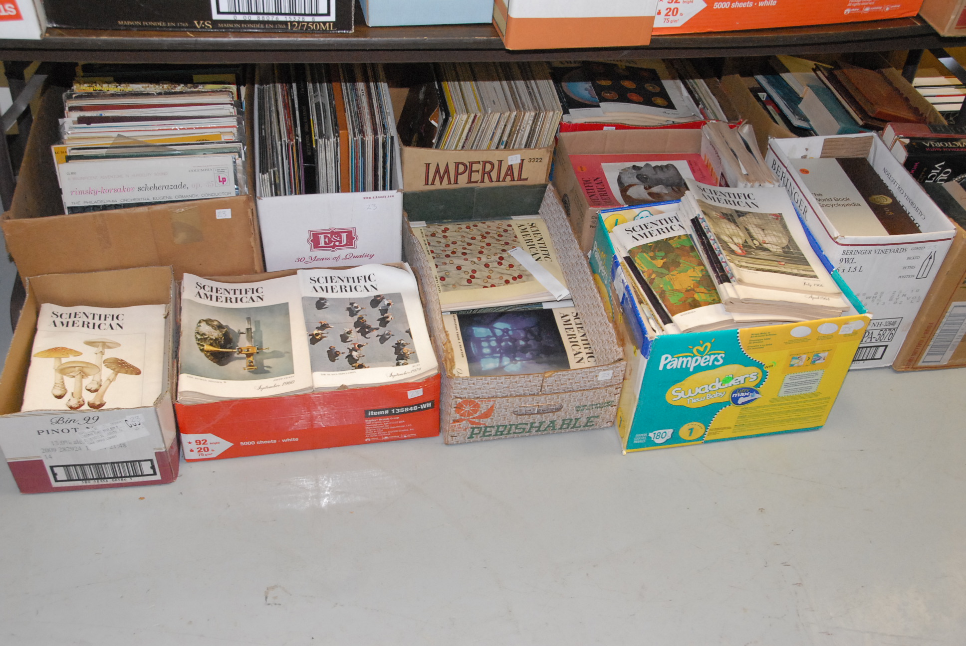 Thirty seven boxes of books, magazines, and records in boxes under three tables including Scientific American Magazine.