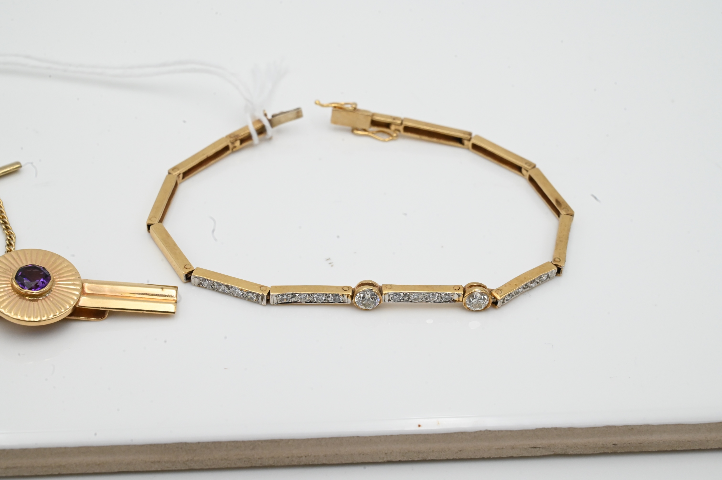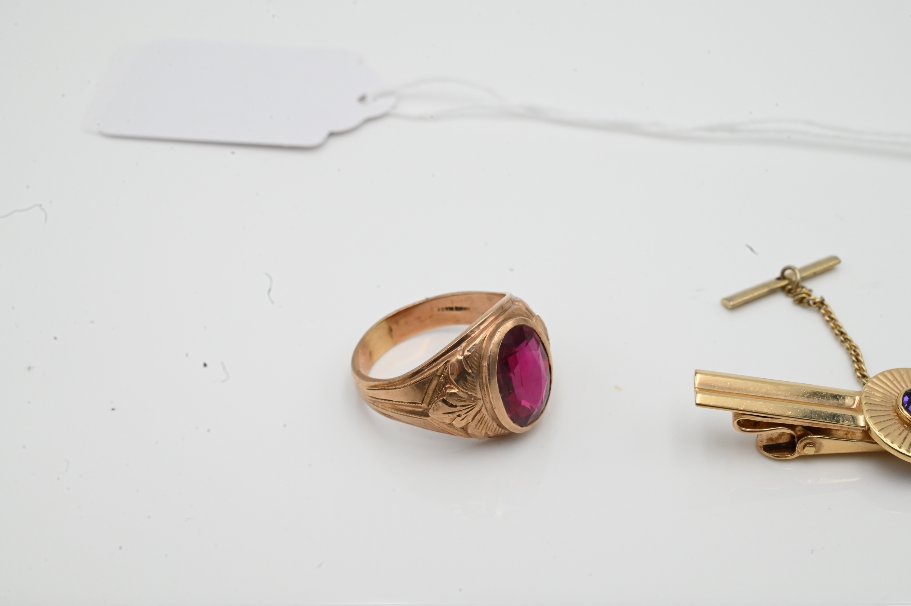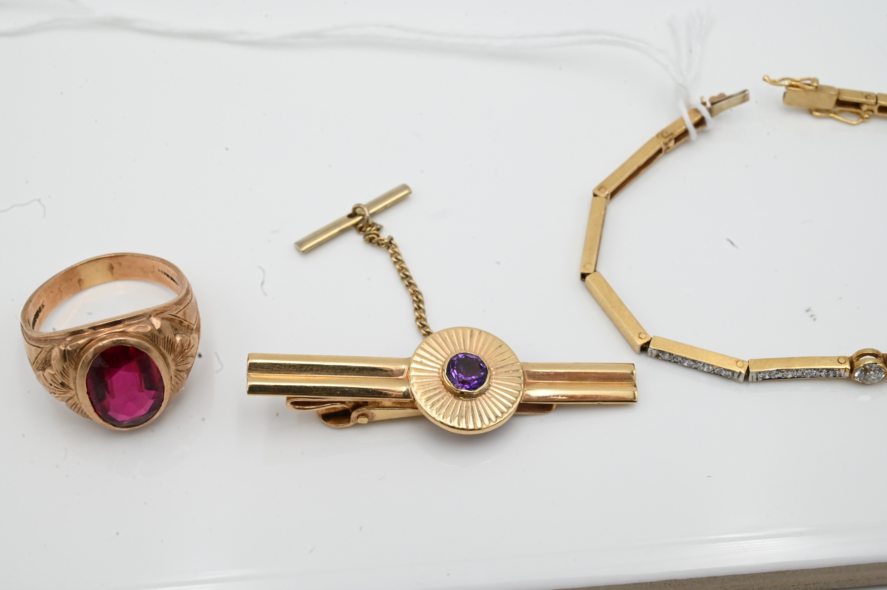 Three Piece Gold Lot, to include a 14 karat yellow gold inline bracelet, set with diamonds, length 7 3/4 inches, a tie clip with amethyst, along with a mans ring having oval red stone, total weight 24.4 grams.