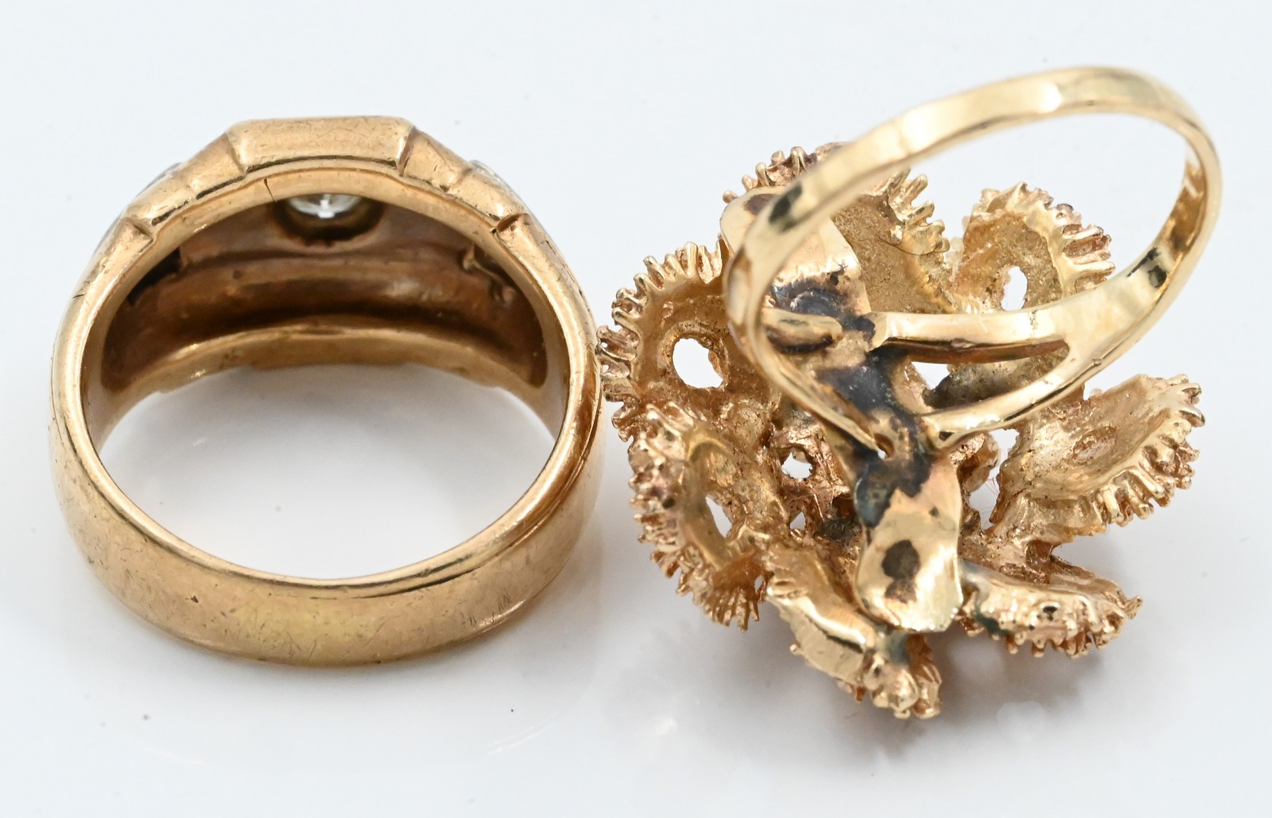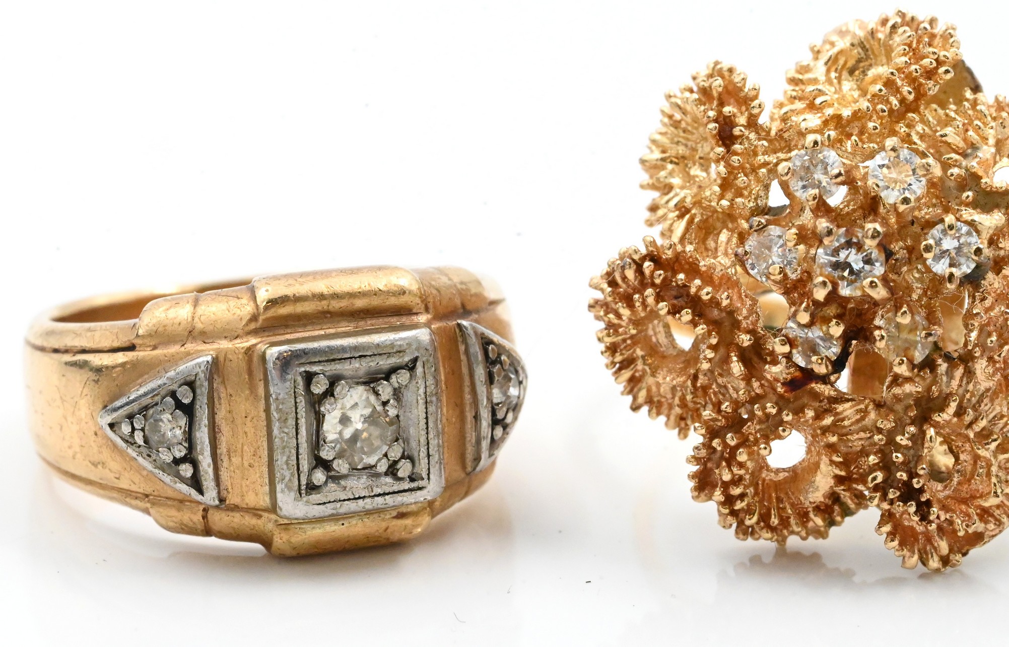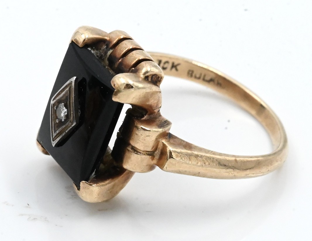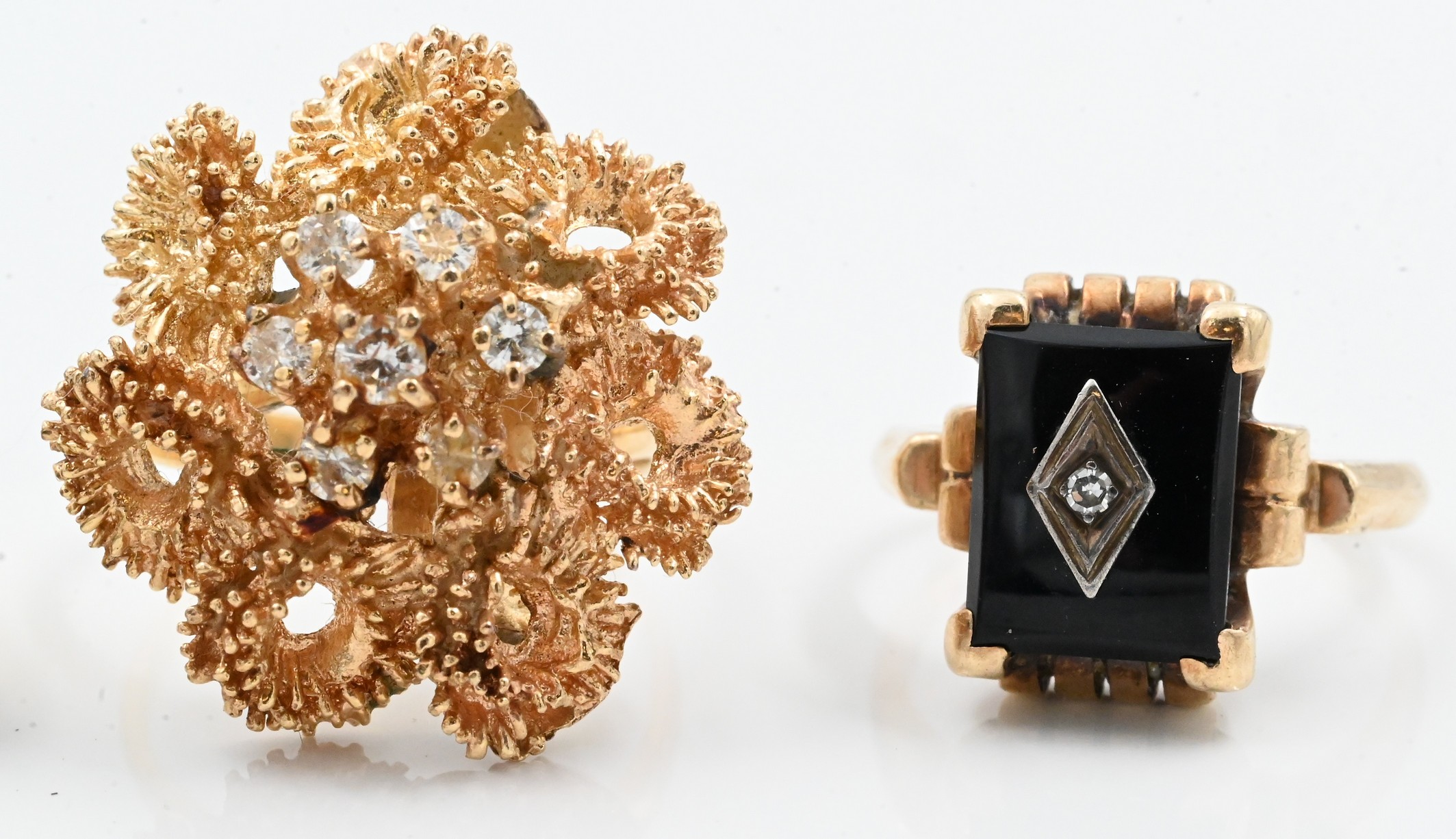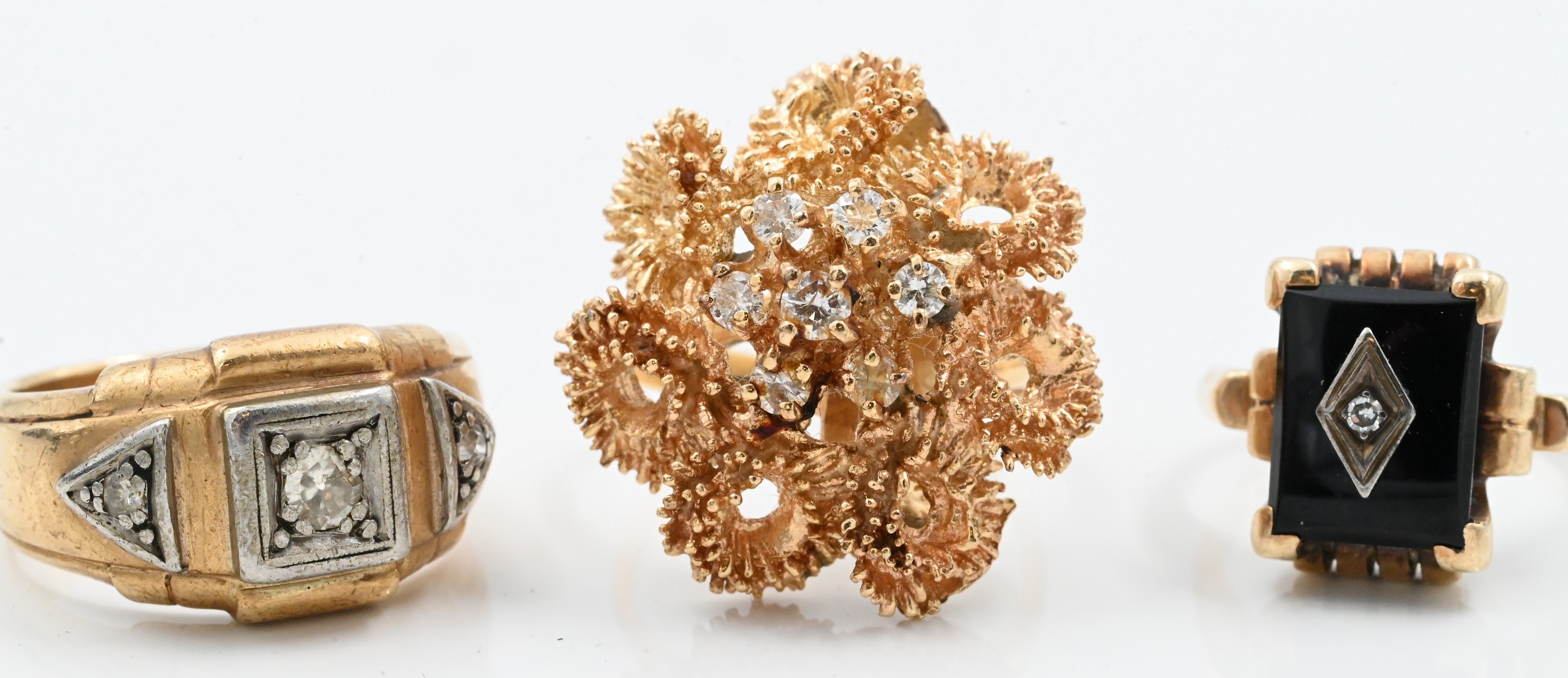 one 10K with Onyx, one 14K in a floral pattern, and one 14K with three small diamonds