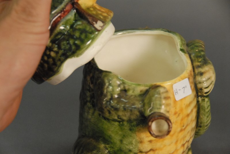 Lot 23: Two figural tobacco pipe jars, one of an aligator ht. 7 in. and the other of an Arab with removable cap ht. 6 in.