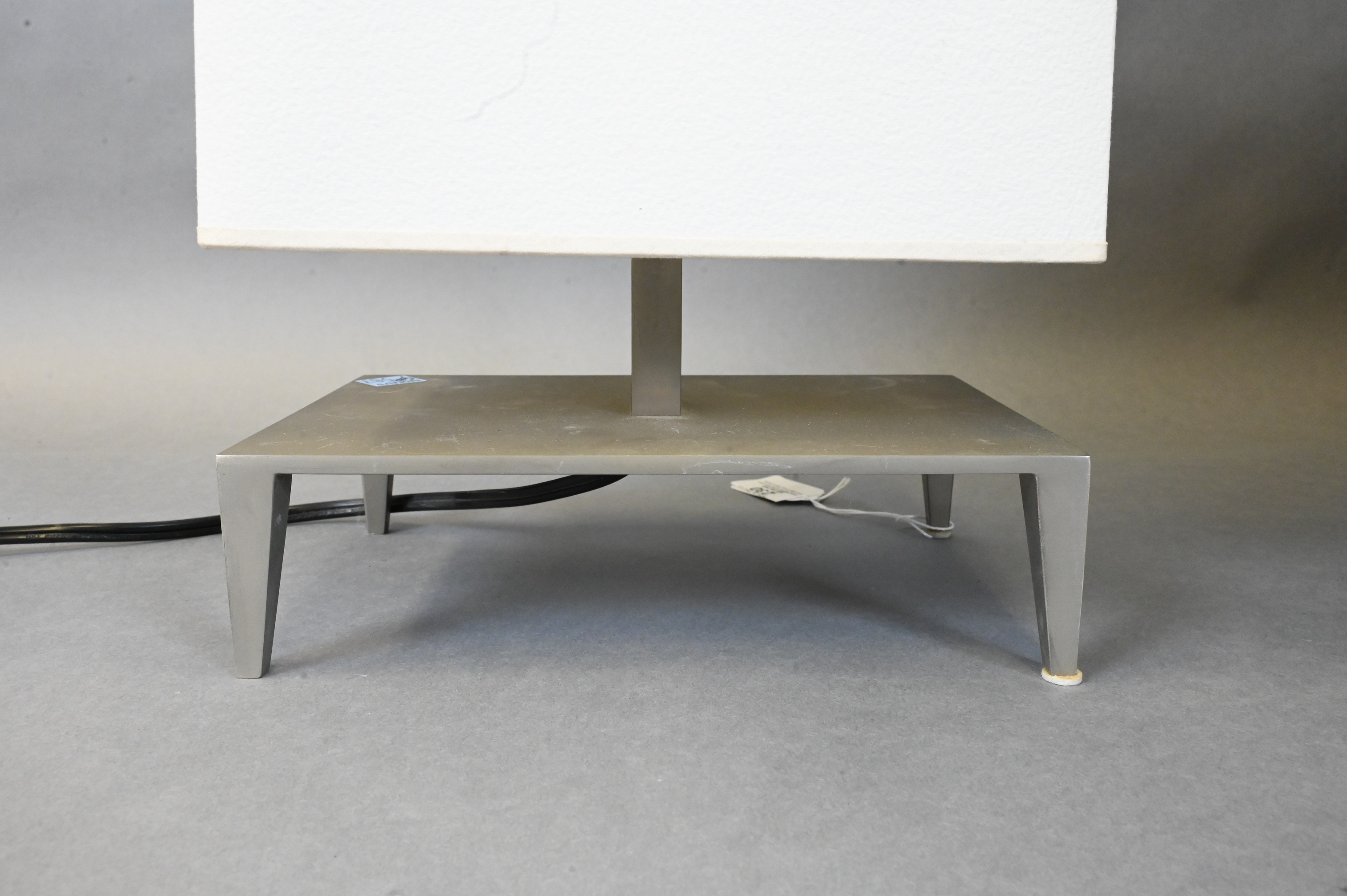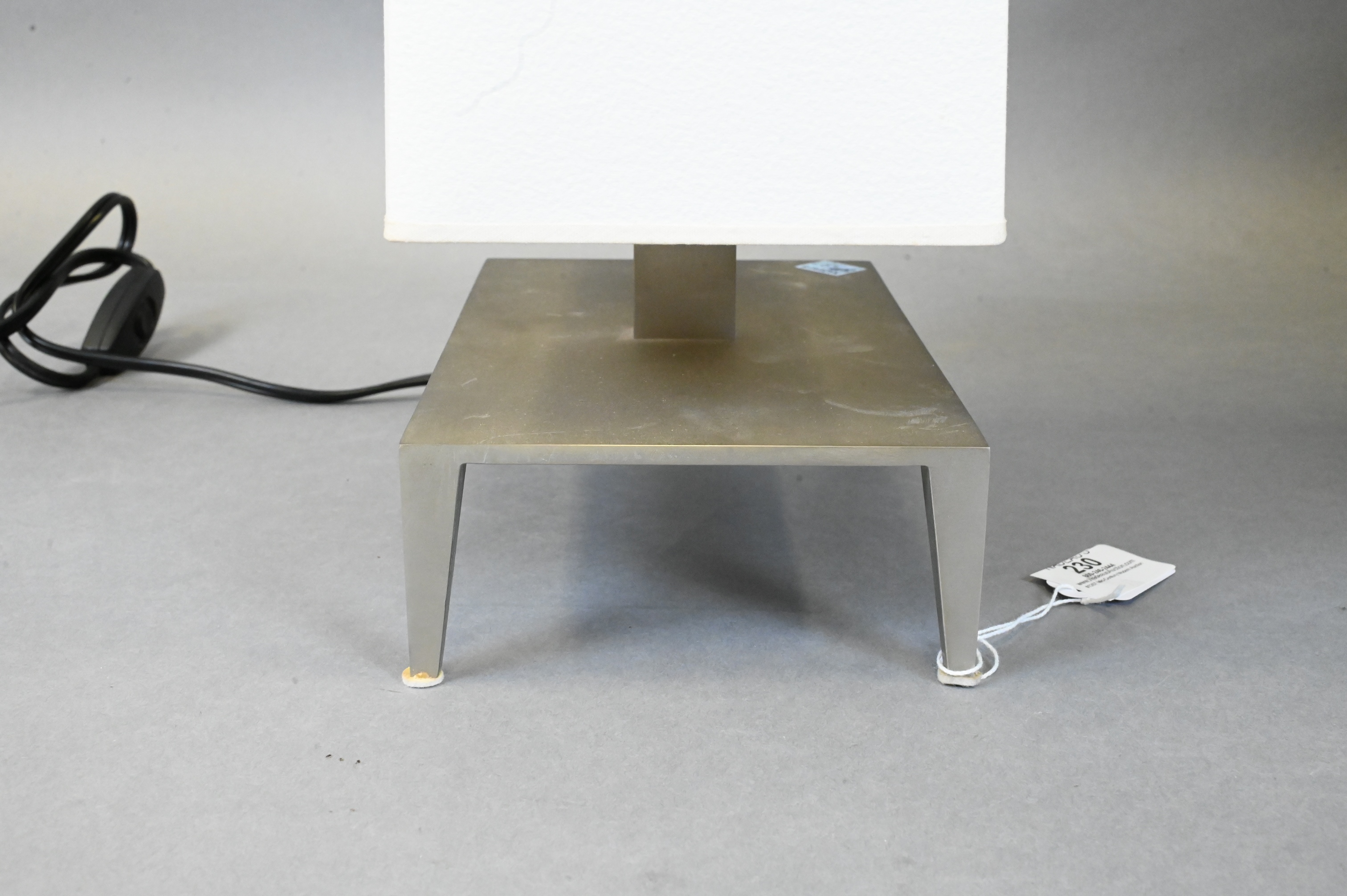 rectangular matte aluminum patinated brass body set on four tapering legs, trapezoidal paper shade, retails for over ($1000)