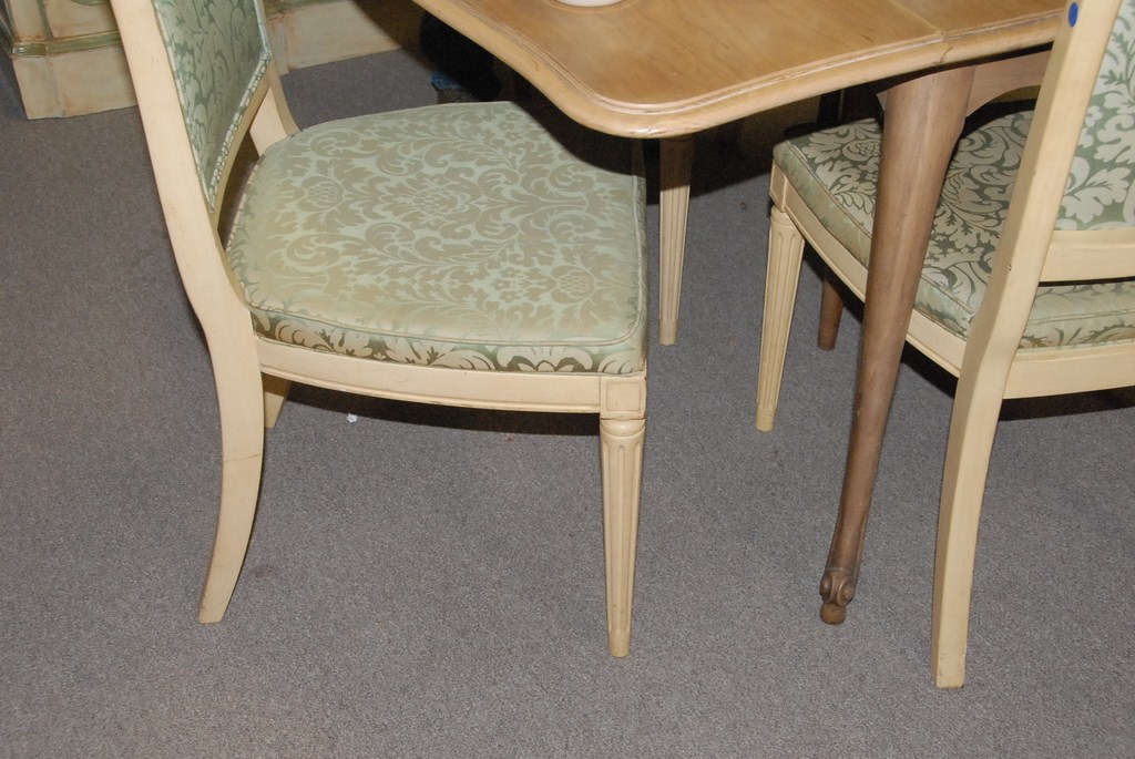 Drop leaf table and four upholstered chairs.