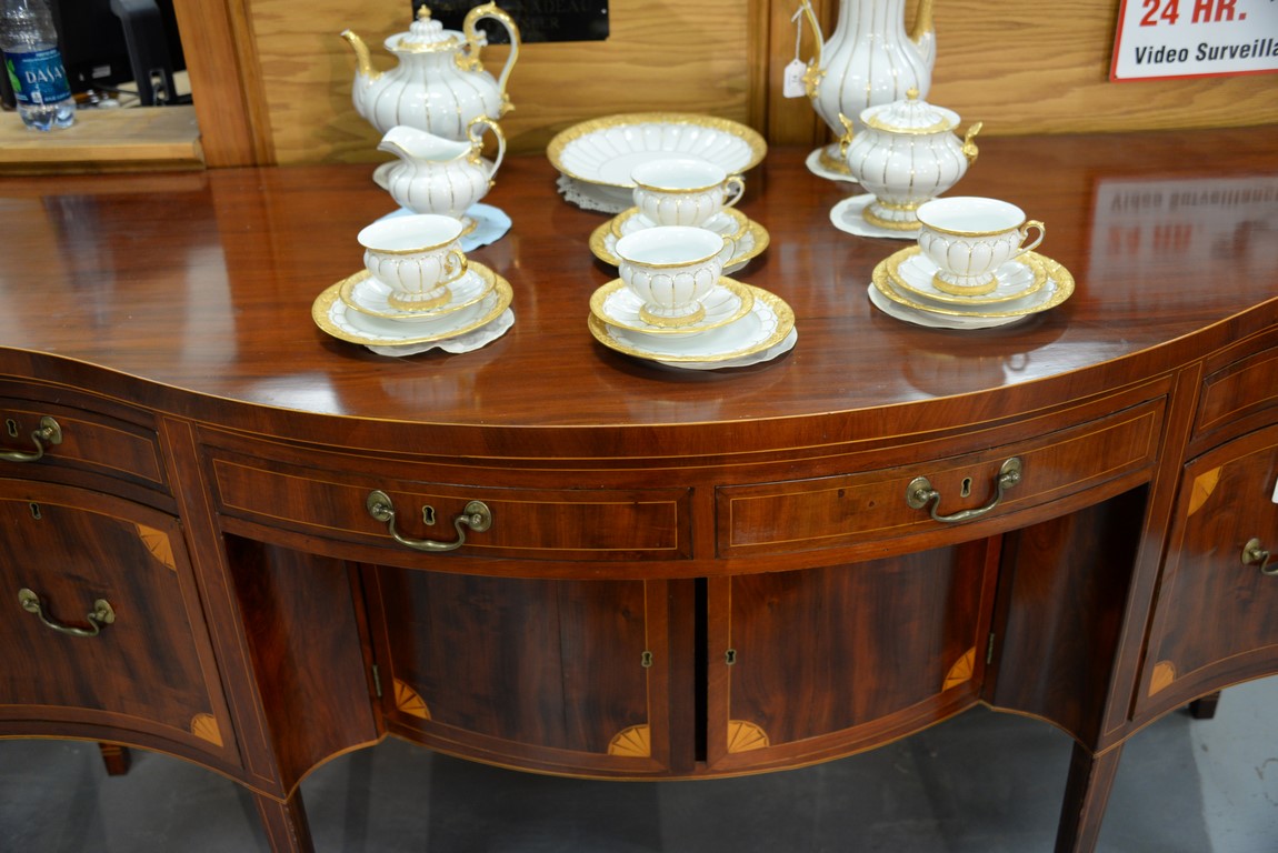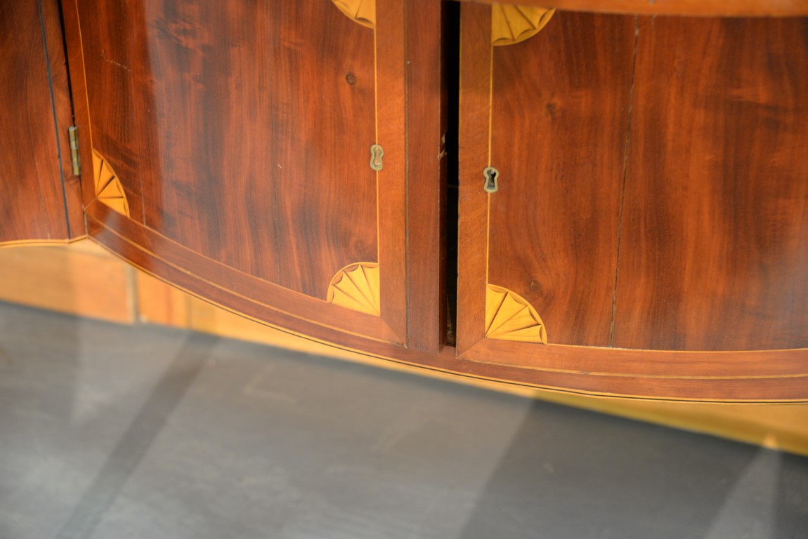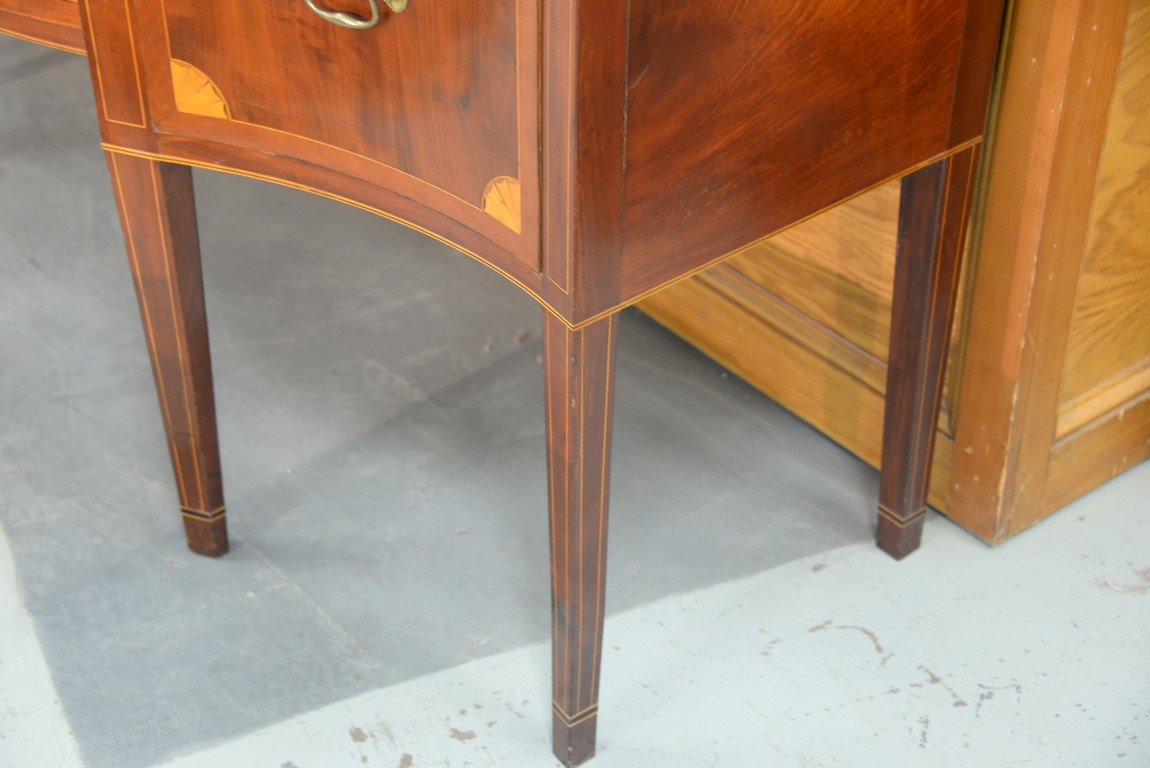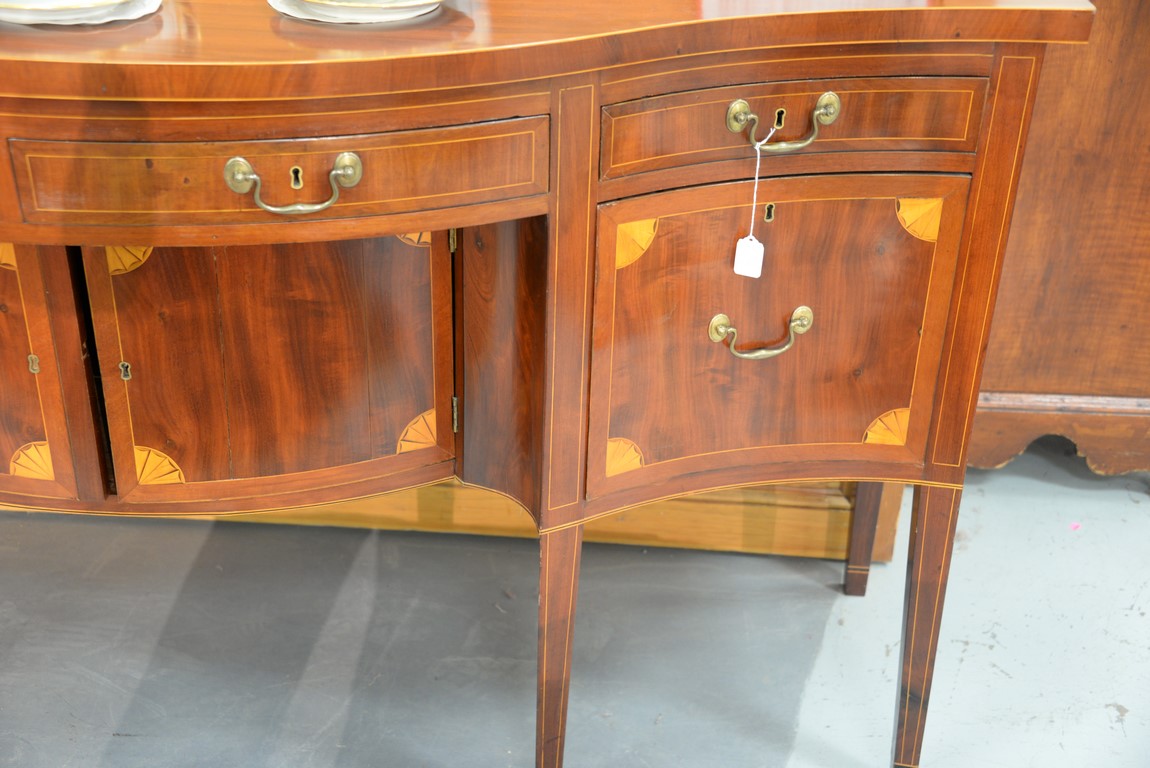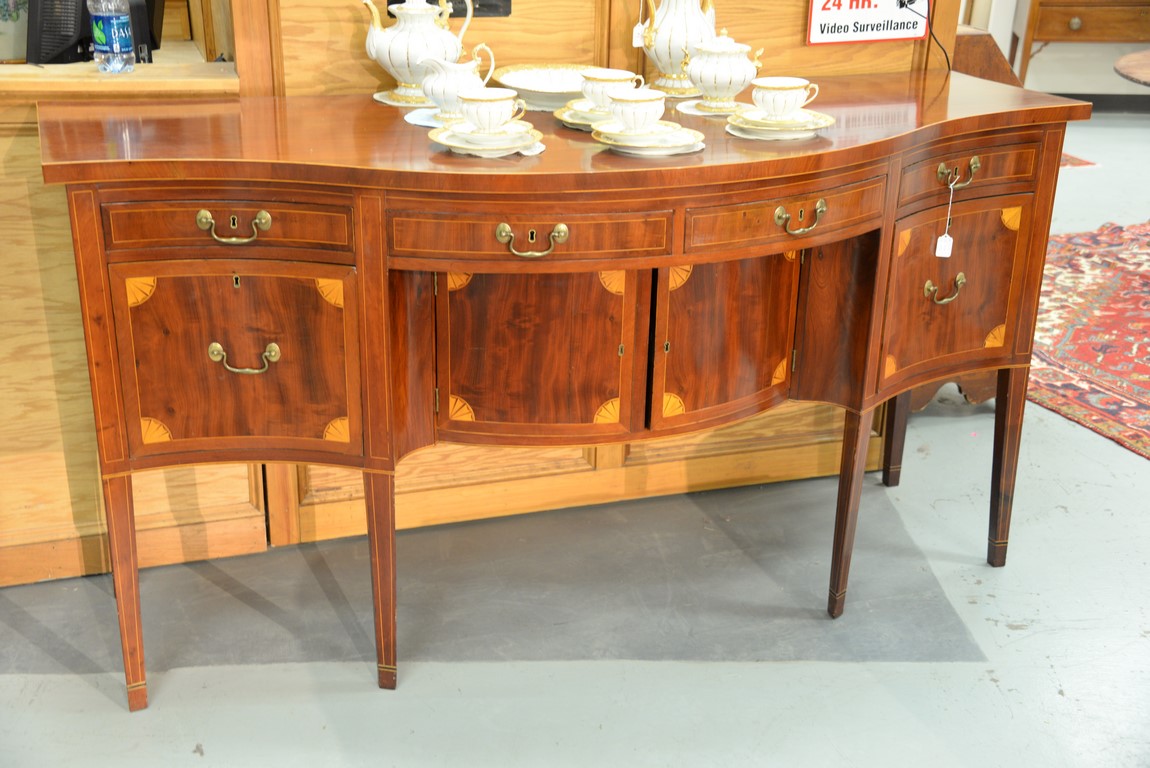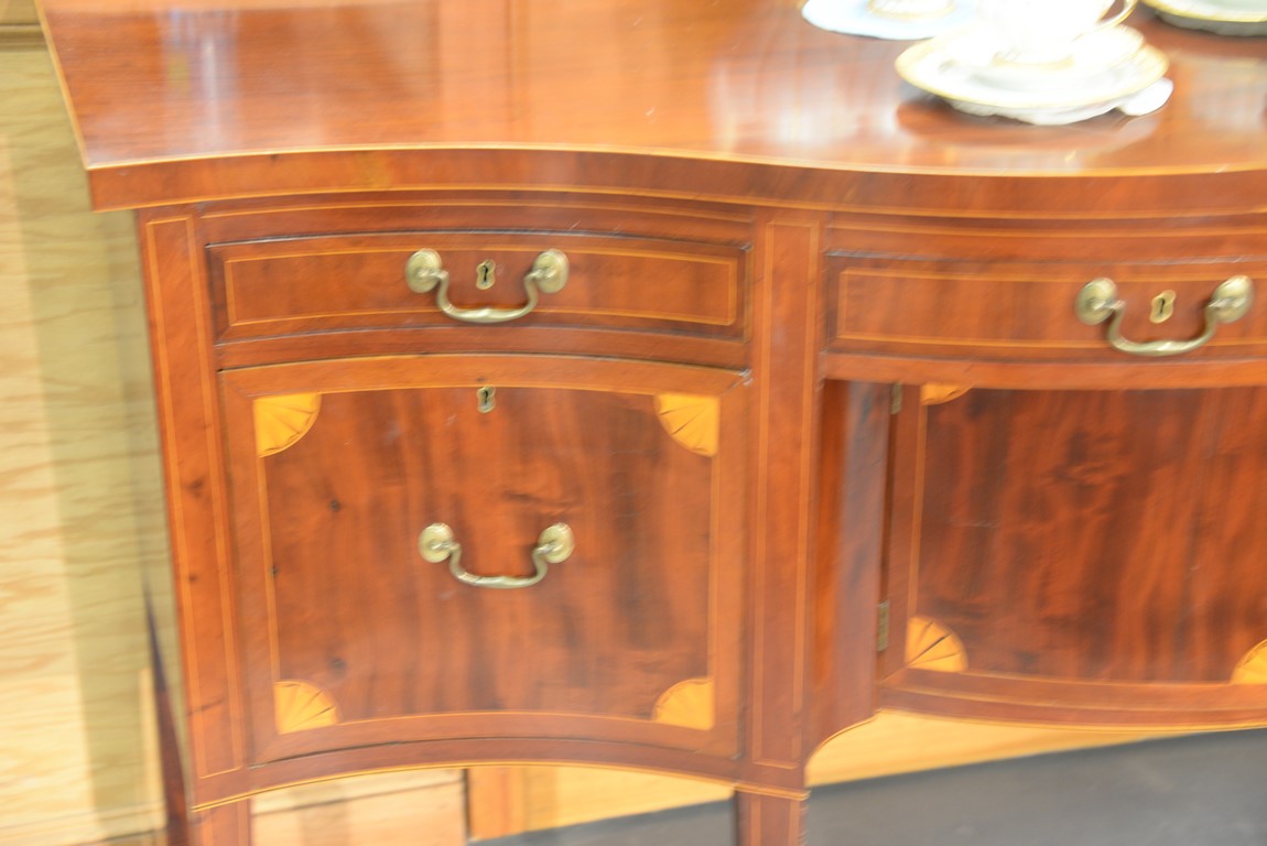Lot 230: Federal inlaid mahogany sideboard having serpentine top over conforming case with four short drawers over two center doors flanked by two large bottle drawers, drawer fronts inlaid with fans and lines, all set on square tapered legs with line and fan