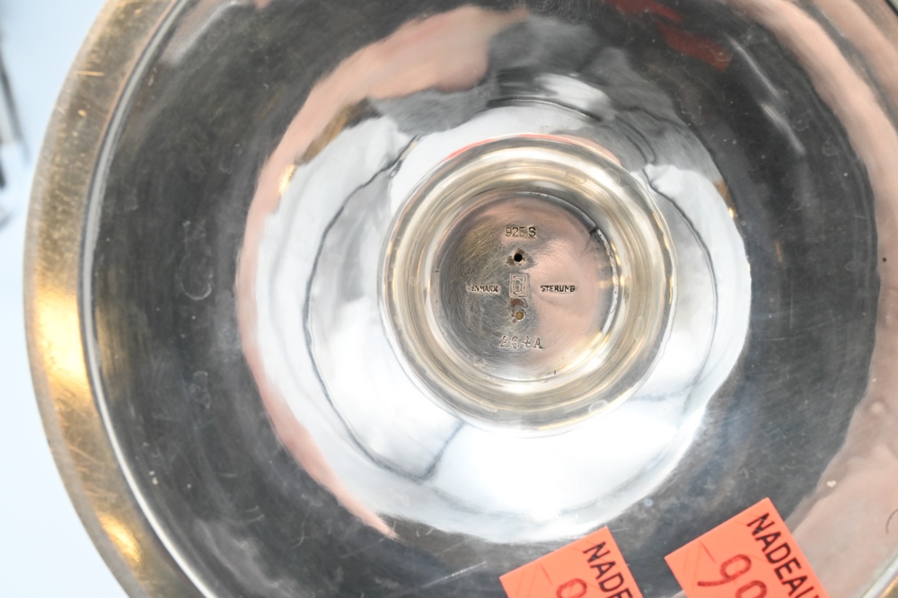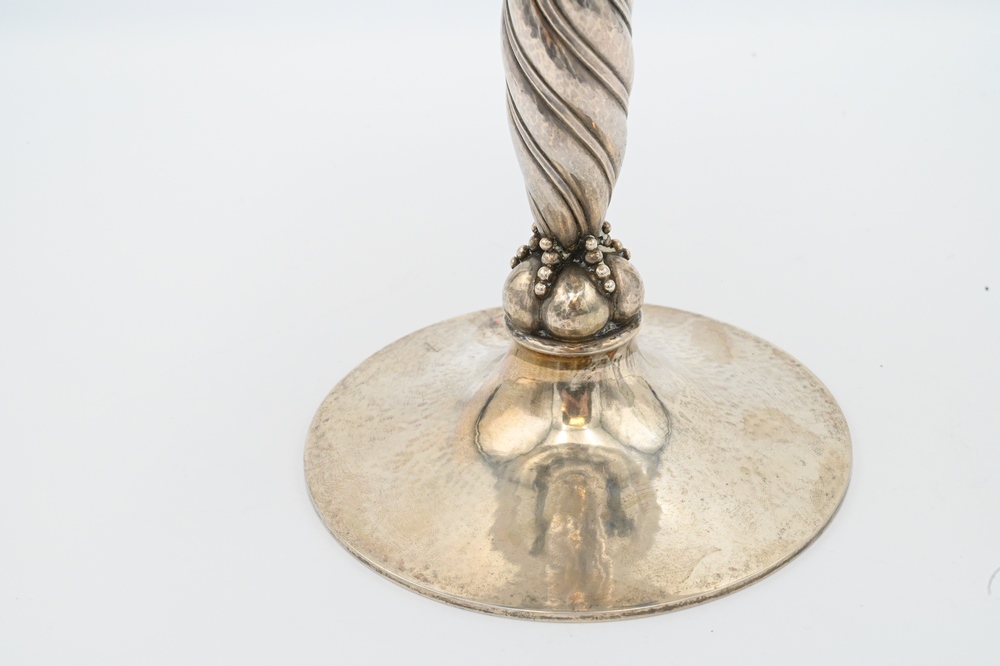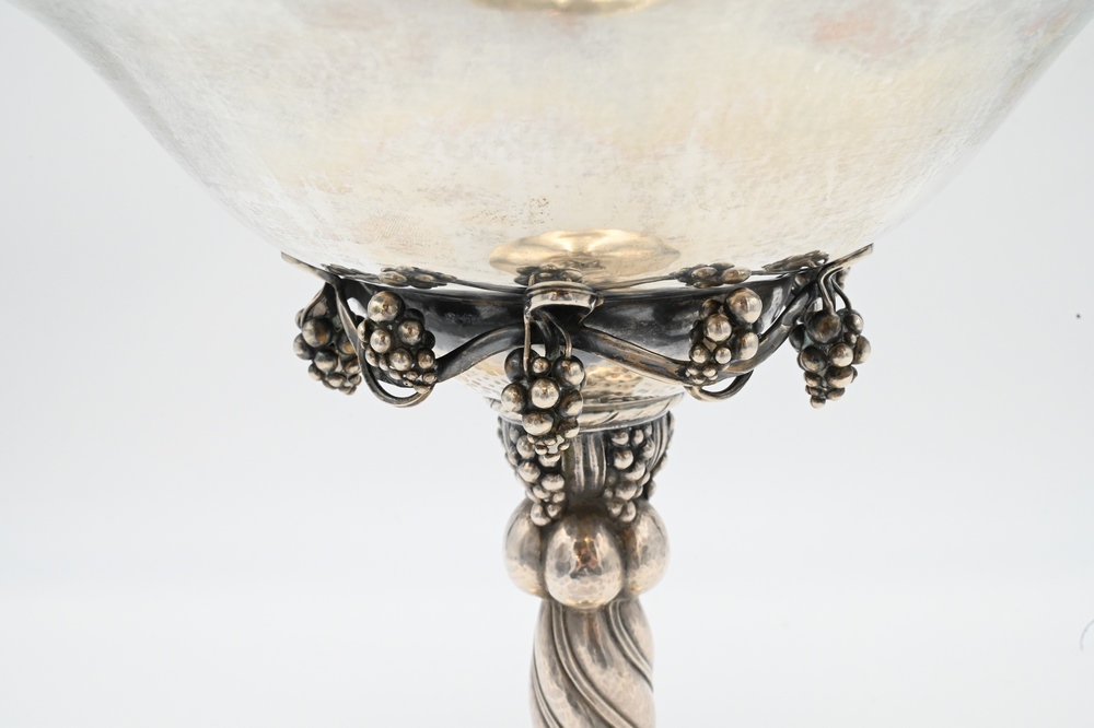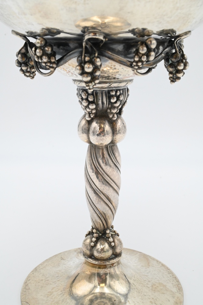 Lot 230: Georg Jensen Sterling Silver Tall Compote, grapevine pattern, marked with “G. Denmark Sterling” on bottom, height 10 3/4 inches, 37….