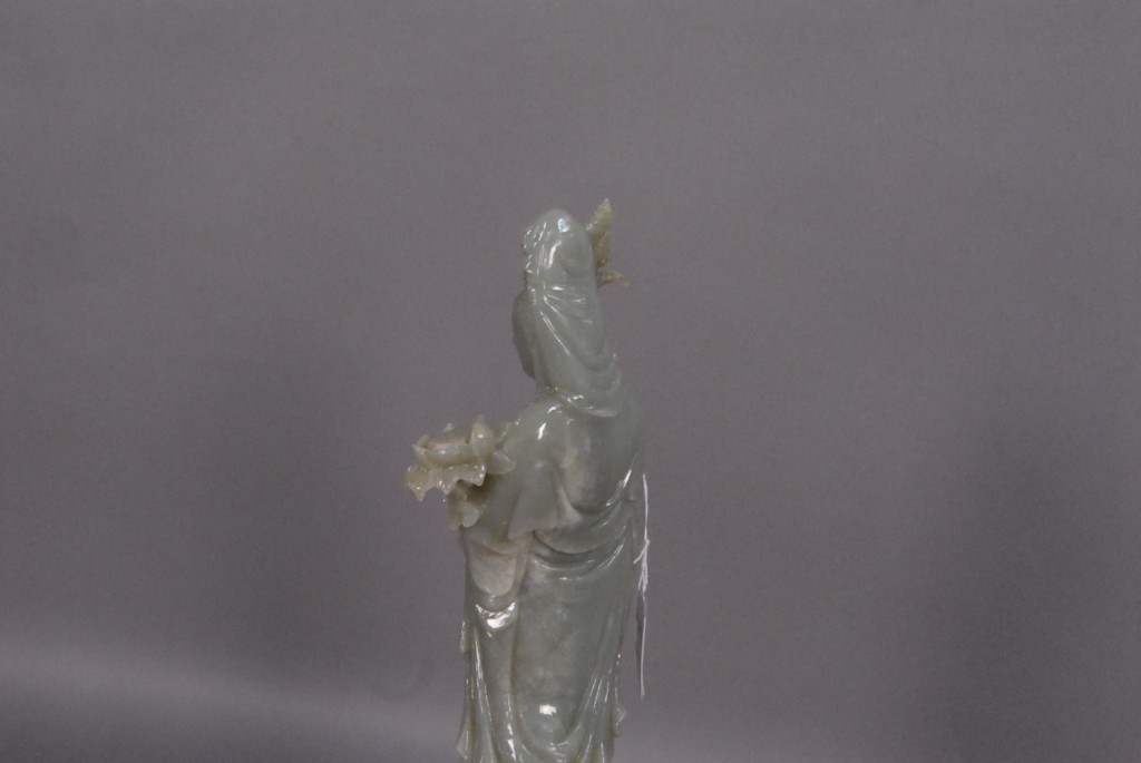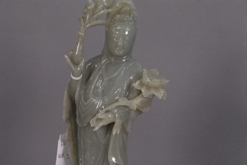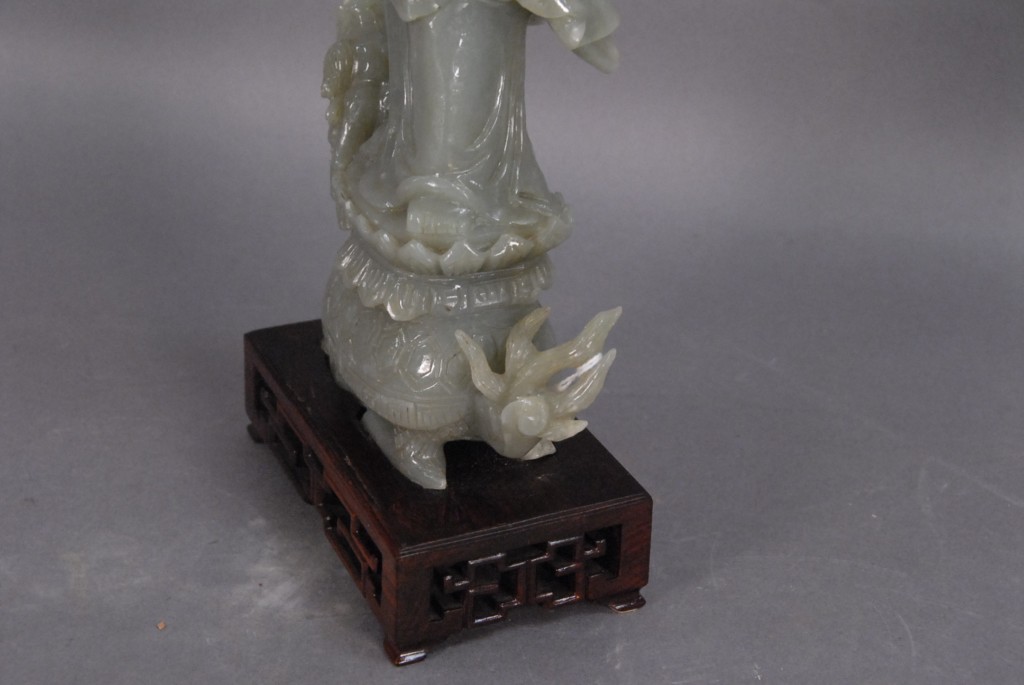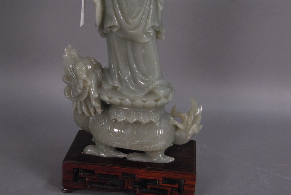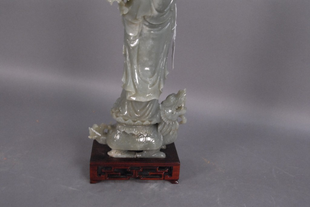 Lot 230: Large celadon jade guanyin holding wild flowers in each hand, standing on dragon figure with a lotus on his back with a hardwood sta…