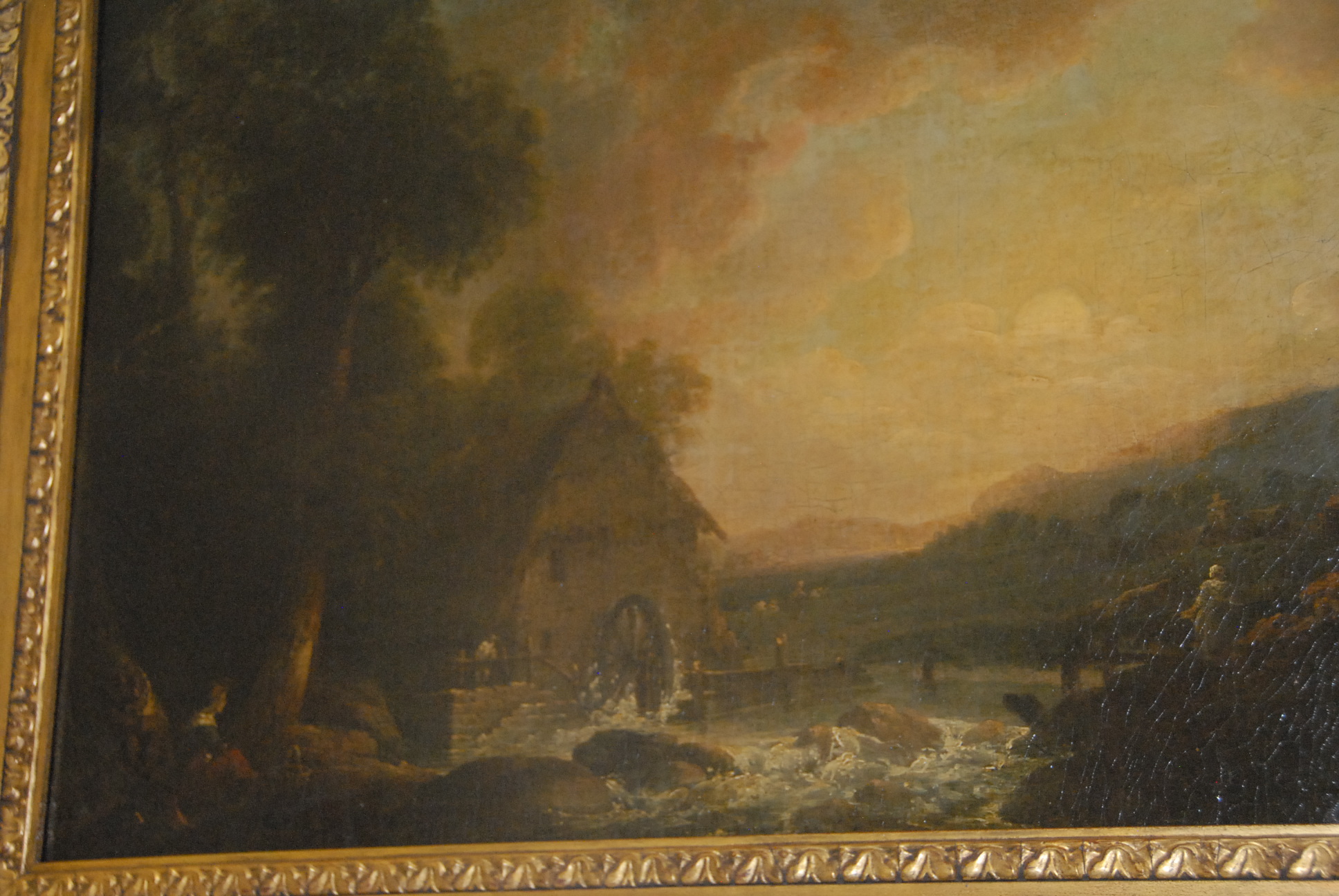 Oil on canvas landscape with water mill, unsigned, restretched and relined.
