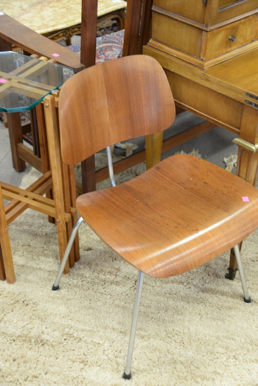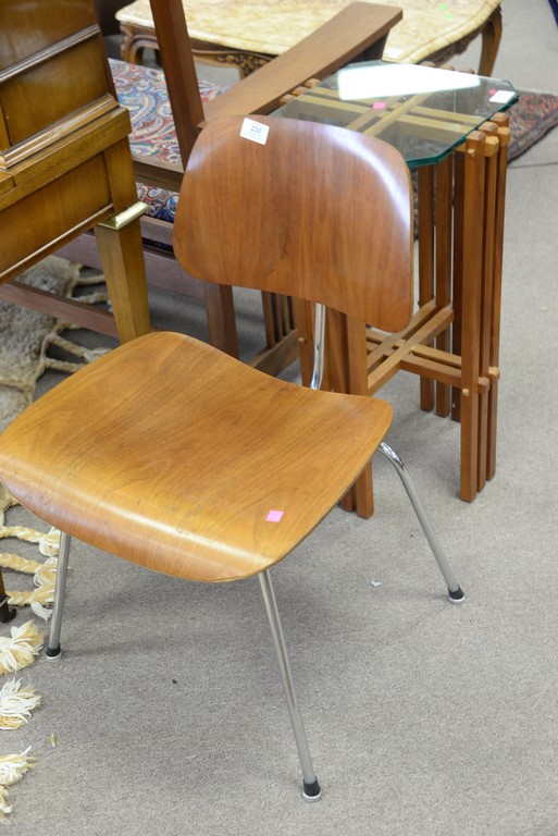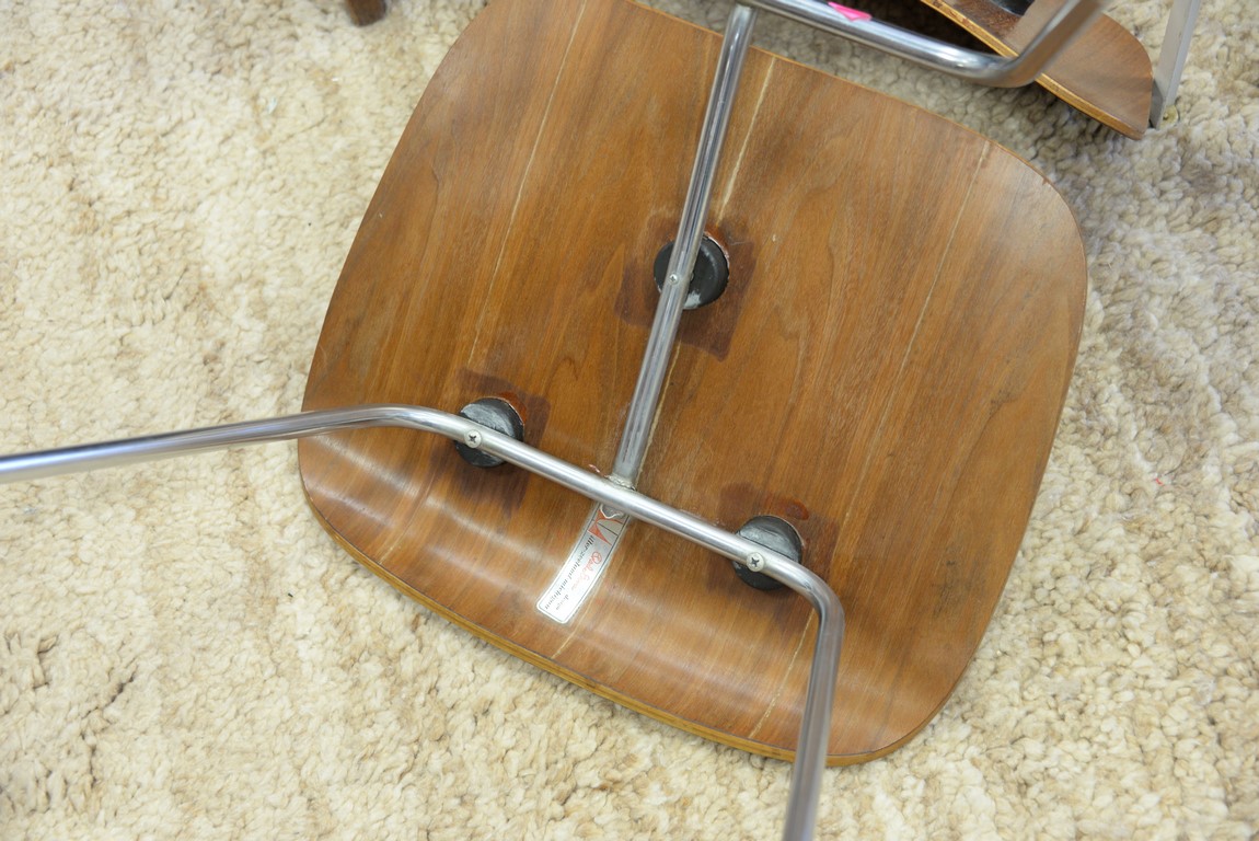 Lot 230: Pair of Eames DCM by Herman Miller dining chairs, metal and walnut with tags.