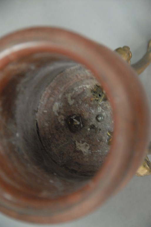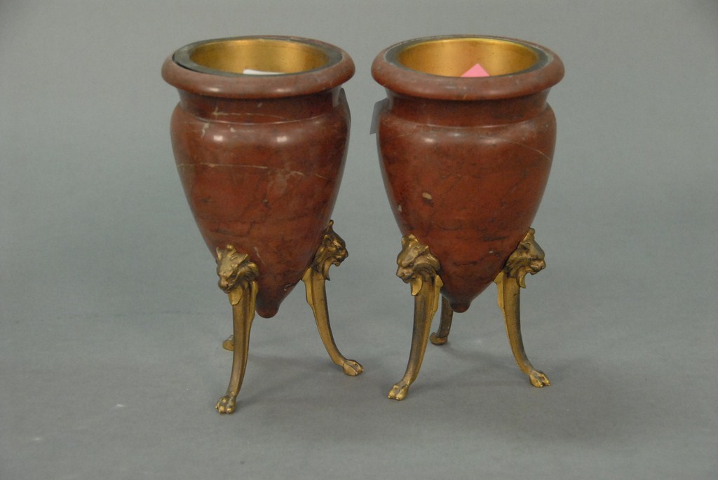 Pair of French rouge marble urns of amphora form mounted on a tripartite gilt metal base with each arm containing a ram’s head, 19th century. Provenance: From prominent Woodbridge, Connecticut family collection. ht. 8in.