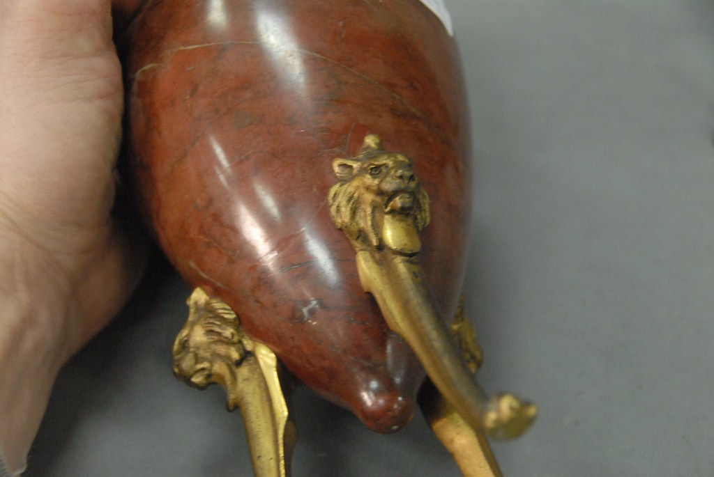 Lot 230: Pair of French rouge marble urns of amphora form mounted on a tripartite gilt metal base with each arm containing a rams head, 19th…