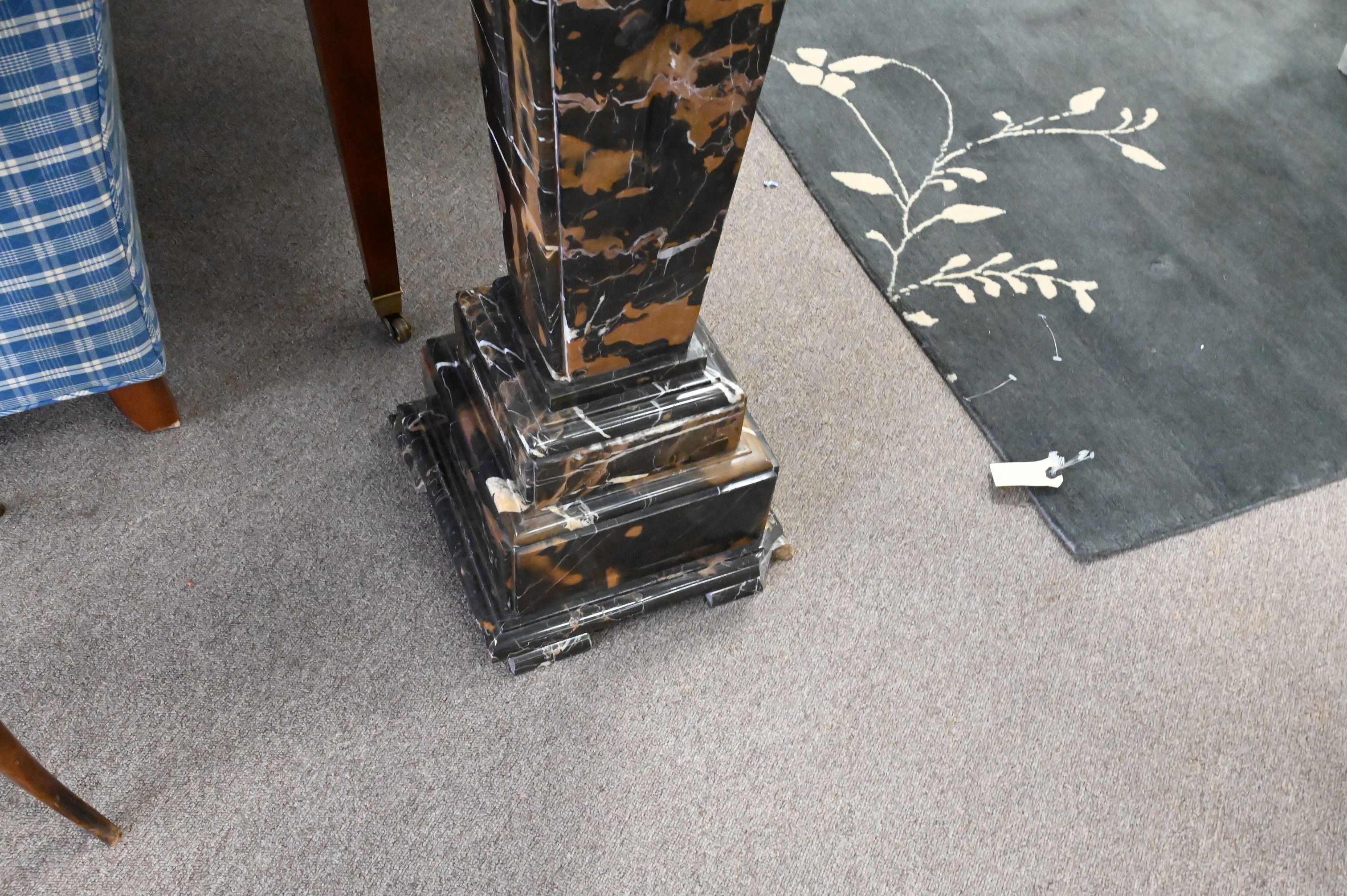 in black, gold, and white veined “Michelangelo” marble having square top over fluted tapering body traveling down to tiered base all over four feet, some chips to feet
