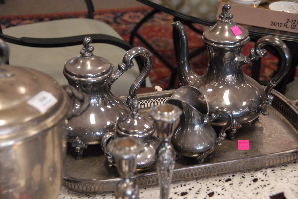 Silverplate lot with two tea sets, ice bucket, pair of candlesticks, and more.