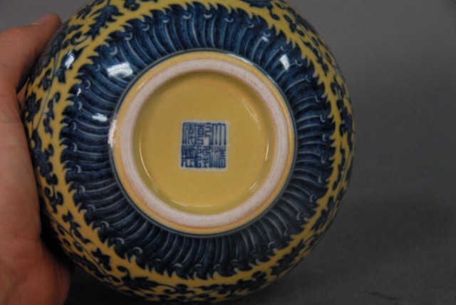 Small yellow and blue bowl having scrolling vines and lotus flowers