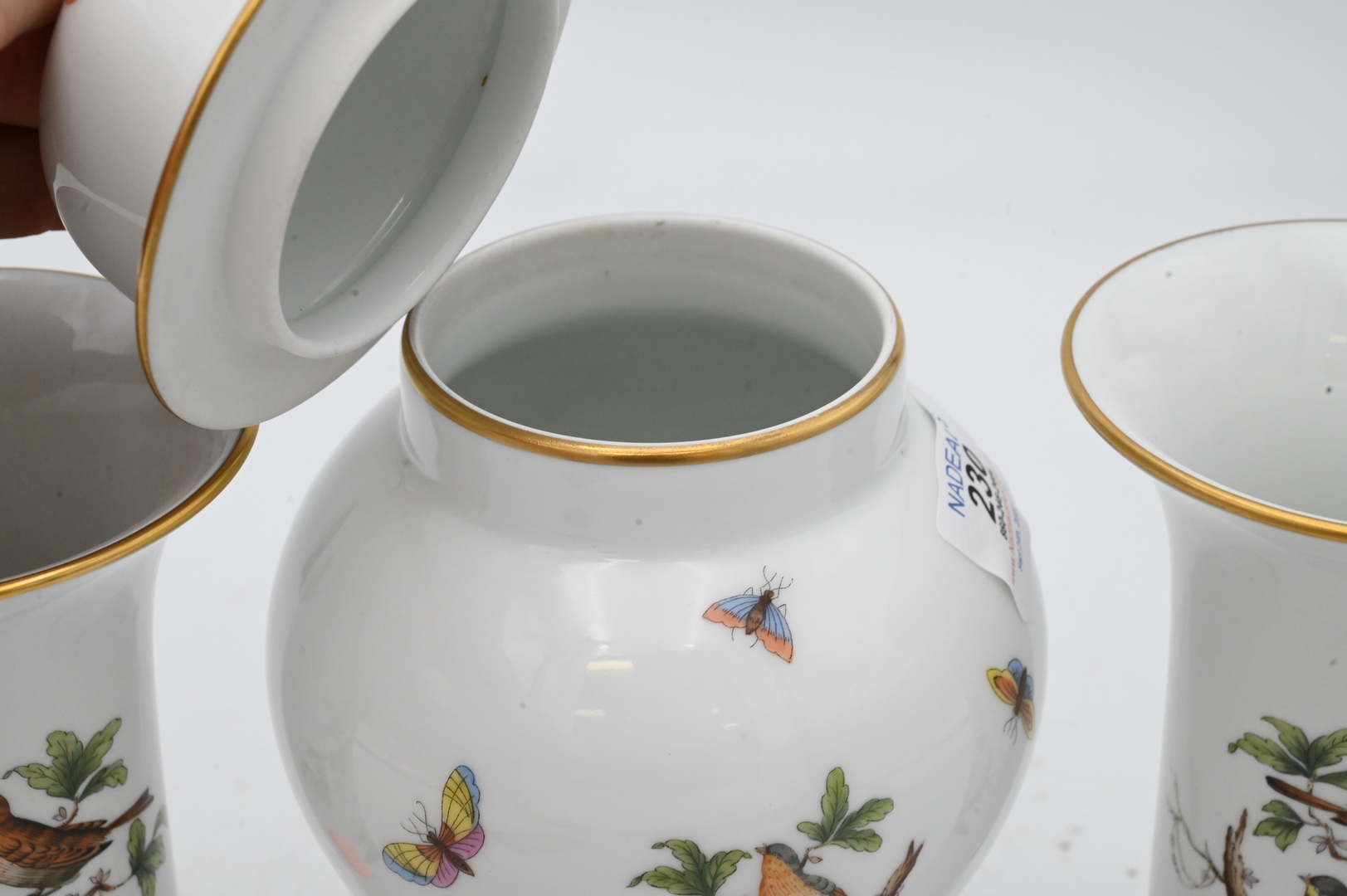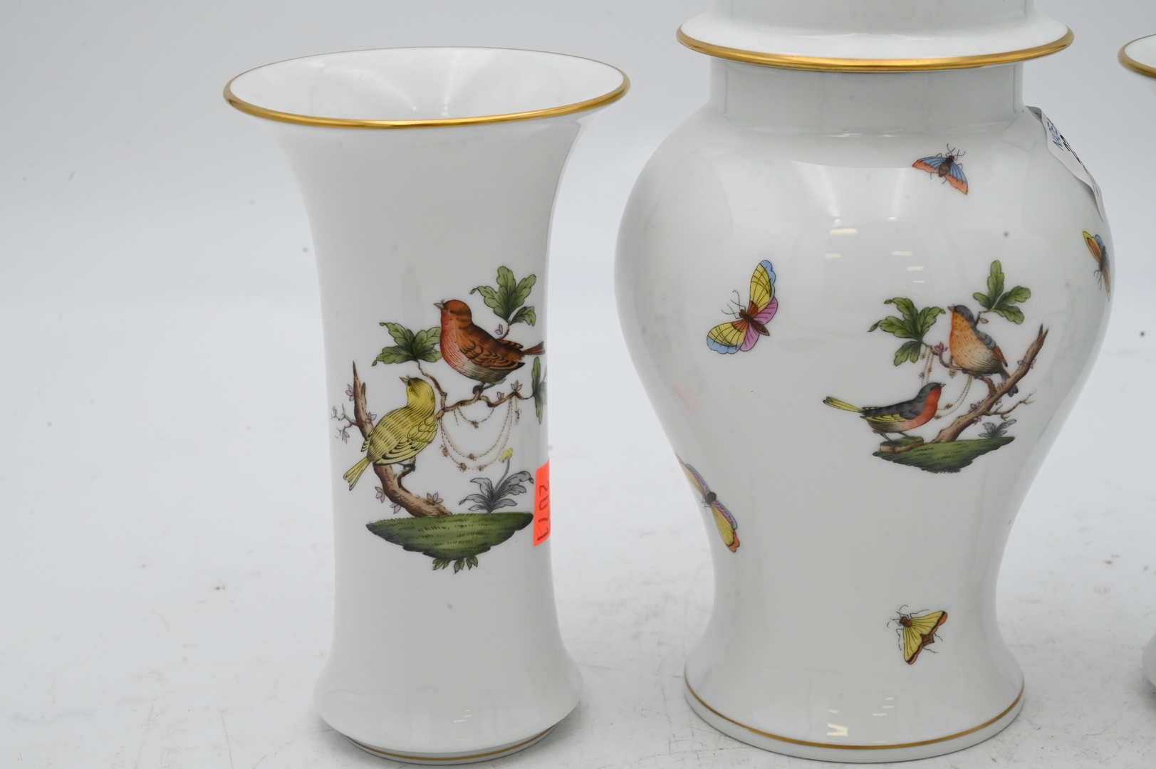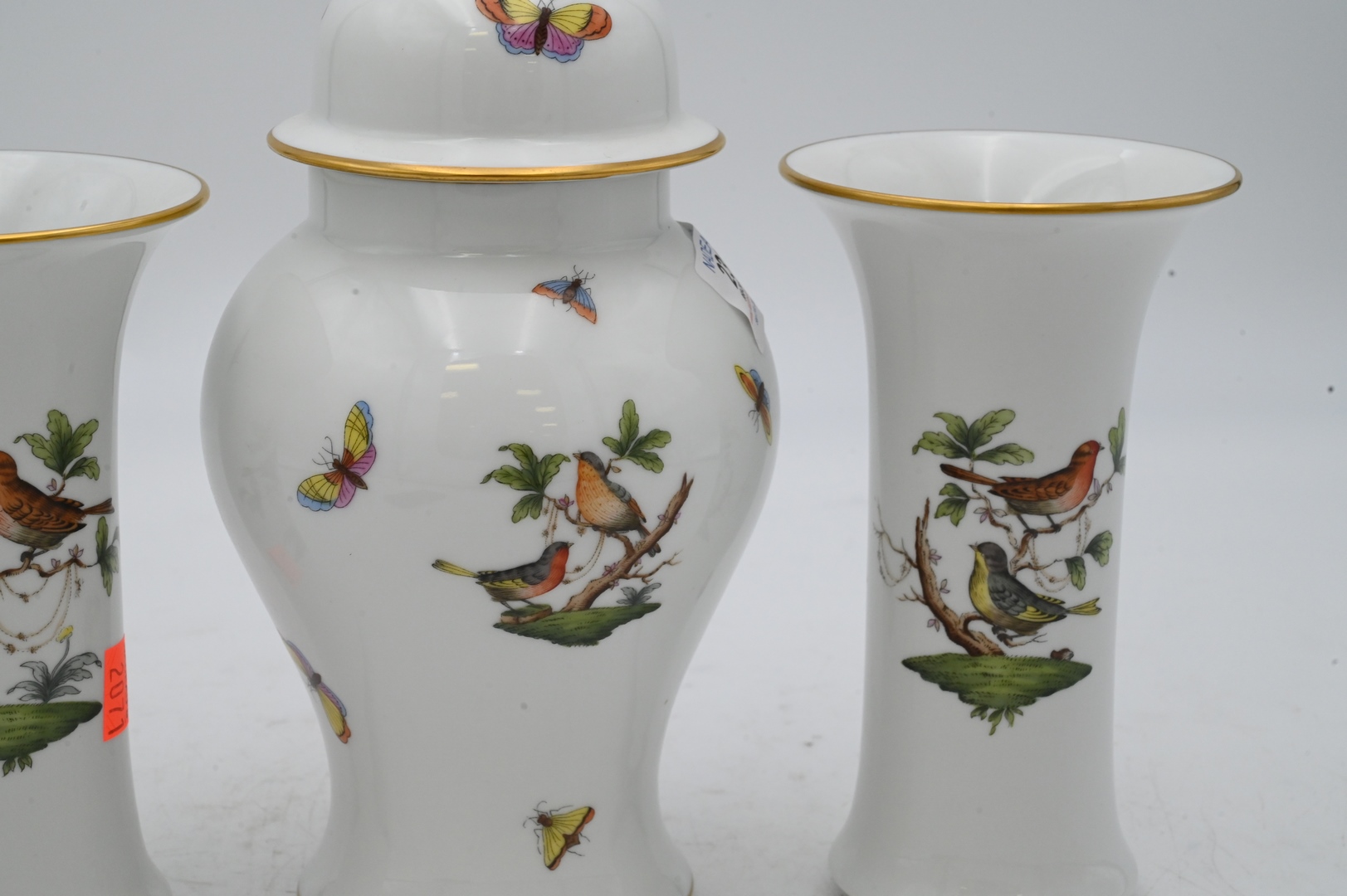 Three Piece Herend Rothschild China Lot, to include a pair of sleeve formed vases, along with a covered urn, tallest 10 inches.