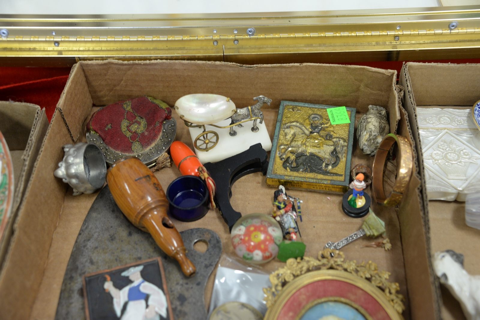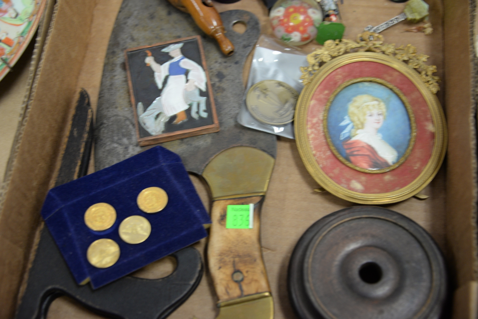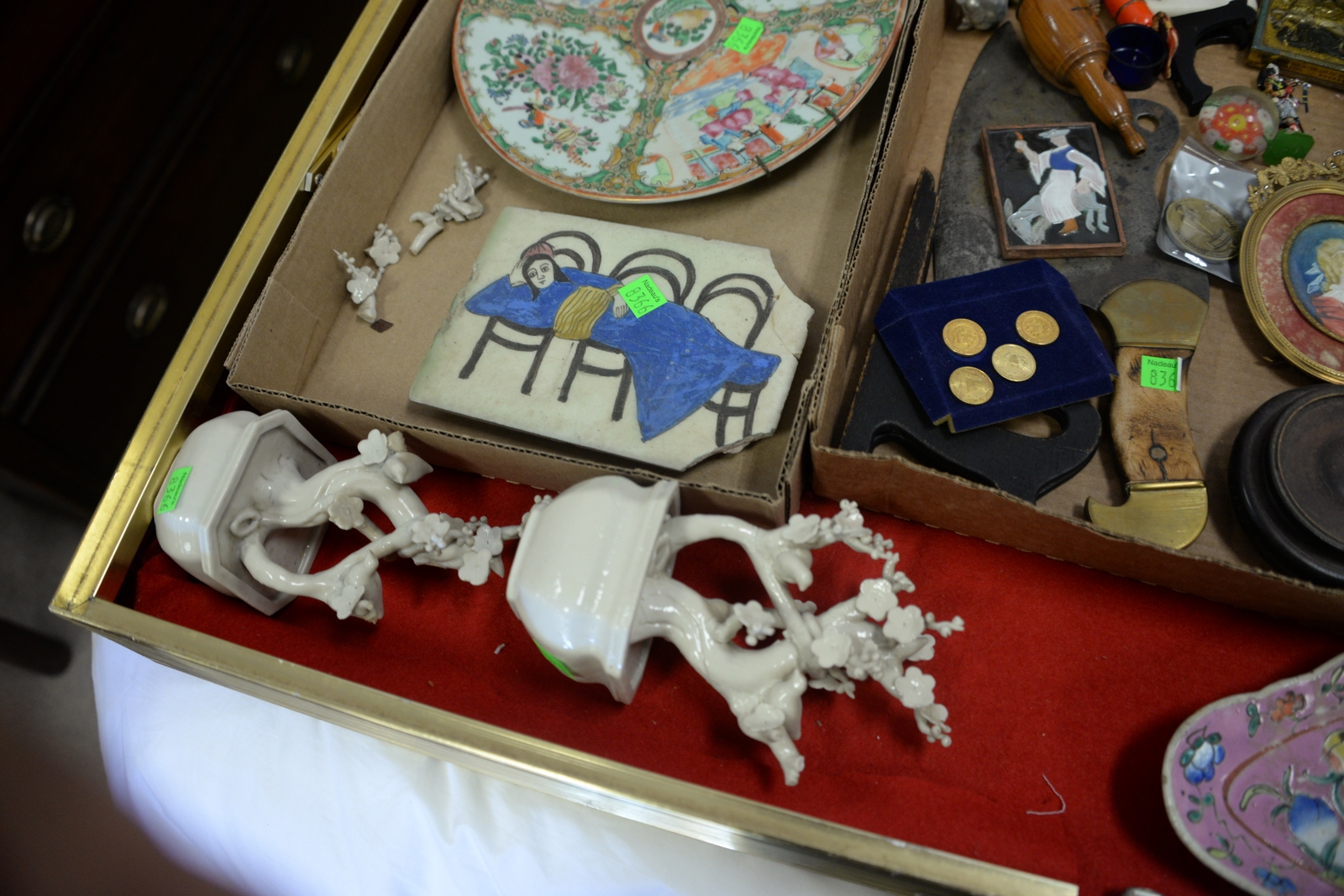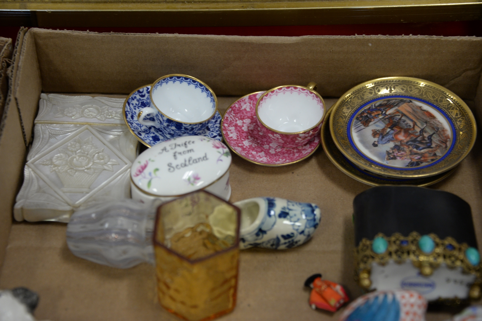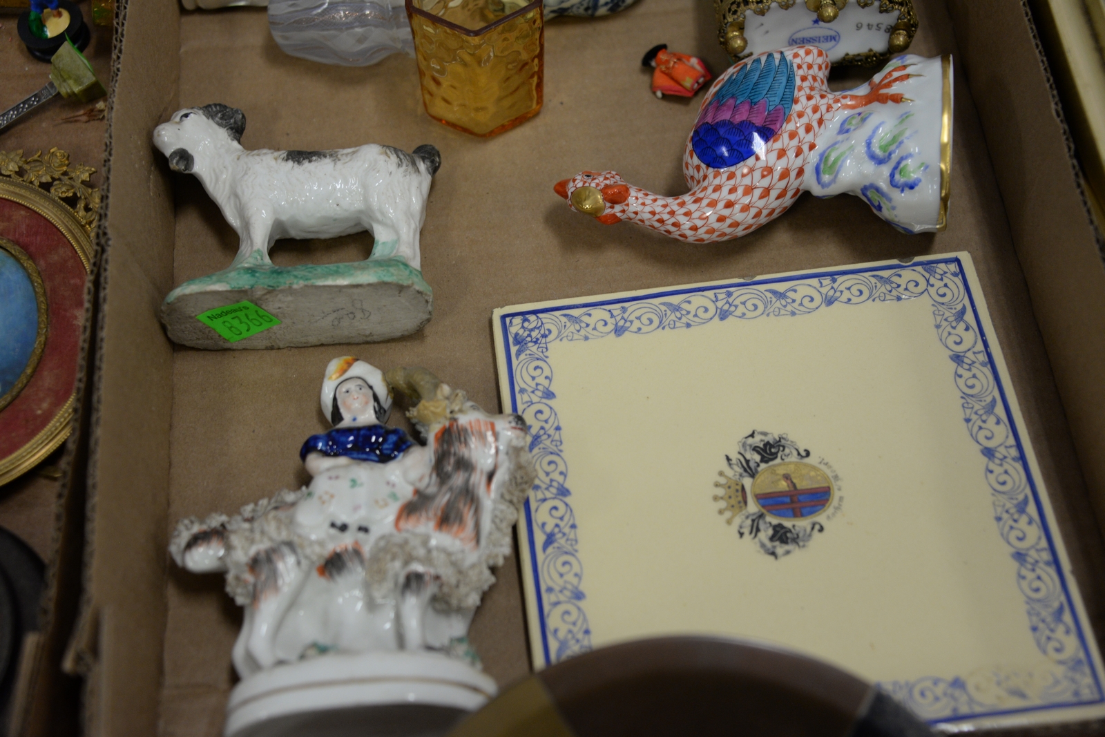 Three tray lots of Staffordshire, Herend, Rose Famille plates, Mid-Eastern partial tile, two Spode mini cups, mini painting, meat cleaver, curios, etc.