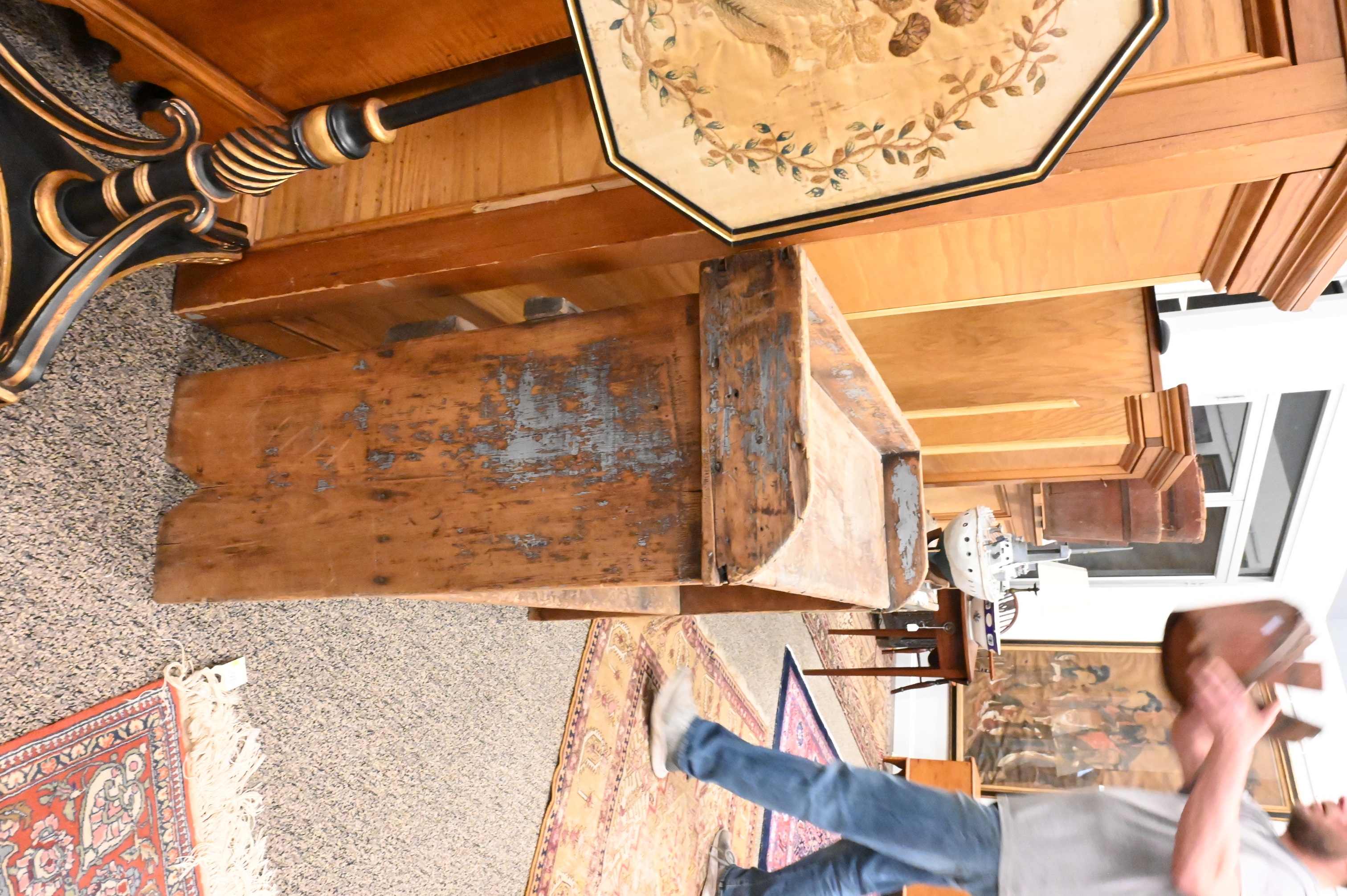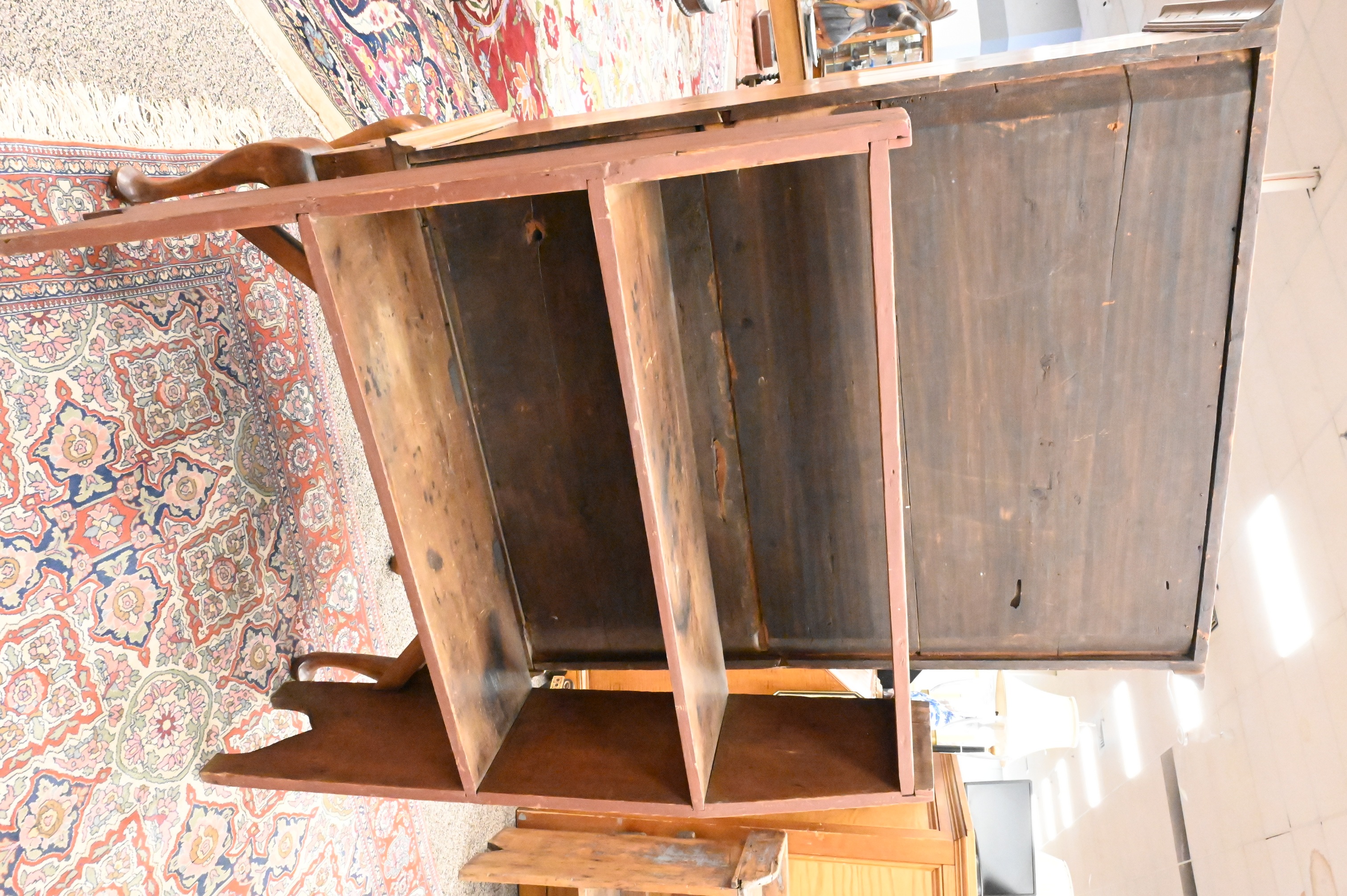 to include two individual open shelves with bootjack-form ends, of simple construction, retaining traces of old paint.