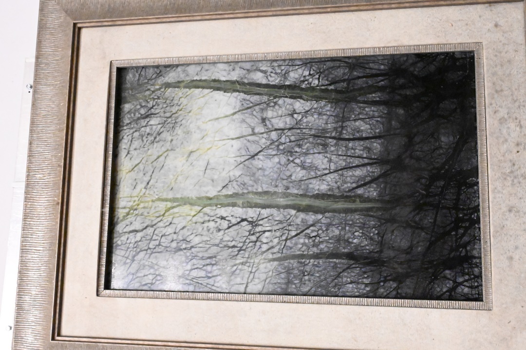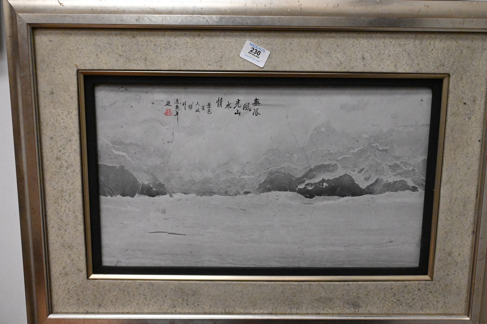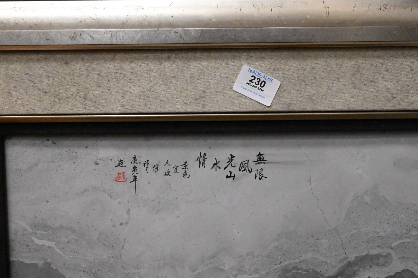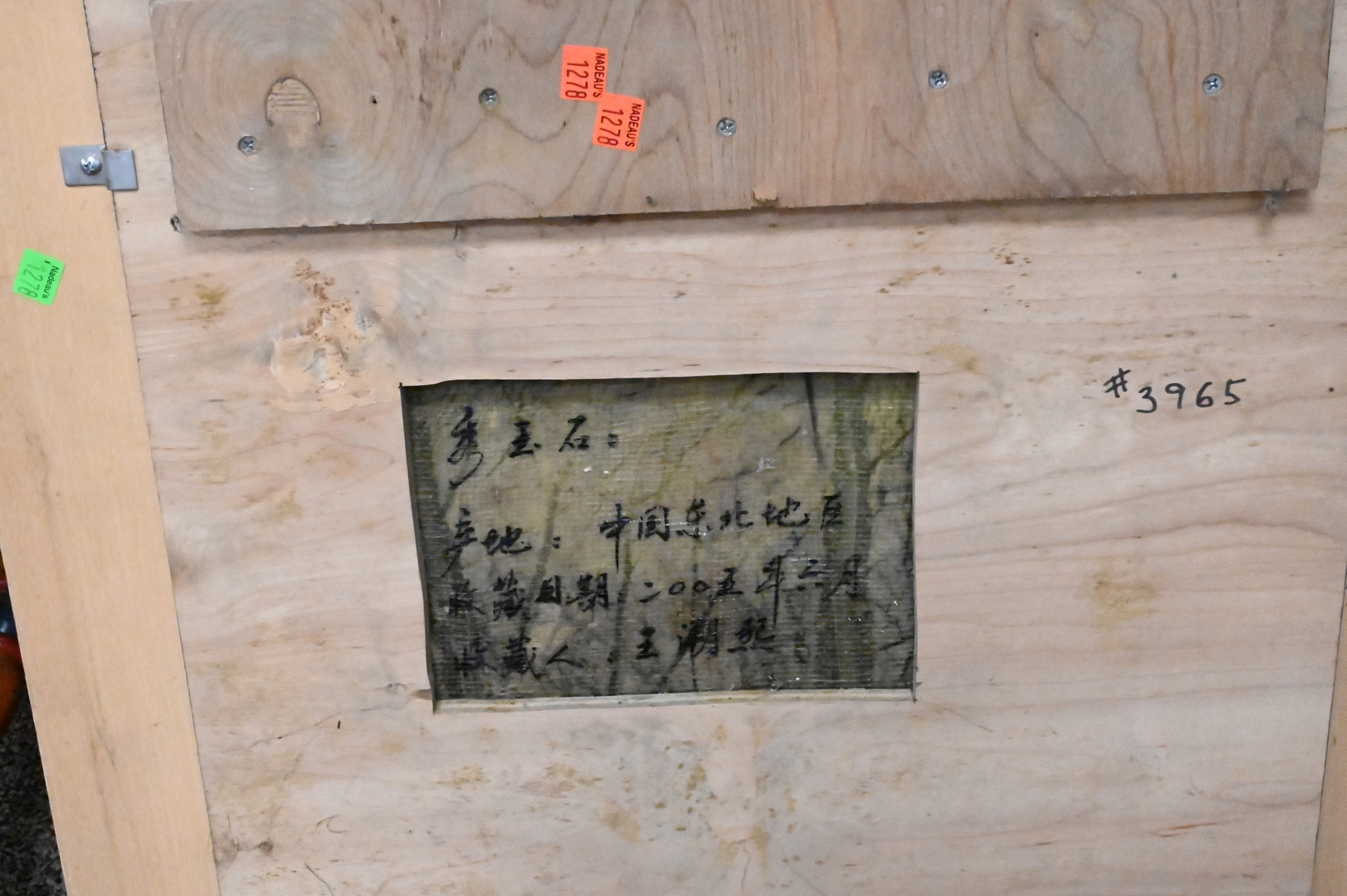 Two Framed Chinese Scholar Stones, each having Chinese characters, one having crack through stone, 20″ x 11″ and 21″ x 13 1/2″. Provenance: Estate of Peter Tillou, Litchfield, Connecticut.