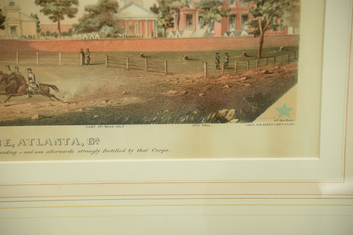 View of Public Square Atlanta, GA, handcolored lithograph, The City of Atlanta was occupied the 2nd September 1864 by the 20th Army Corps, Major General Slocum, commanding and was afterwards strongly fortified by the corps by Lieutenant N.B. Abbott and published in New York by Henry C. End circa 1865. sight size 15 x 22 1/2 Provenance: Property from Credit Suisse’s Americana Collection