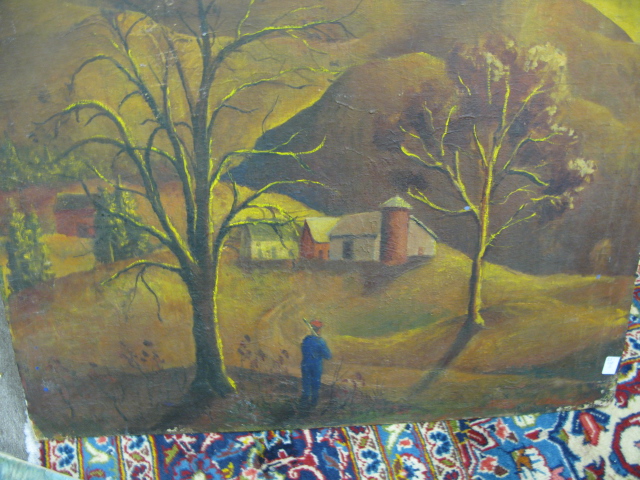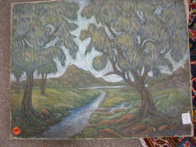 3 piece lot, oil on canvas of a landscape with brook & trees signed S. Jurtis, 2 paintings, one on canvas, one on board