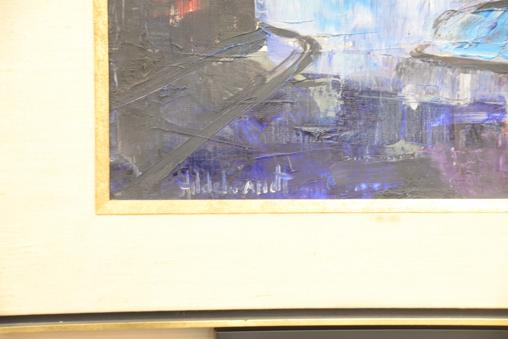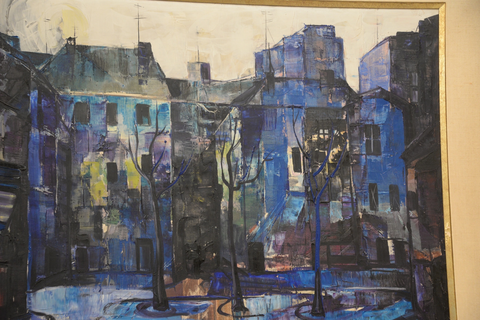 Bert Hildebrandt (Belgian, 1906 – 1974), Cityscape (No. 504), oil on canvas, signed lower left, 31 1/2″ x 39 1/2″. Provenance: The Estate of Alina Roisen, Park Avenue, New York.