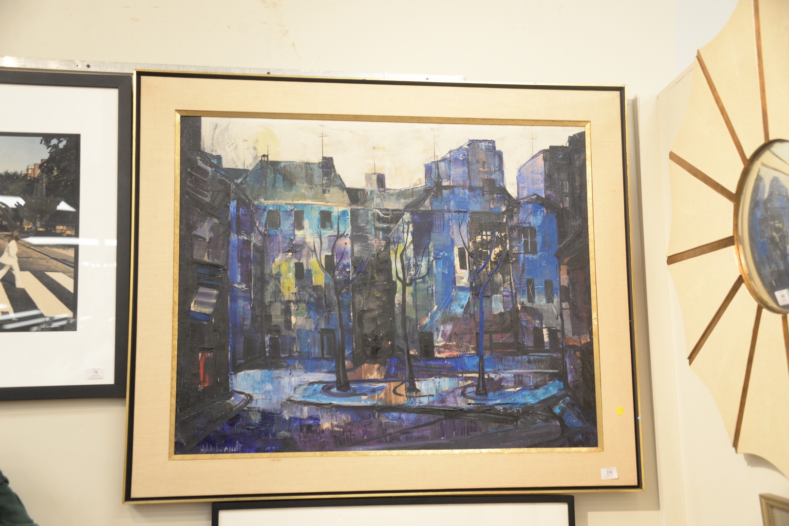 Lot 231: Bert Hildebrandt (Belgian, 1906 – 1974), Cityscape (No. 504), oil on canvas, signed lower left, 31 1/2″ x 39 1/2″. Provenance: The Estate of Alina Roisen, Park Avenue, New York.