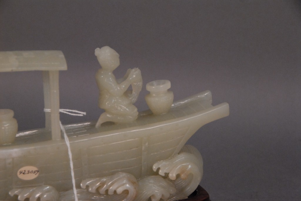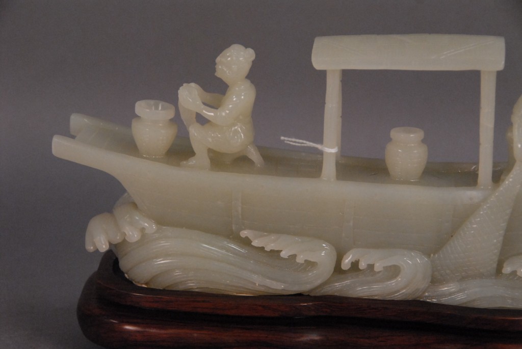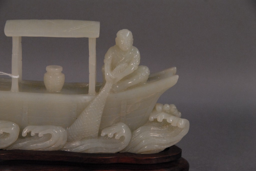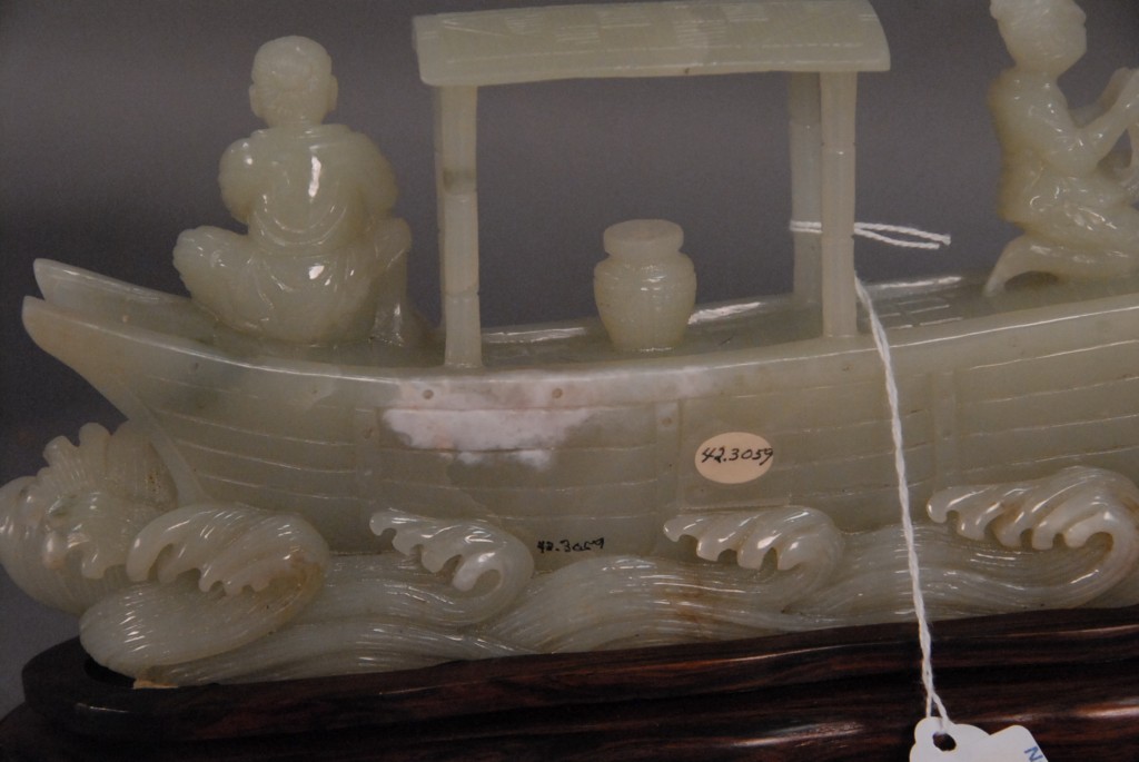Lot 231: Carved jade boat with two carved fishermen on a wood base, lg. 10, ht. 5.