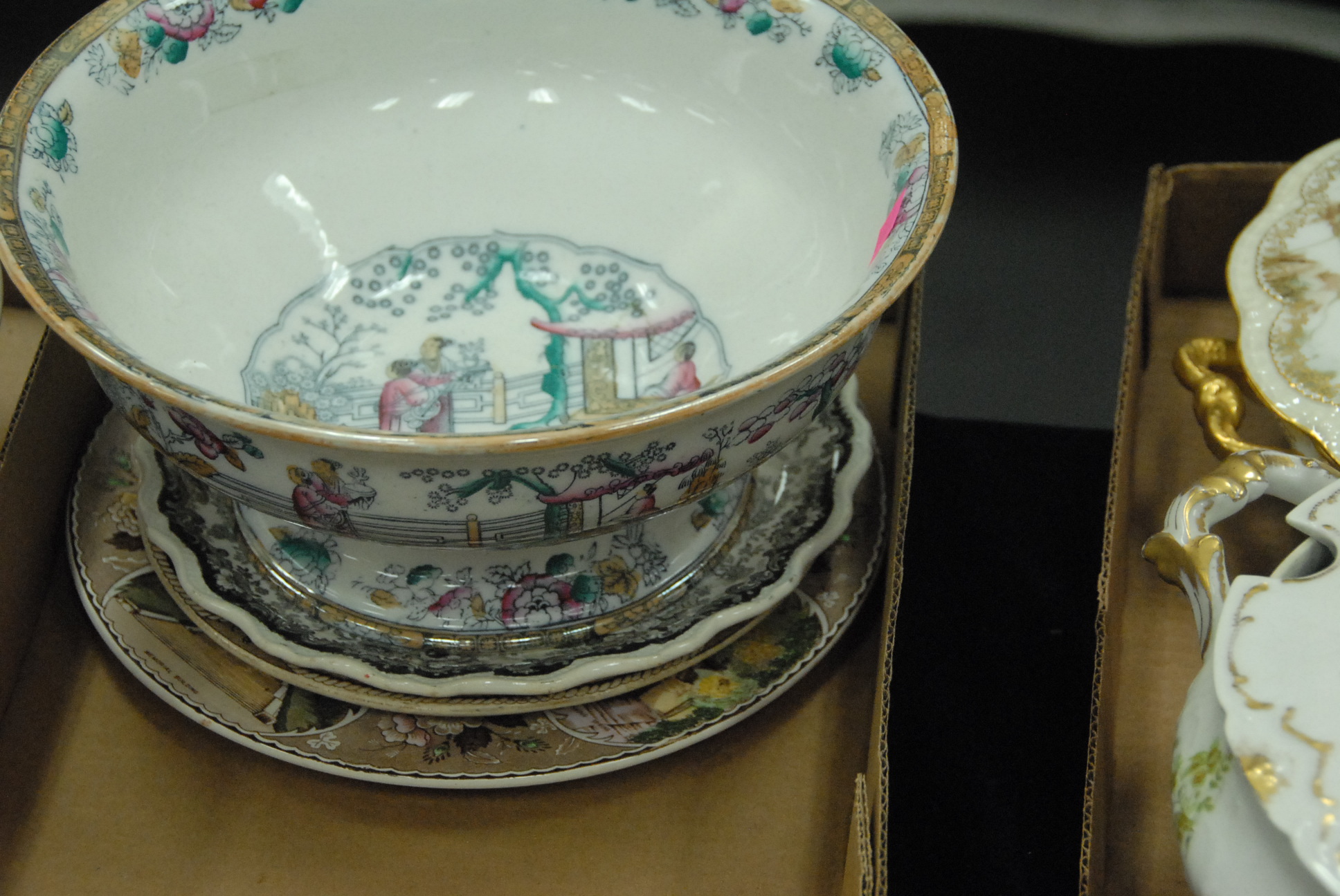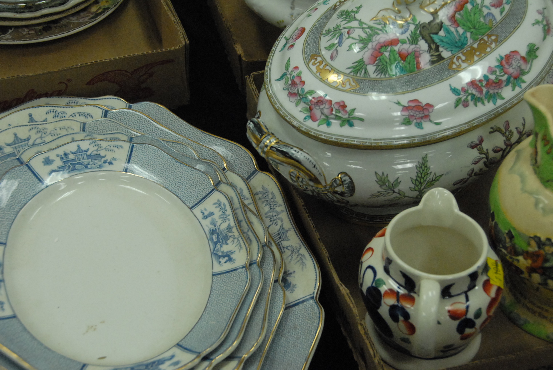 Four box lots including three covered tureens, Staffordshire, and platters.