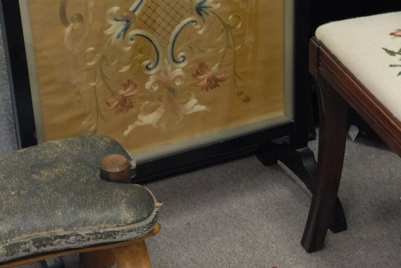 Group lot to include a camel saddle, firescreen, side chair and corner shelf