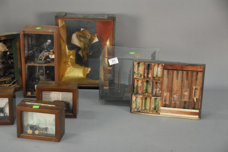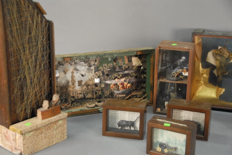 Group of nine sculptures and shadow boxes.