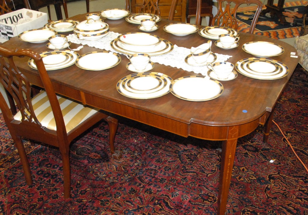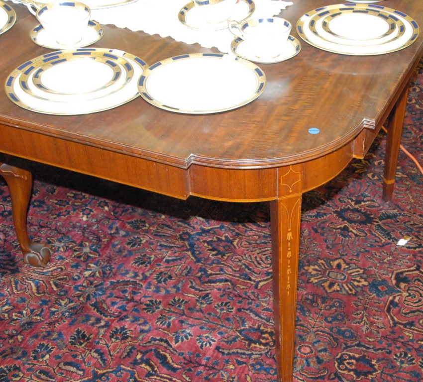 Margolis mahogany Federal style dining table with D shaped ends on square tapered legs with bell flower inlays and rack of four 12inch leaves, table top completely of fiddle back mahogany. length 66in. width 45in. opens to 114in.