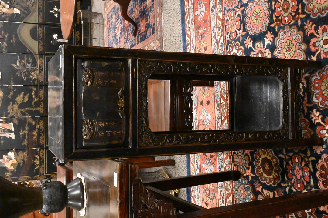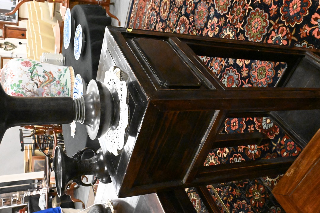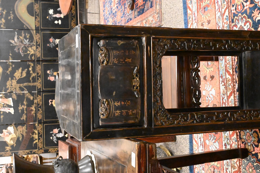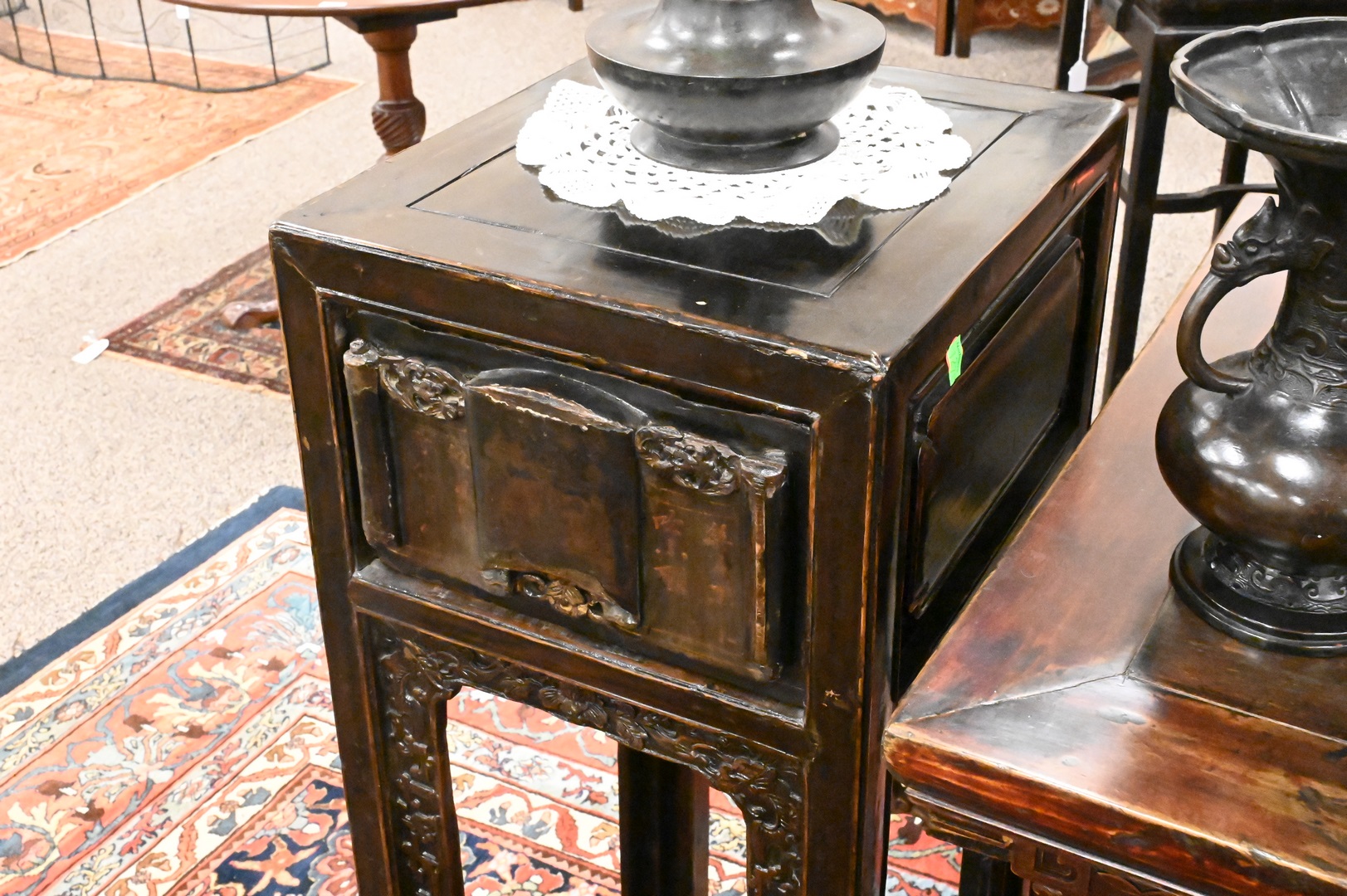 Pair of Chinese Tall Fern Stands, each having writing on fronts, height 41 1/2 inches, top 13 1/4″ x 14 3/4″. Provenance: Estate of Peter Tillou, Litchfield, Connecticut.