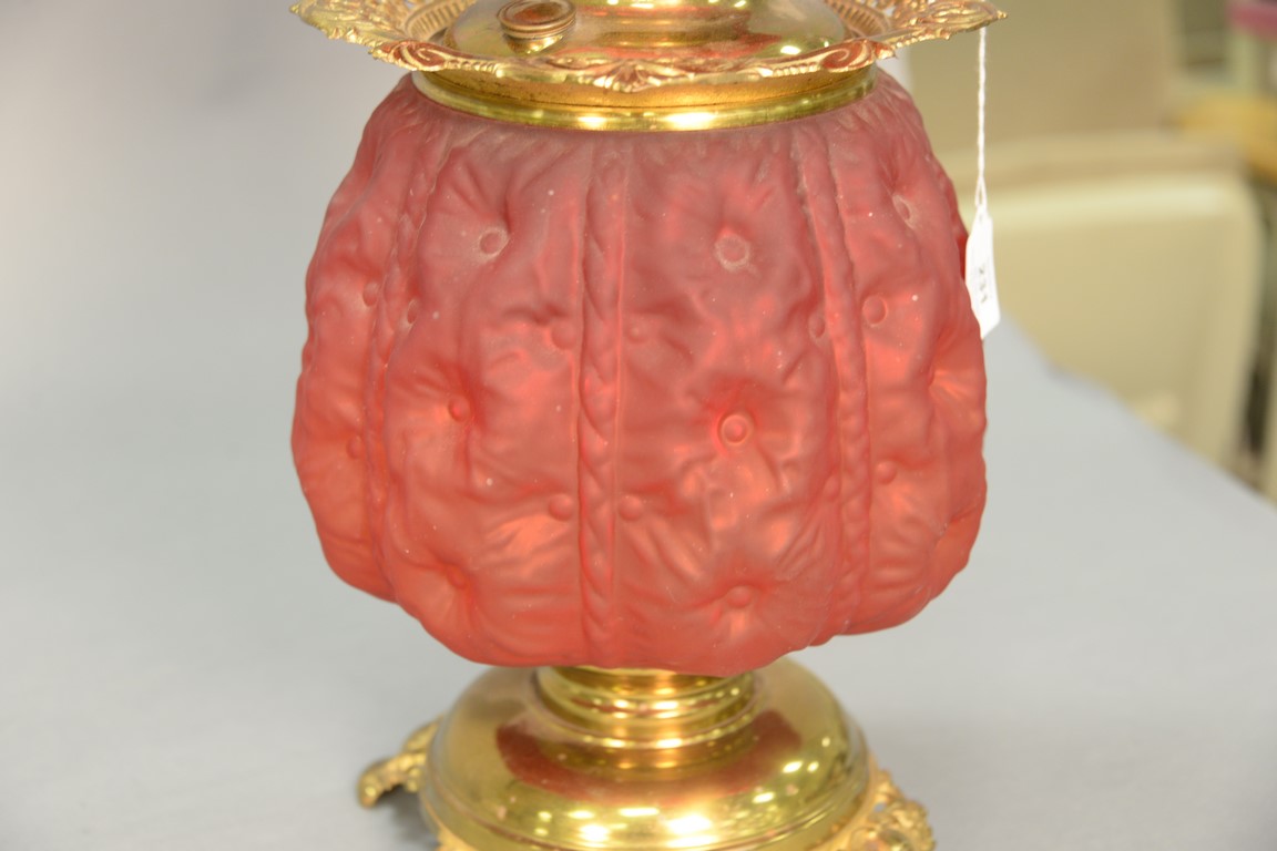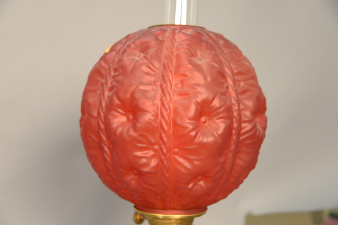 Red satin glass Gone with the Wind oil lamp. ht. 28 in.