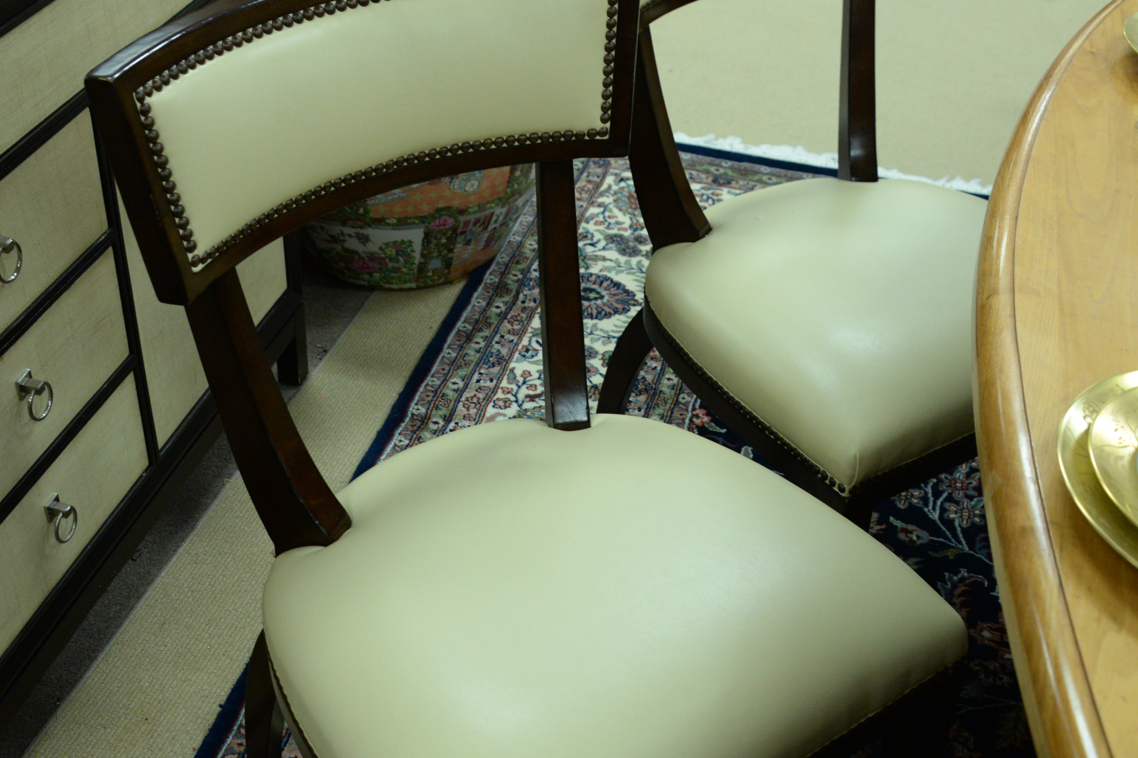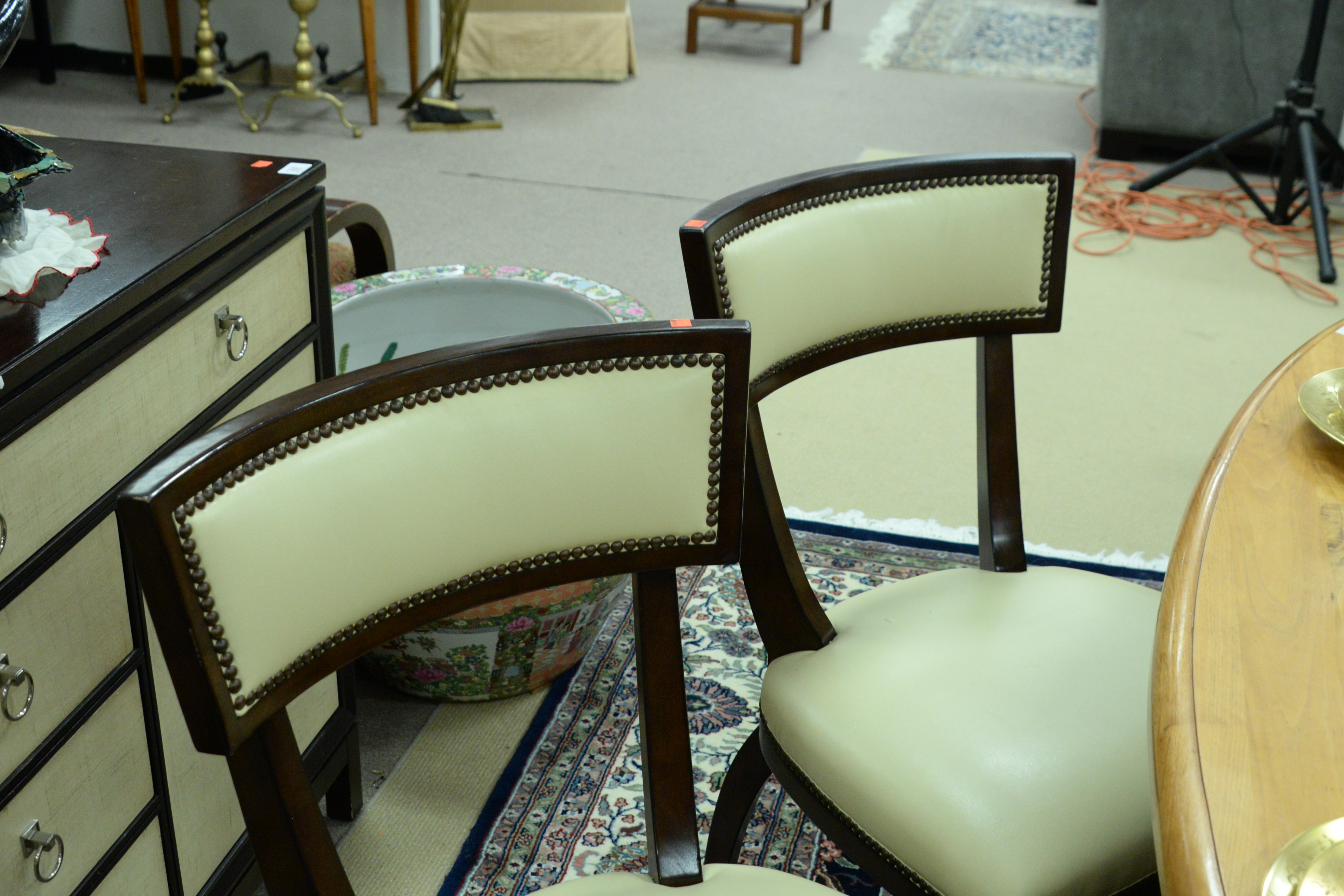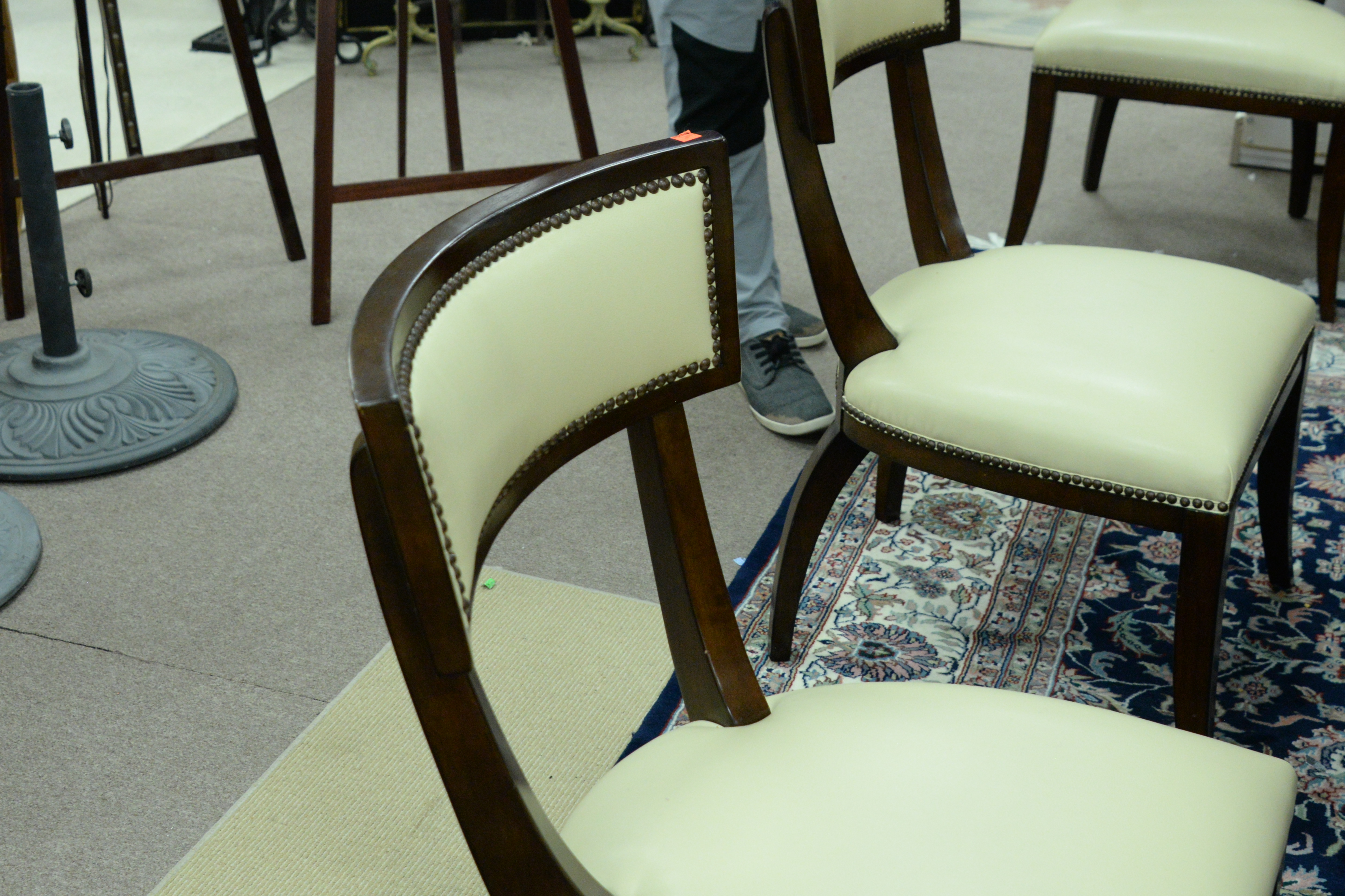 Set of Eight Contemporary Dining Chairs, with vinyl upholstered seats and backs, one leg repaired, height 35 inches