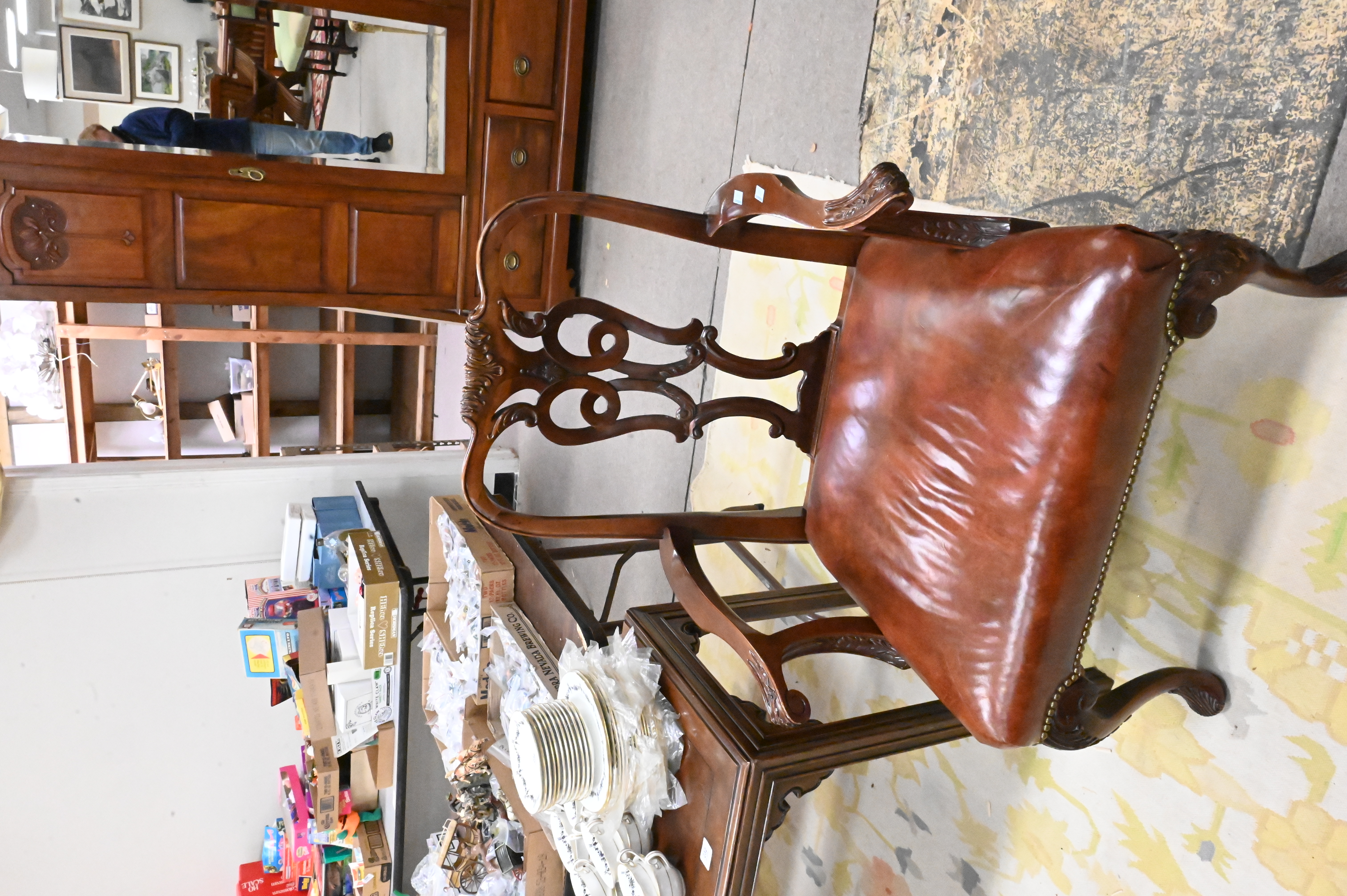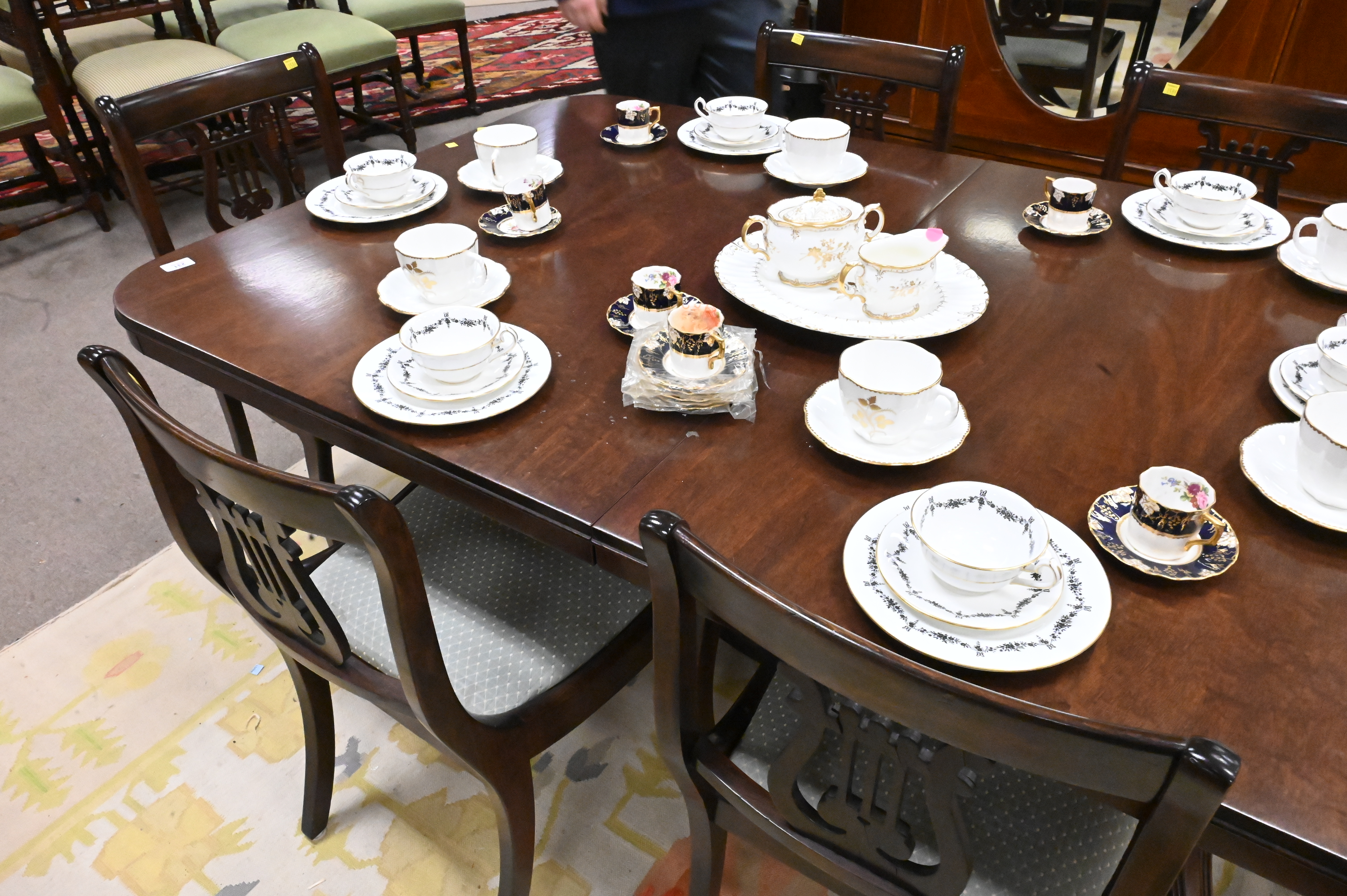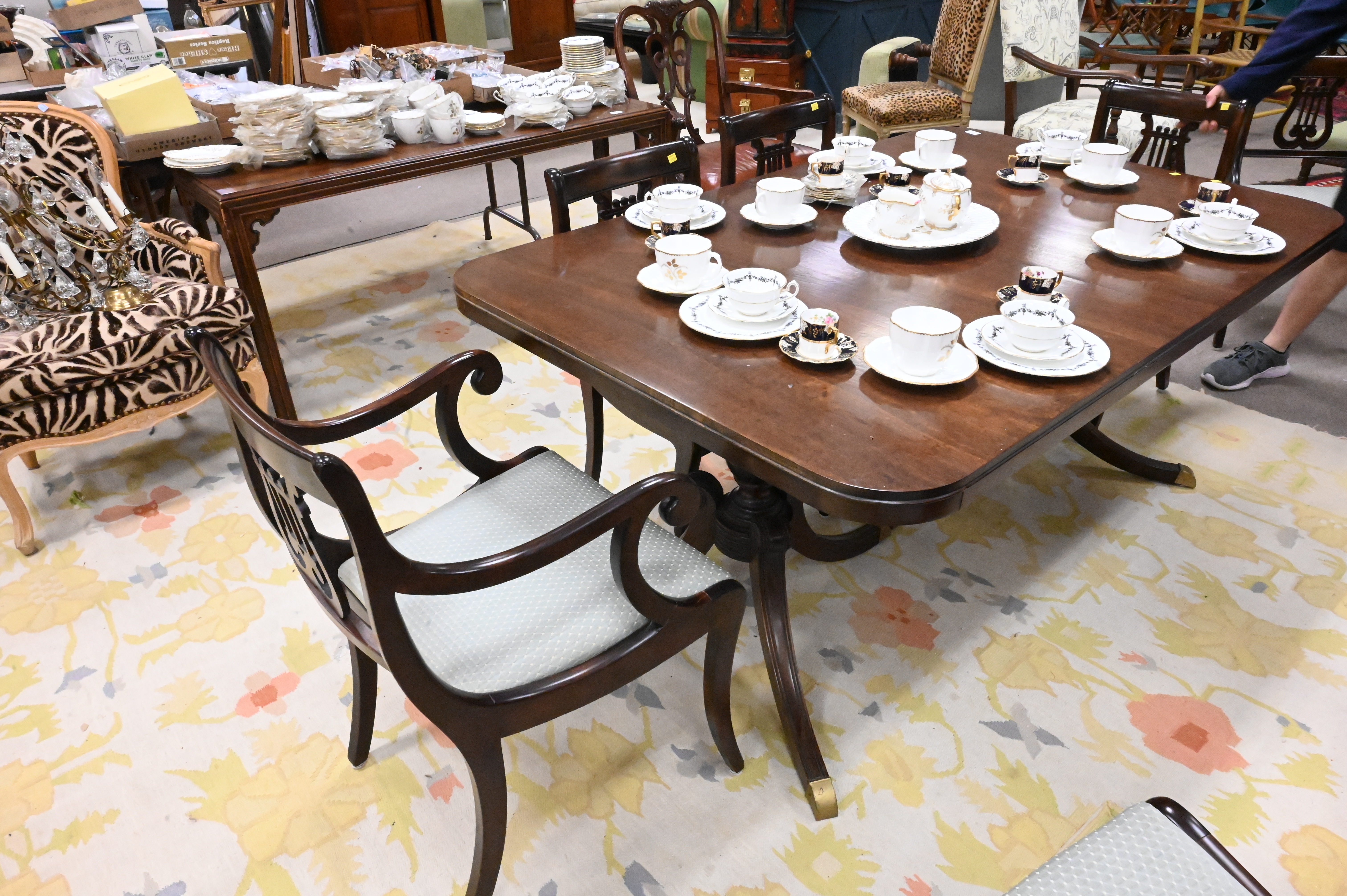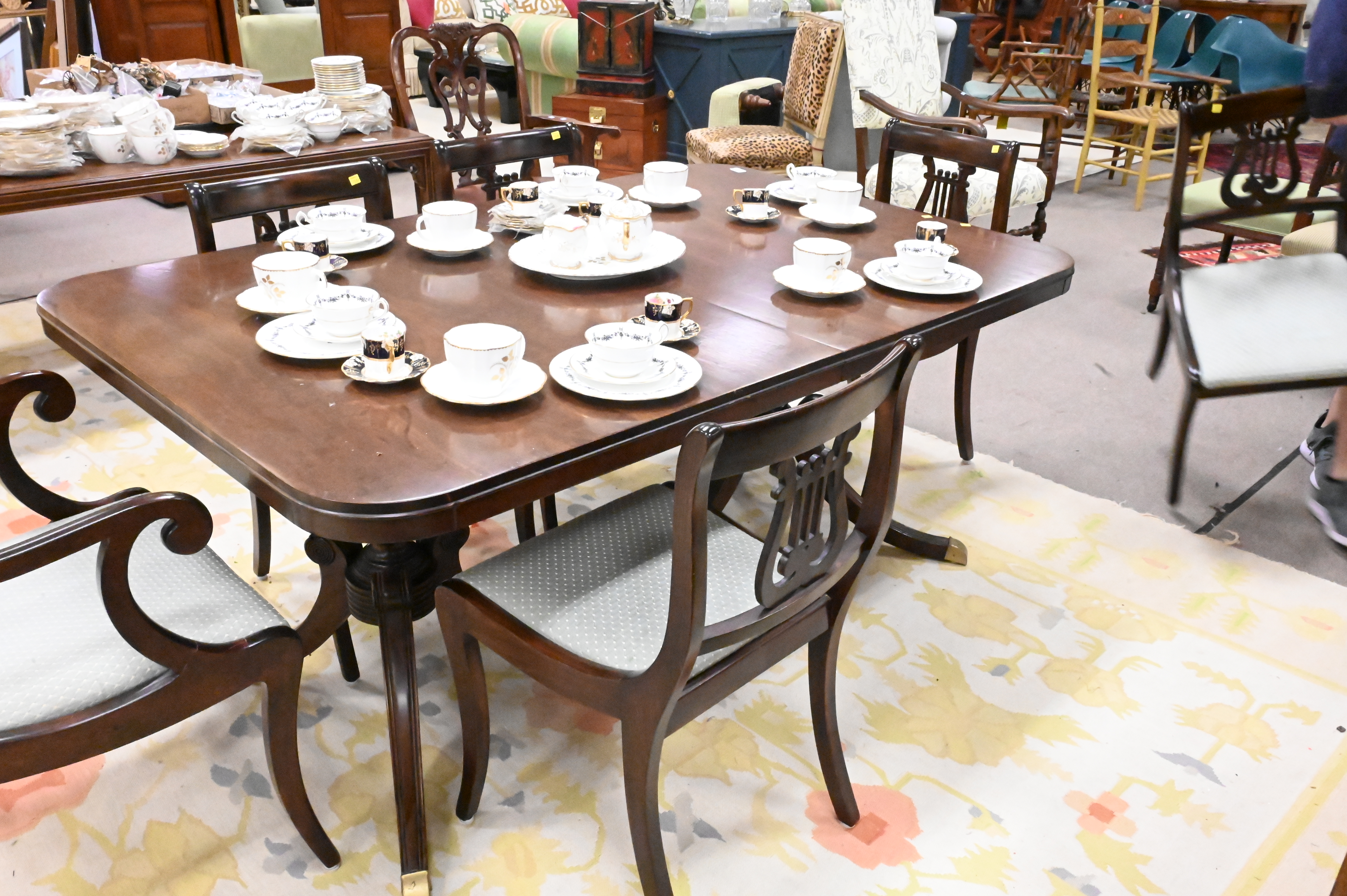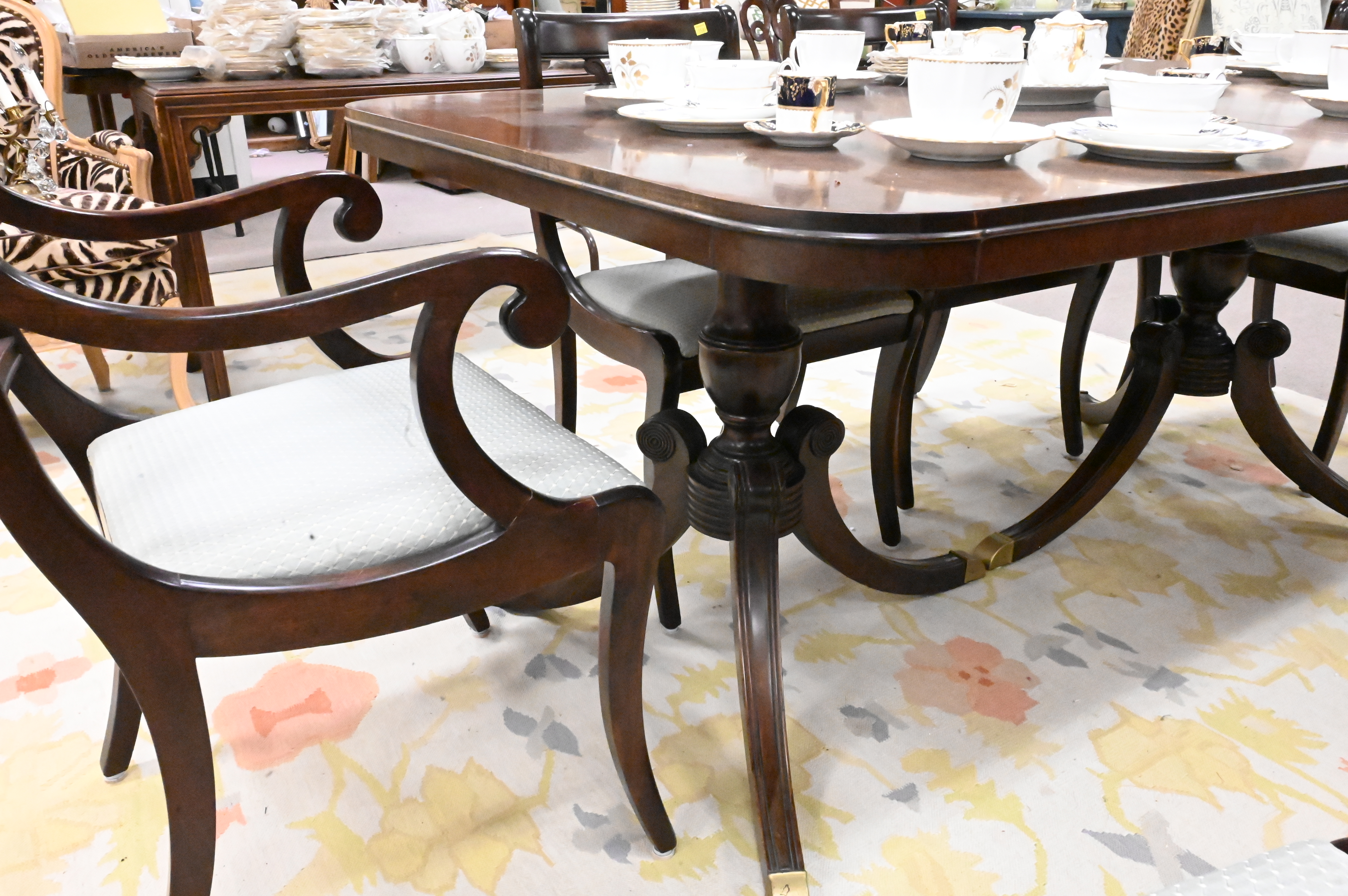 Seven Piece Mahogany Dining Set, to include a double pedestal table, six chairs, along with 12 inch leaves and pads, height 28 inches, top 41″ x 66″, when open 41″ x 102″.