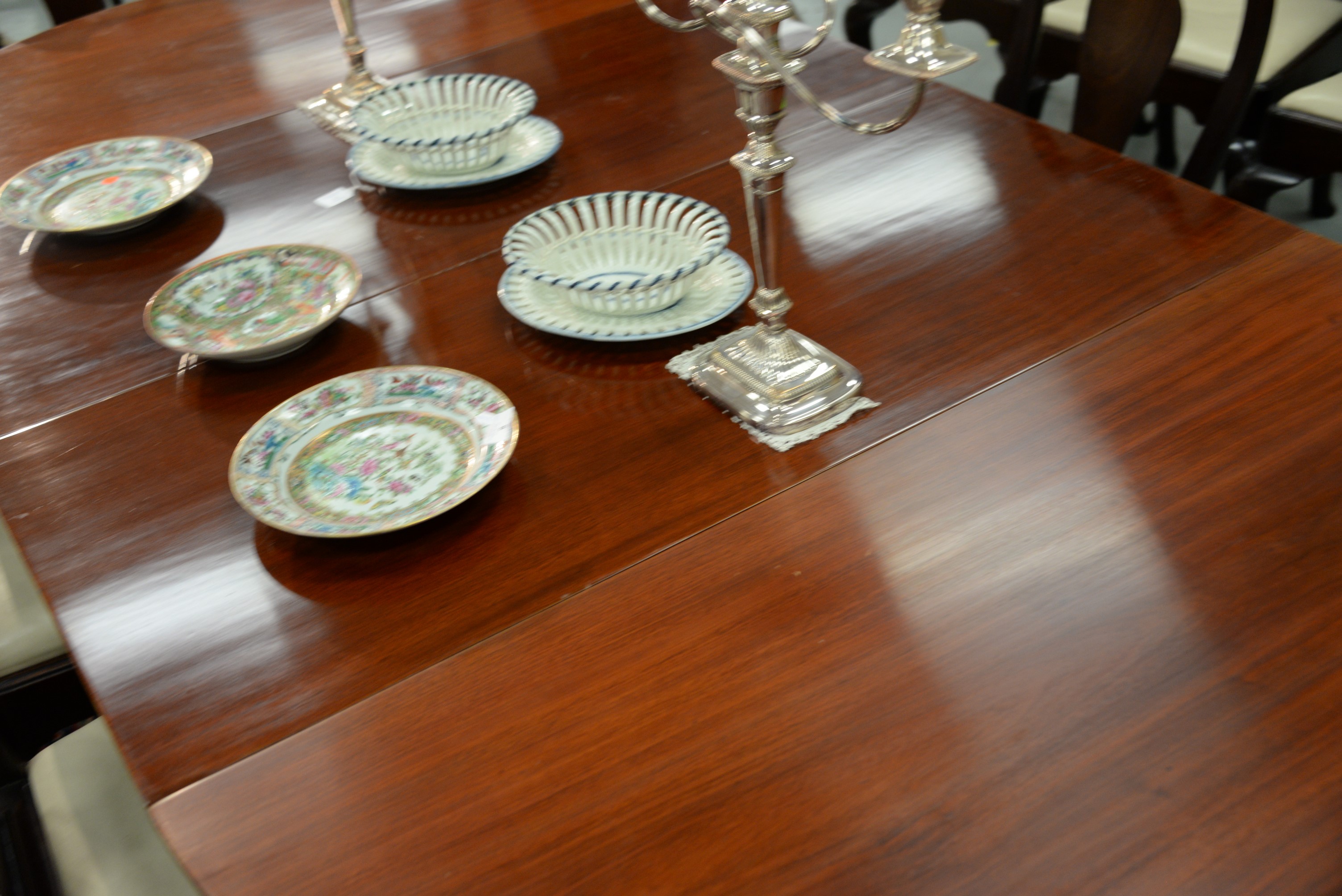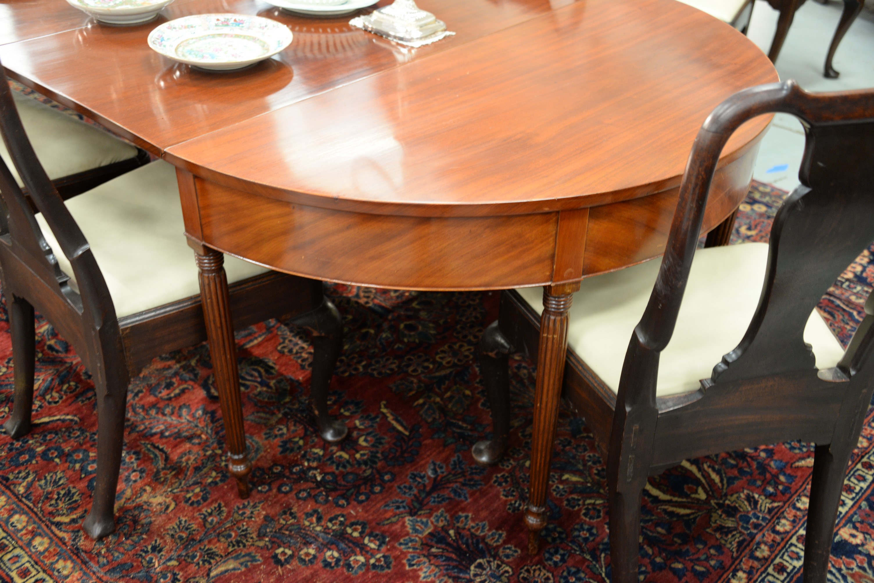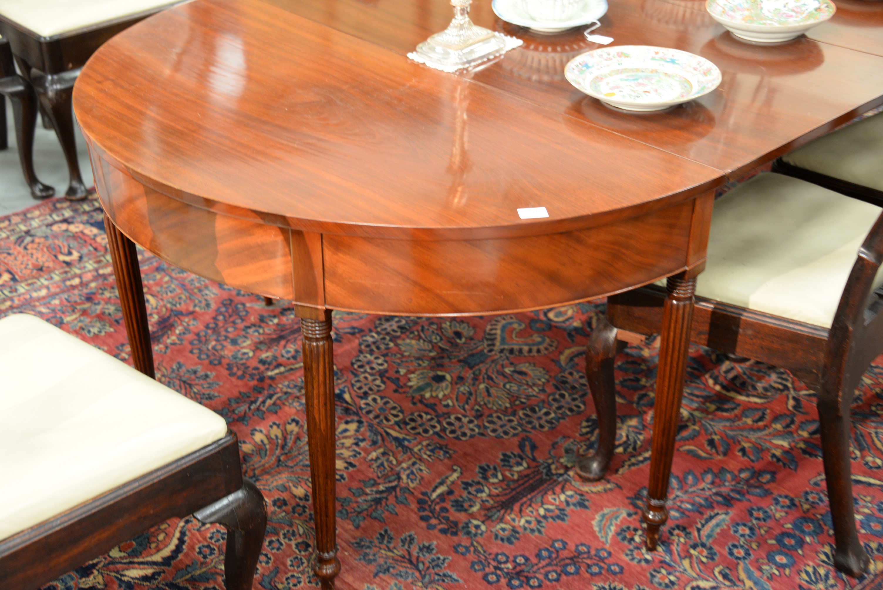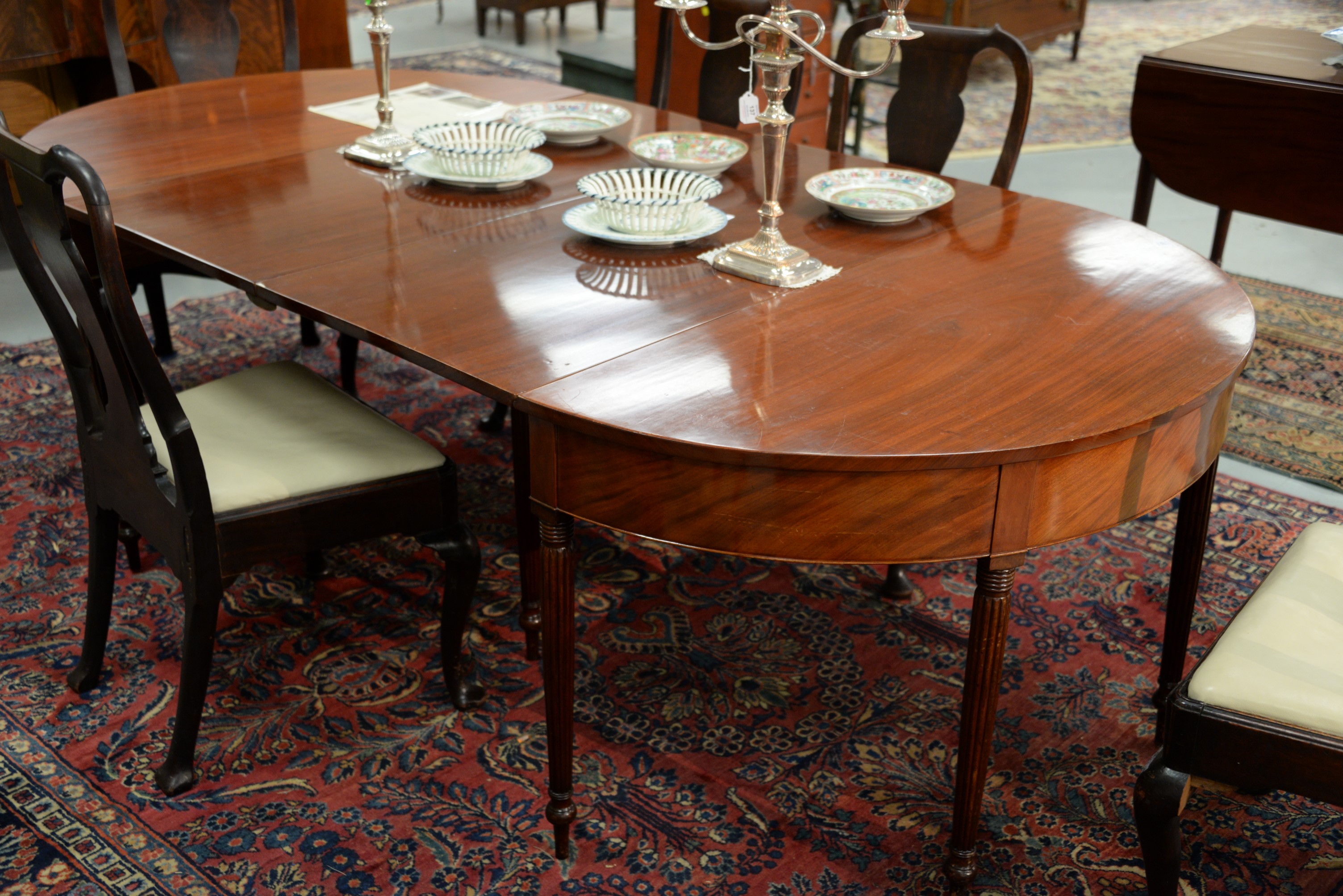 Lot 231: Sheraton two part dining table, each part with oval ends and five fluted legs, circa 1830. ht. 29 in. wd. 48 in. closed: dp. 23…